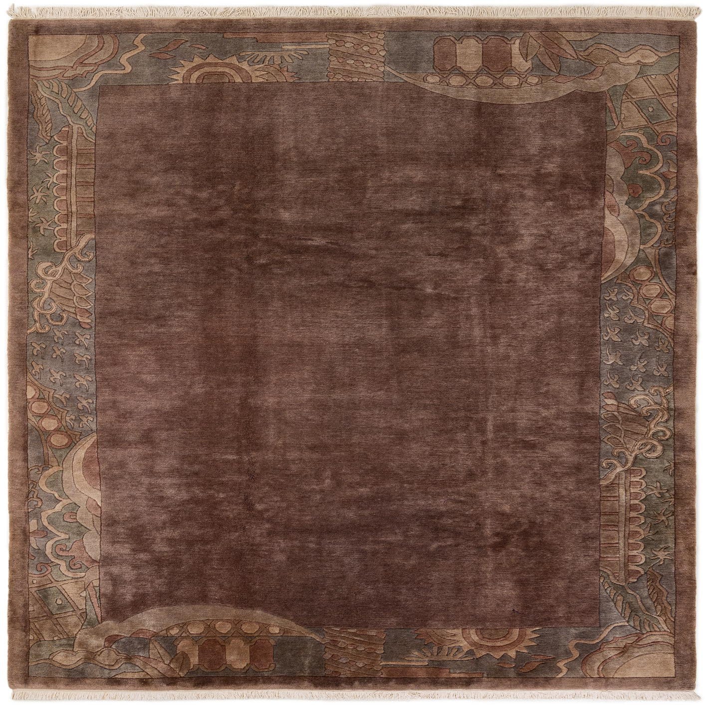 A rectangular 8x11 brown modern wool rug with an abstract oriental border in tans and blues.