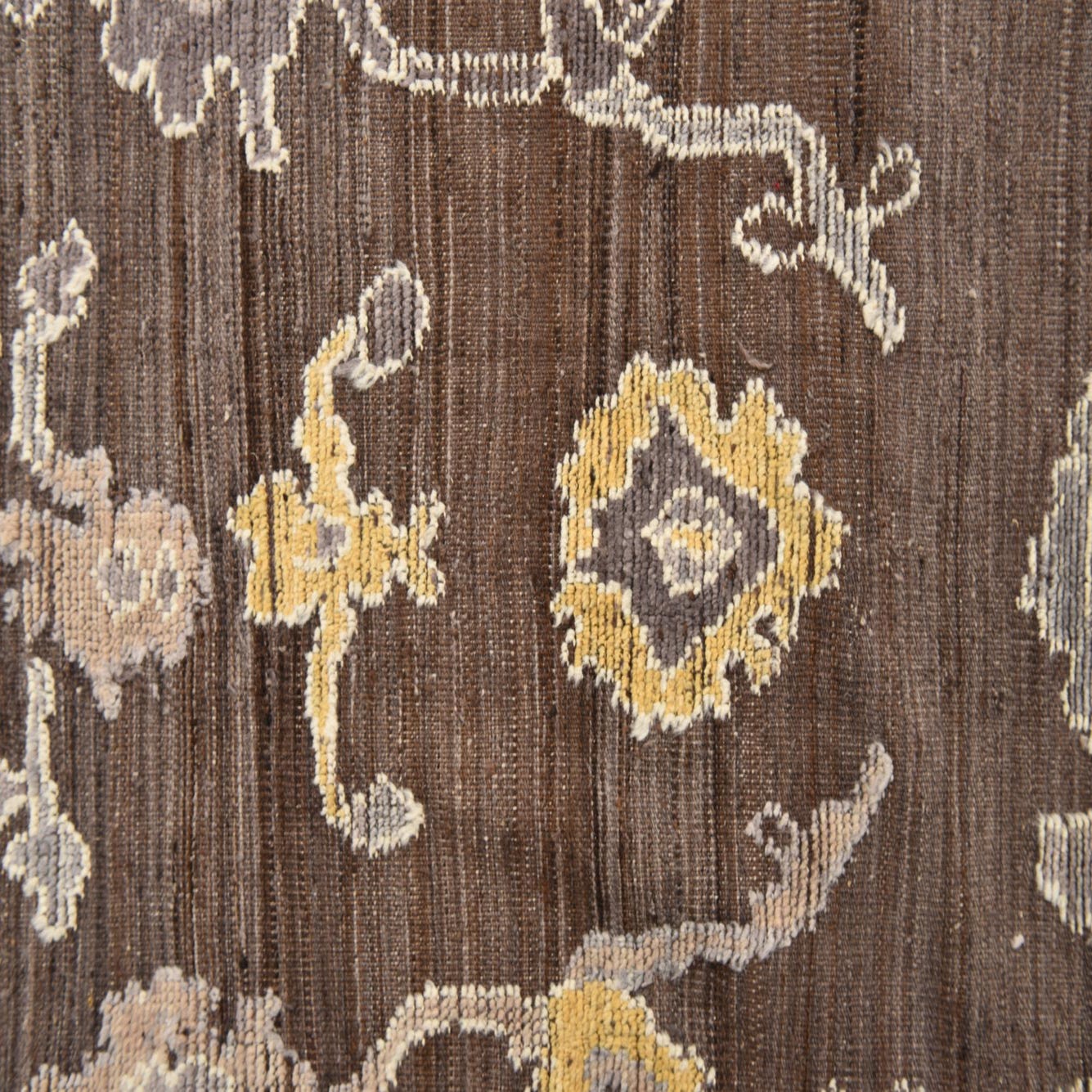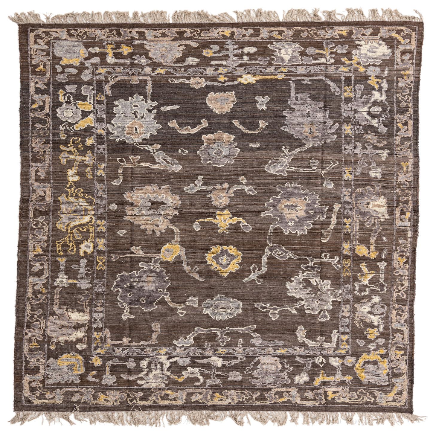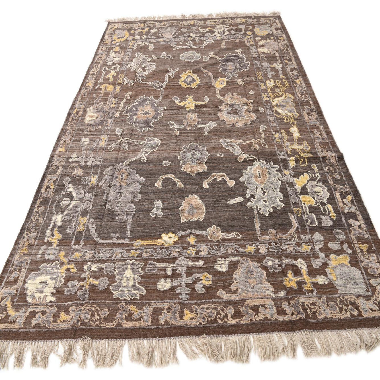 A rectangular 8x11 Oushak rug in brown, tan, and grey with a modern floral pattern and fringe.