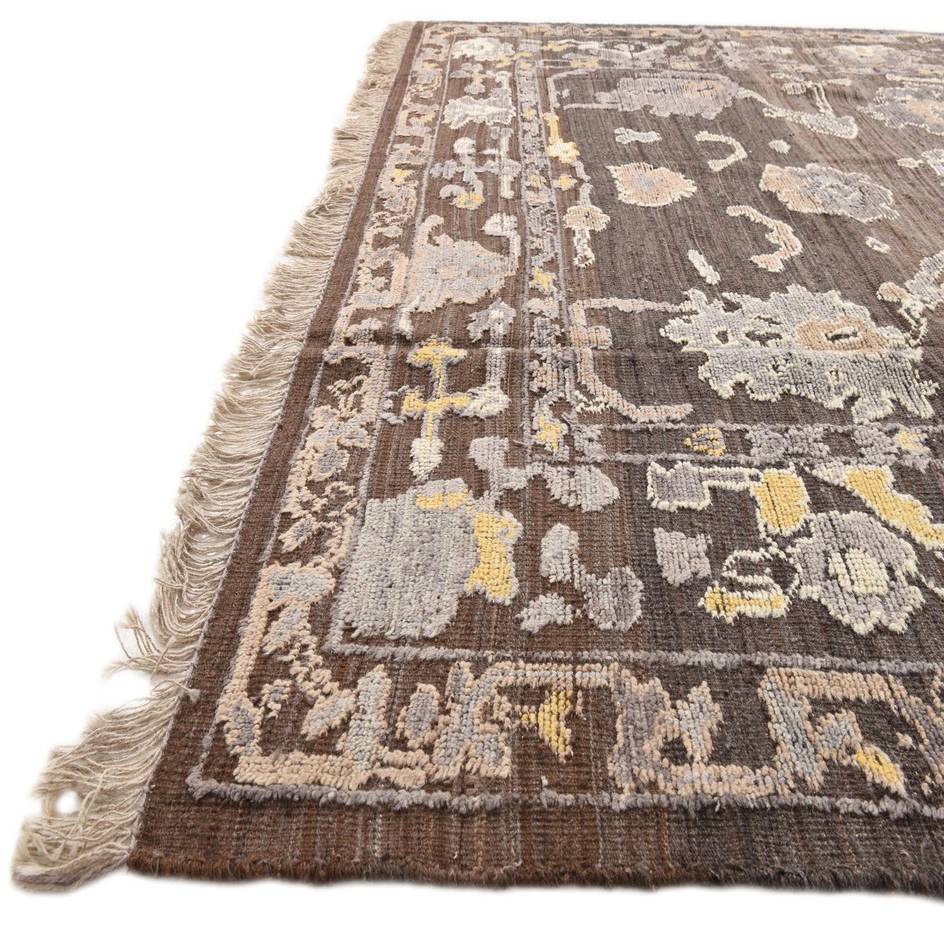This Oushak collection rug, sized at 8x11, is meticulously hand-knotted from 100% wool, ensuring both durability and a tactile comfort underfoot. The rug's rich brown background is elegantly complemented by a traditional pattern showcasing hues of ivory, light brown, yellow, and gray. The intricate design, interweaving floral and geometric elements, is a testament to its craftsmanship and timeless appeal.