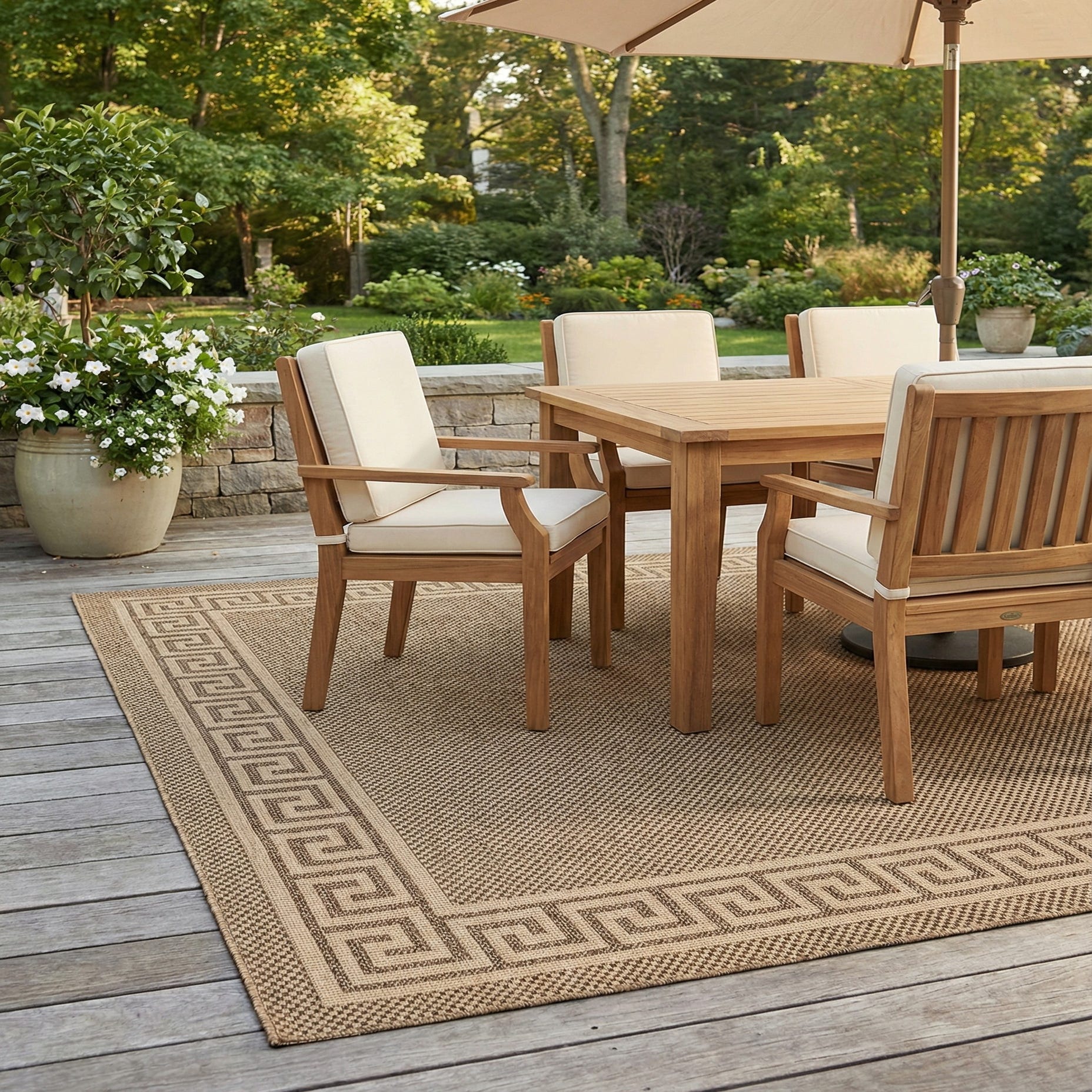 An 8x11 rectangular indoor/outdoor rug in shades of brown and tan, featuring a woven texture and a Greek key border pattern.