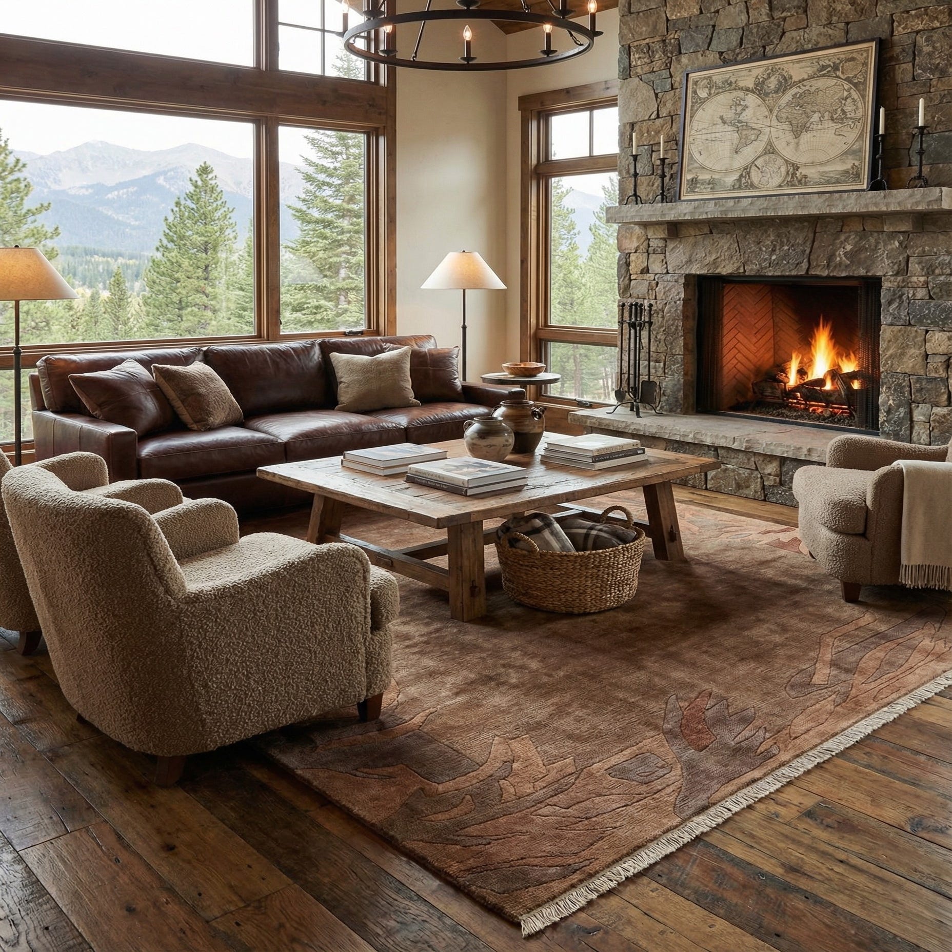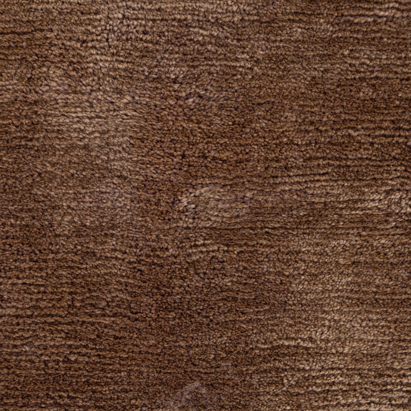 An 8x11 rectangular brown wool area rug with a modern abstract border design in varying shades of brown and tan.