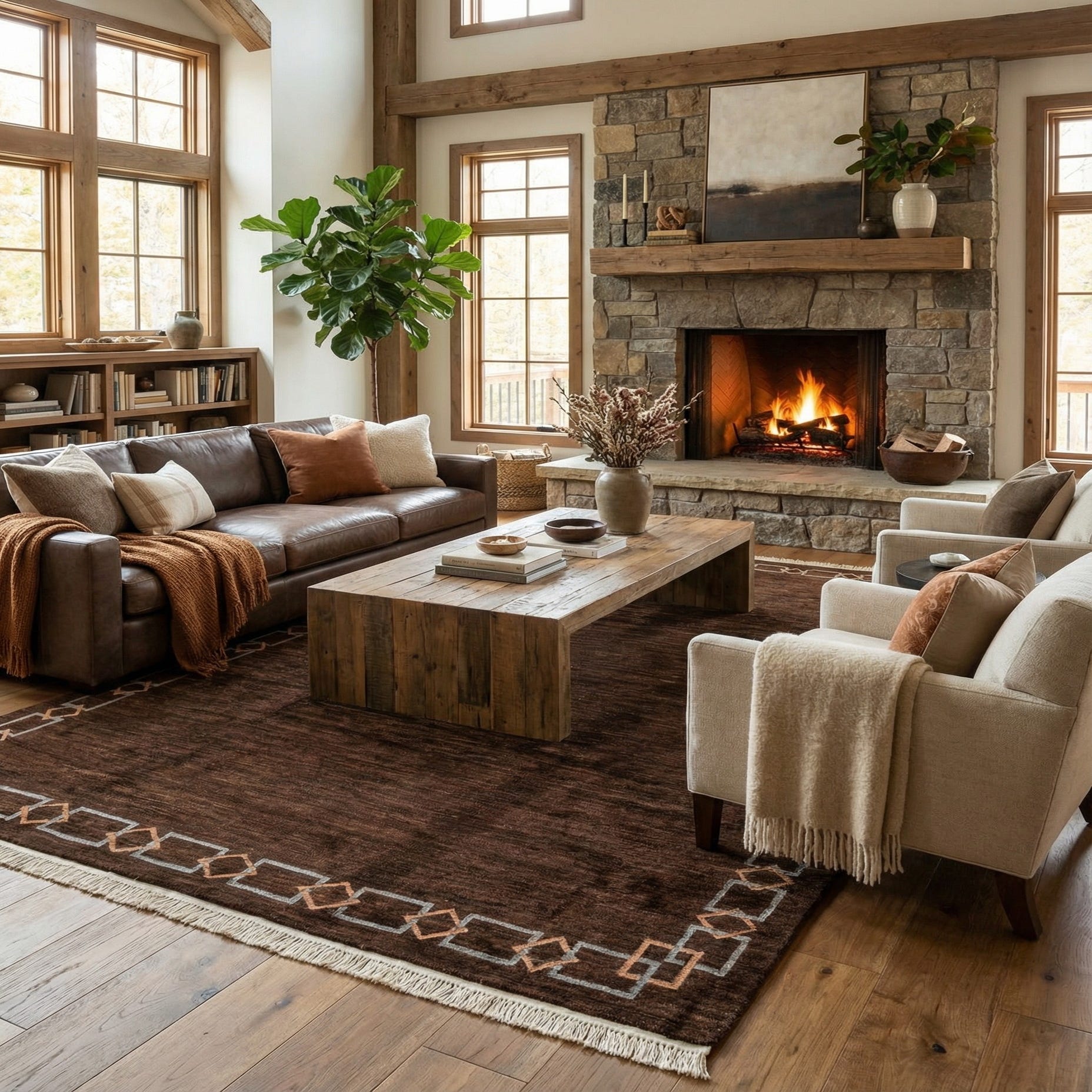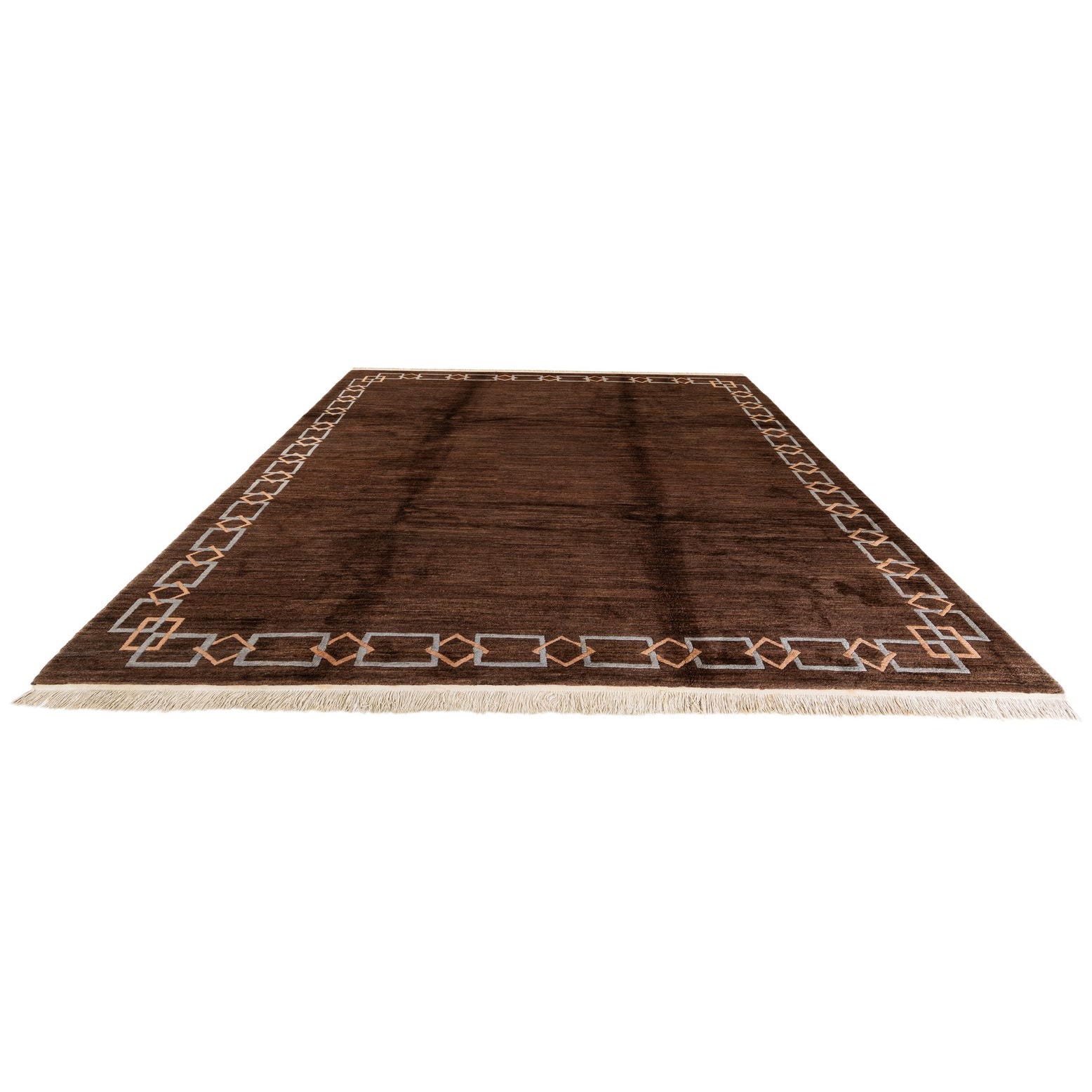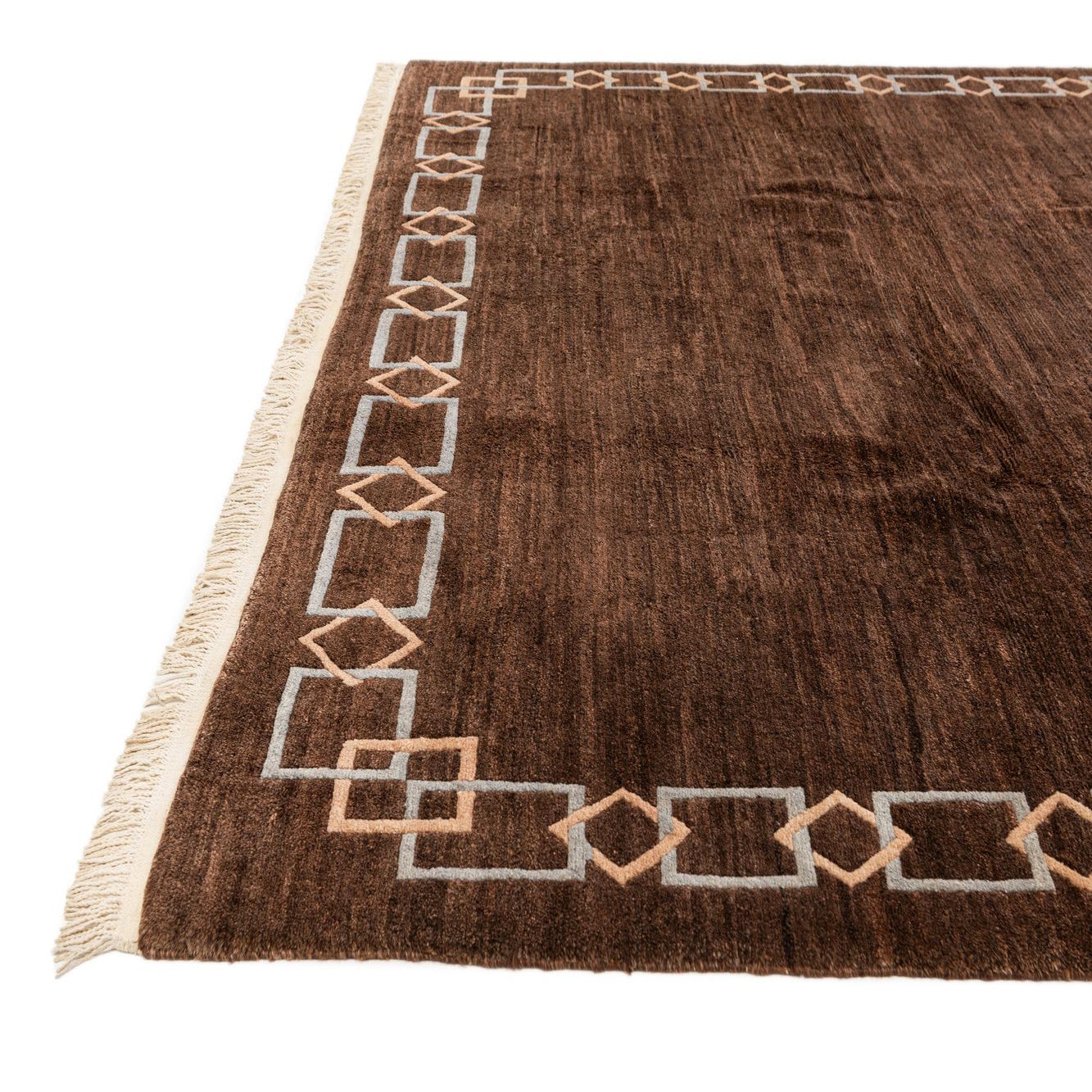 A rectangular 8x11 brown modern wool rug with a light brown and grey interlocking geometric border, suitable for a living room.