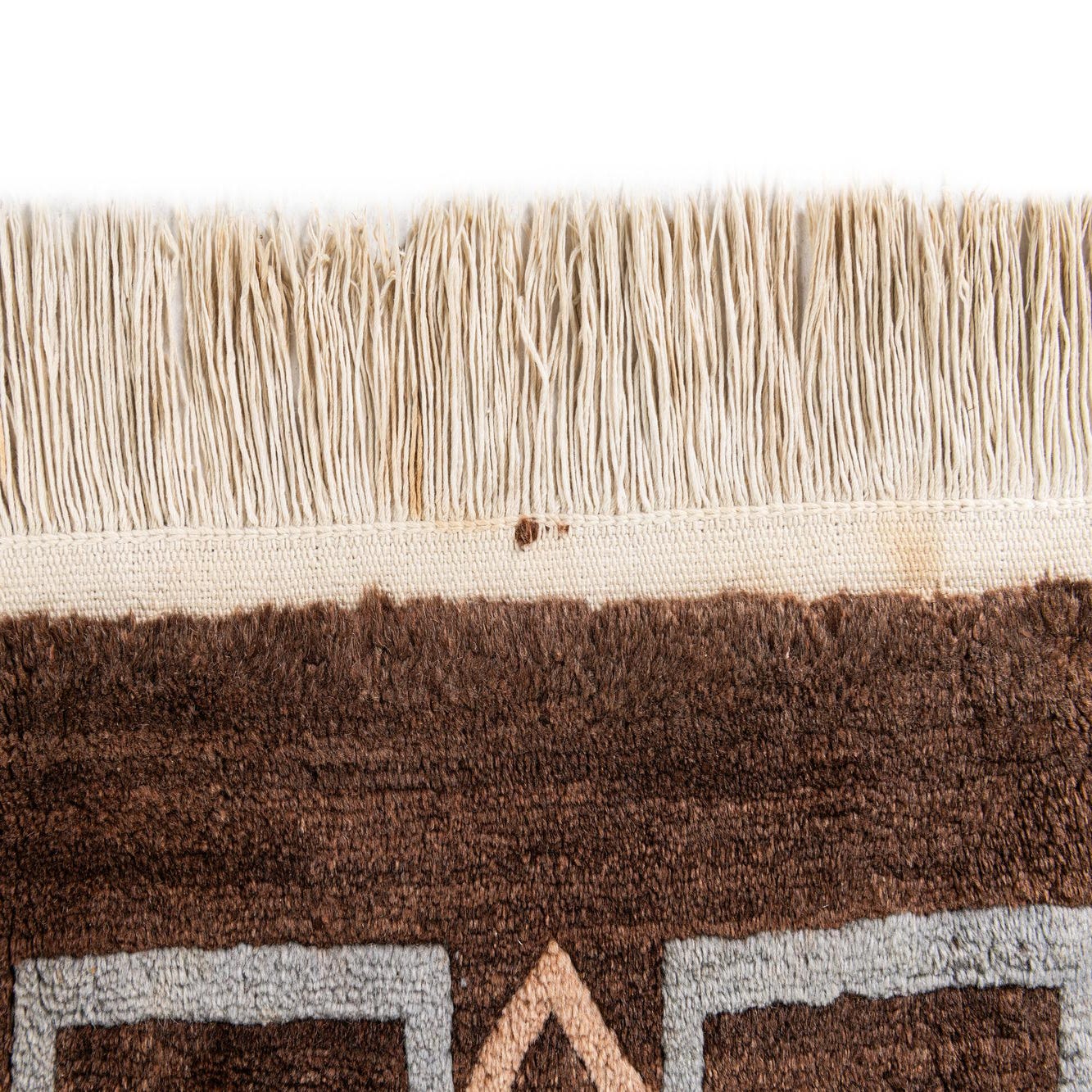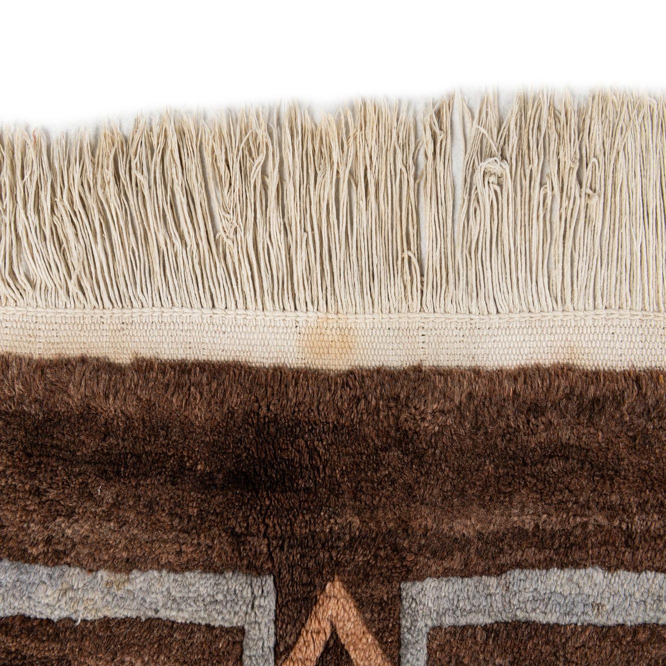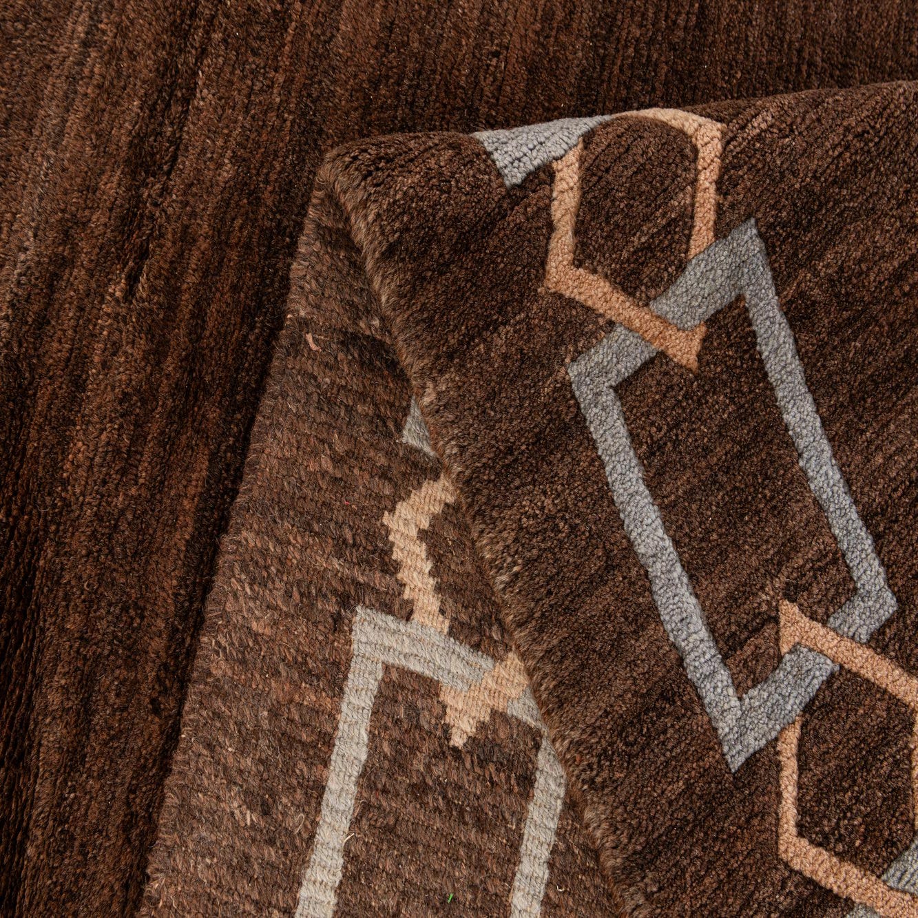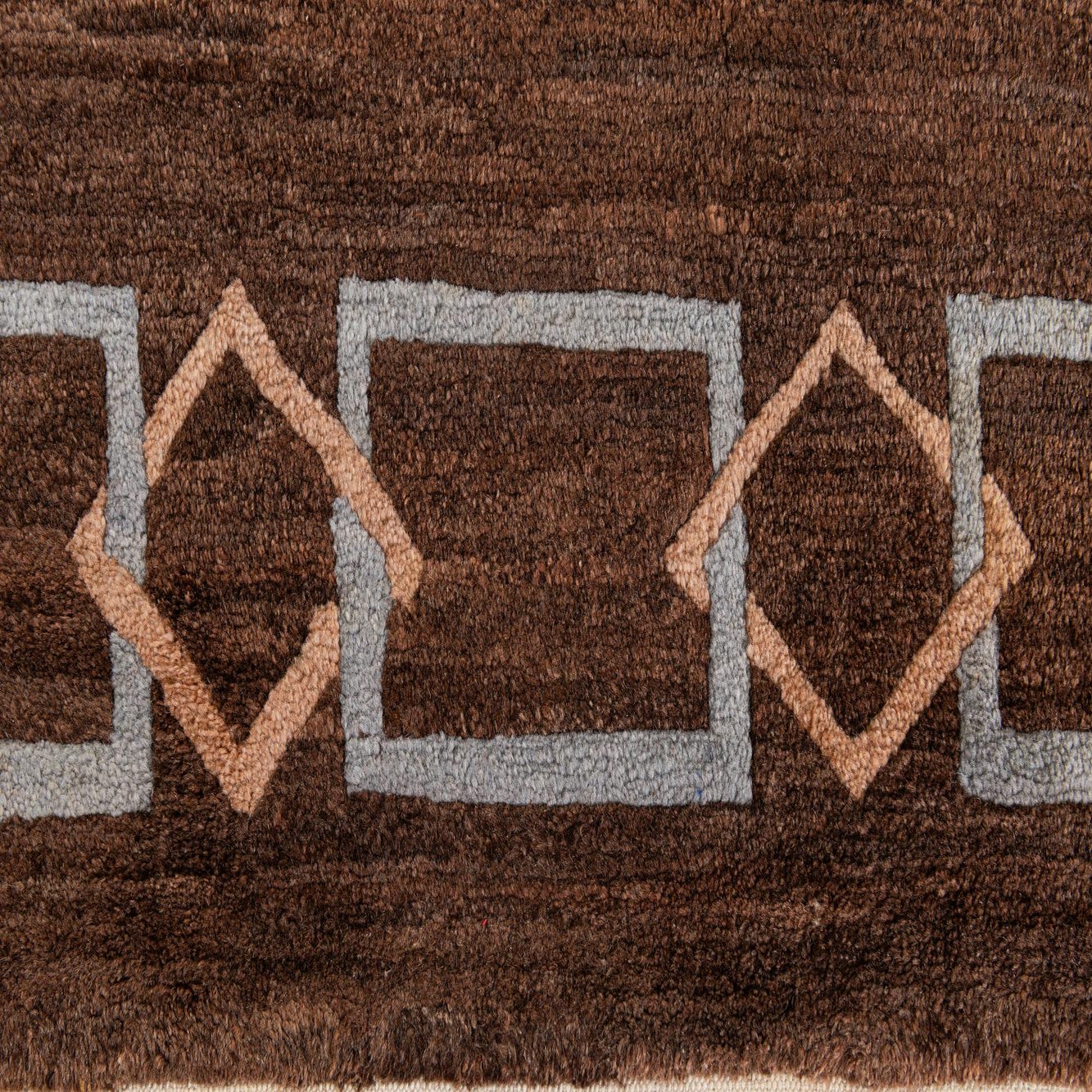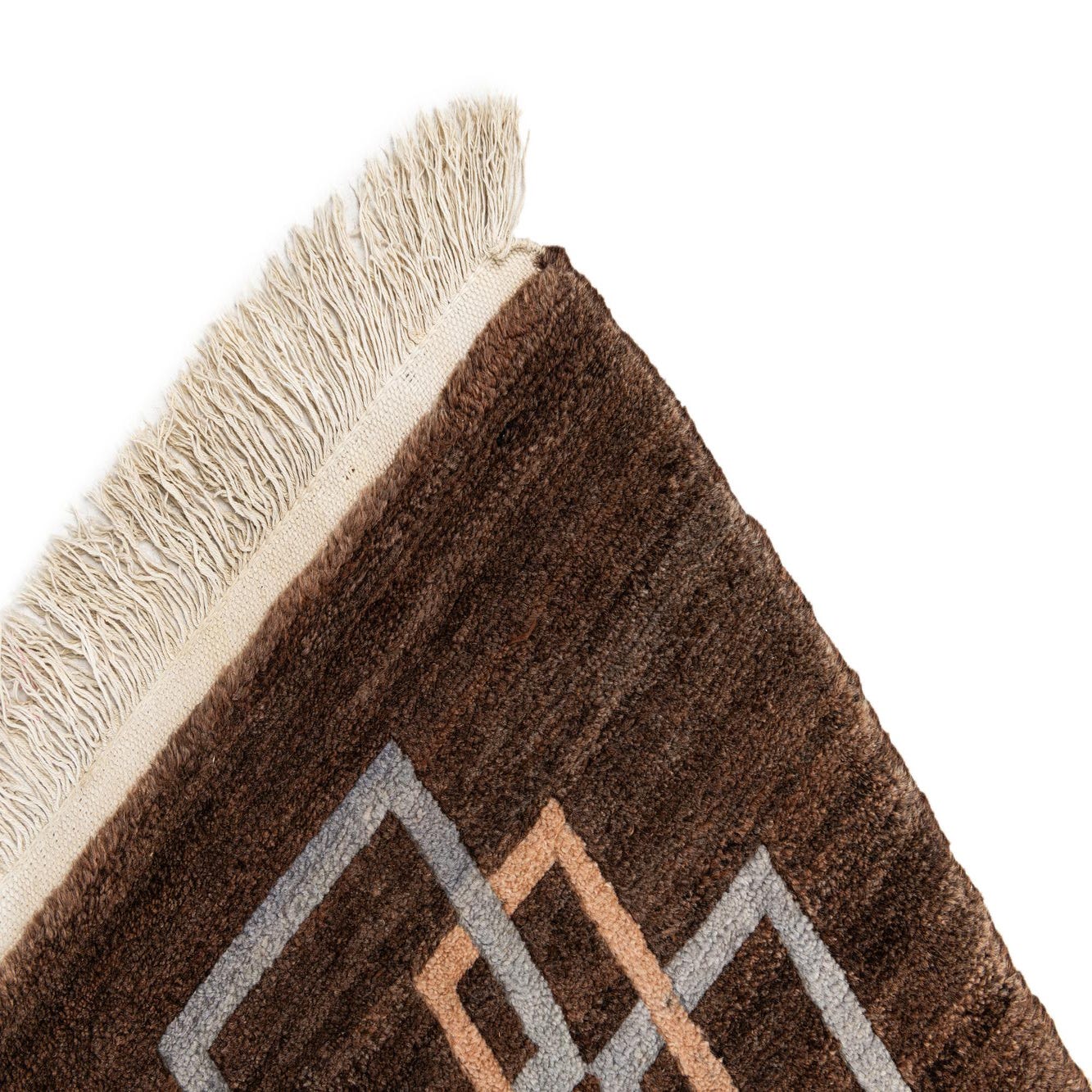 Primary color is Brown. Colors in this rug include: Brown, Gray, Peach.