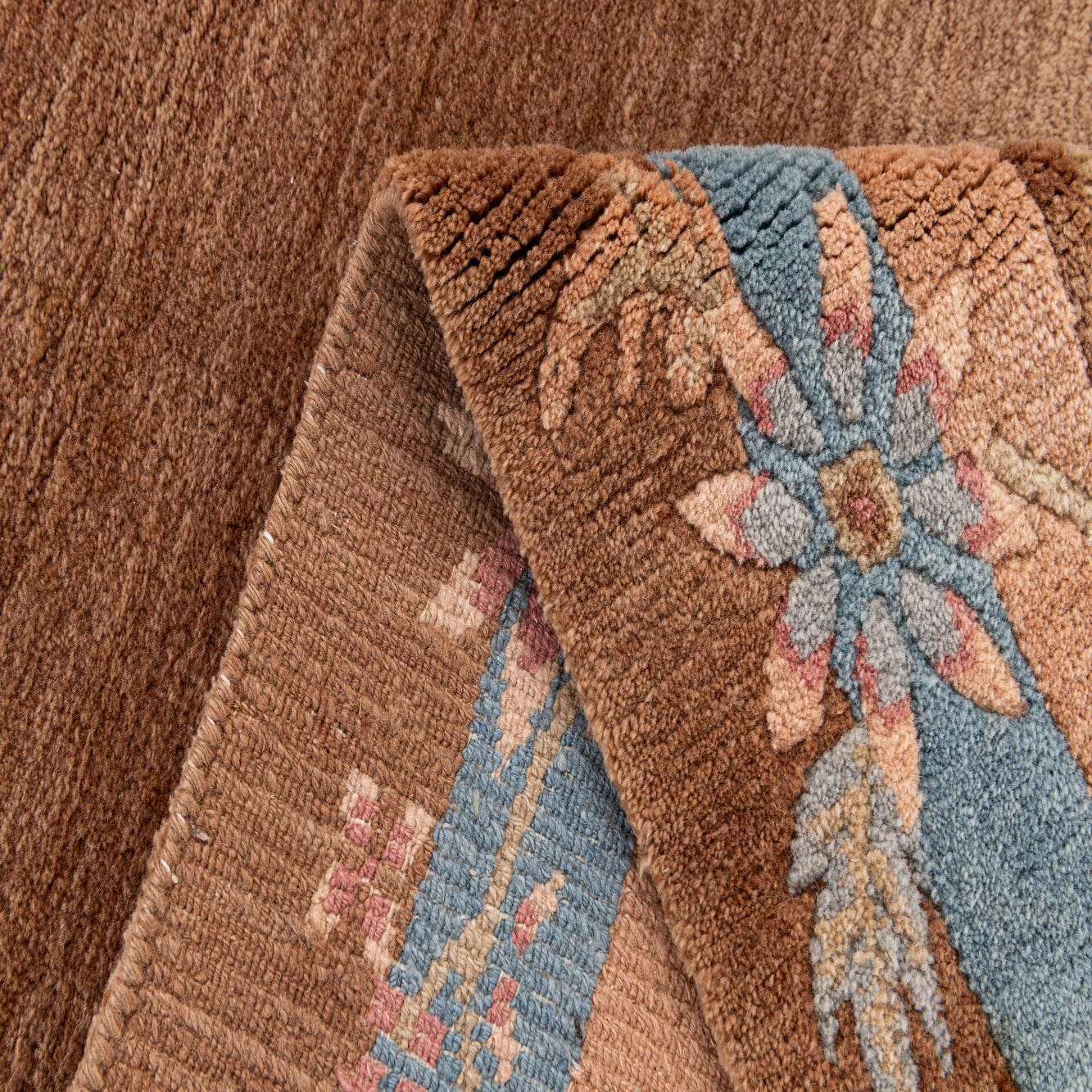 Primary color is Brown. Colors in this rug include: Brown, Blue, Pink.