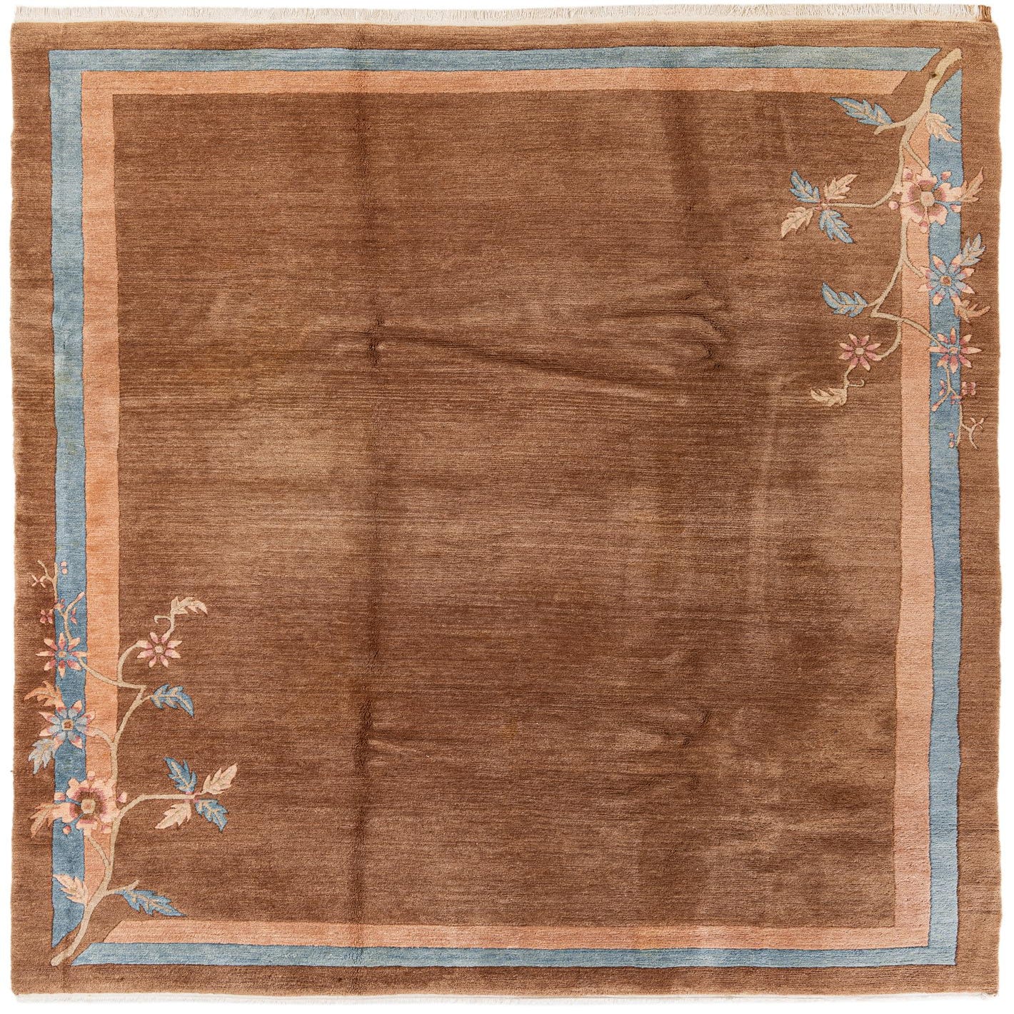 A rectangular 8x11 brown wool area rug with a light blue and tan border, featuring delicate floral patterns in the corners.