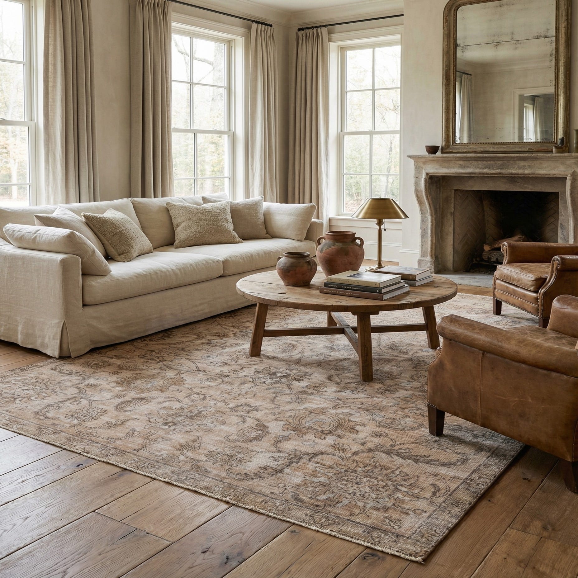This piece is well-suited to living rooms as an anchor beneath seating, under a dining table to add layered warmth, or in a bedroom to introduce texture against wood flooring. It pairs naturally with leather sofas, linen upholstery, warm woods, and matte black metal accents, and complements transitional, traditional, or farmhouse interiors that favor muted, layered color.