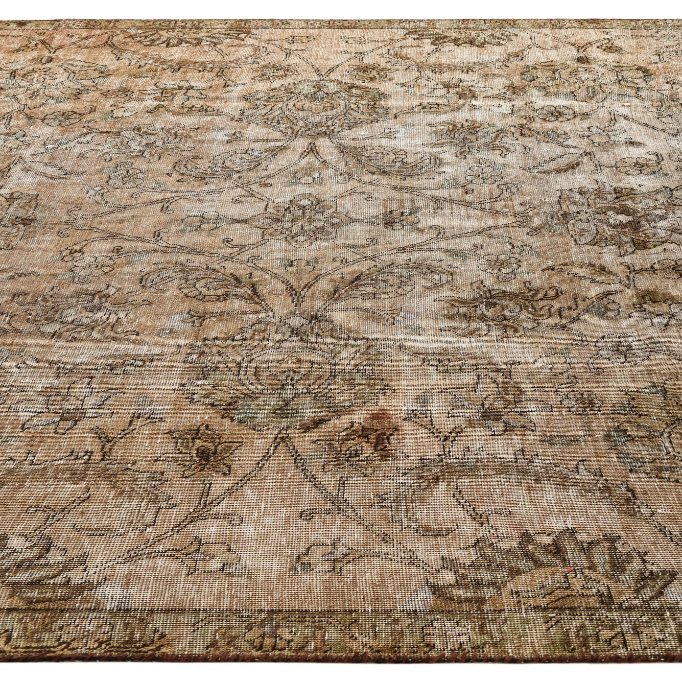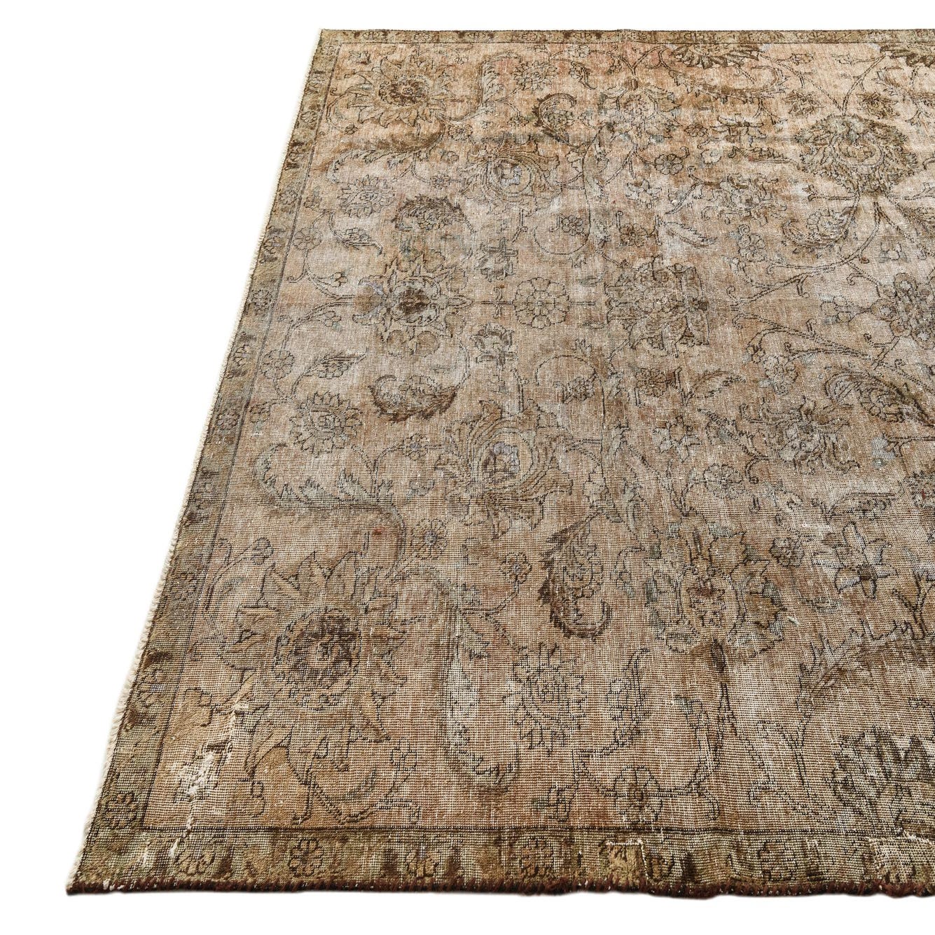 A soft, low-profile pile highlights an all-over floral and vine motif worked in a faded, vintage palette. The brown field provides a warm base while beige highlights and fine black outlining define stylized blossoms and scrolling arabesques for a lived-in, heirloom look. Hand-knotted in 100% wool, the surface feels dense and slightly plush underfoot with a natural, matte luster and subtle variations in tone that emphasize the rug’s distressed character.