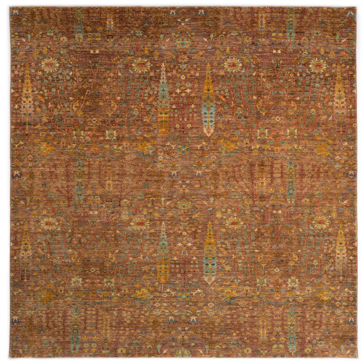 Its size and visual gravity make it an excellent anchor for a living or dining room. The rug's warm brown base and lively accents enable it to complement interiors with natural wood finishes, or to add depth to a more neutrally-decorated space. Similarly, its classic design elements allow it to seamlessly integrate with traditional decor while the subtle variation in tones could provide a counterpoint in a more contemporary setting, lending warmth and character to the modern home.