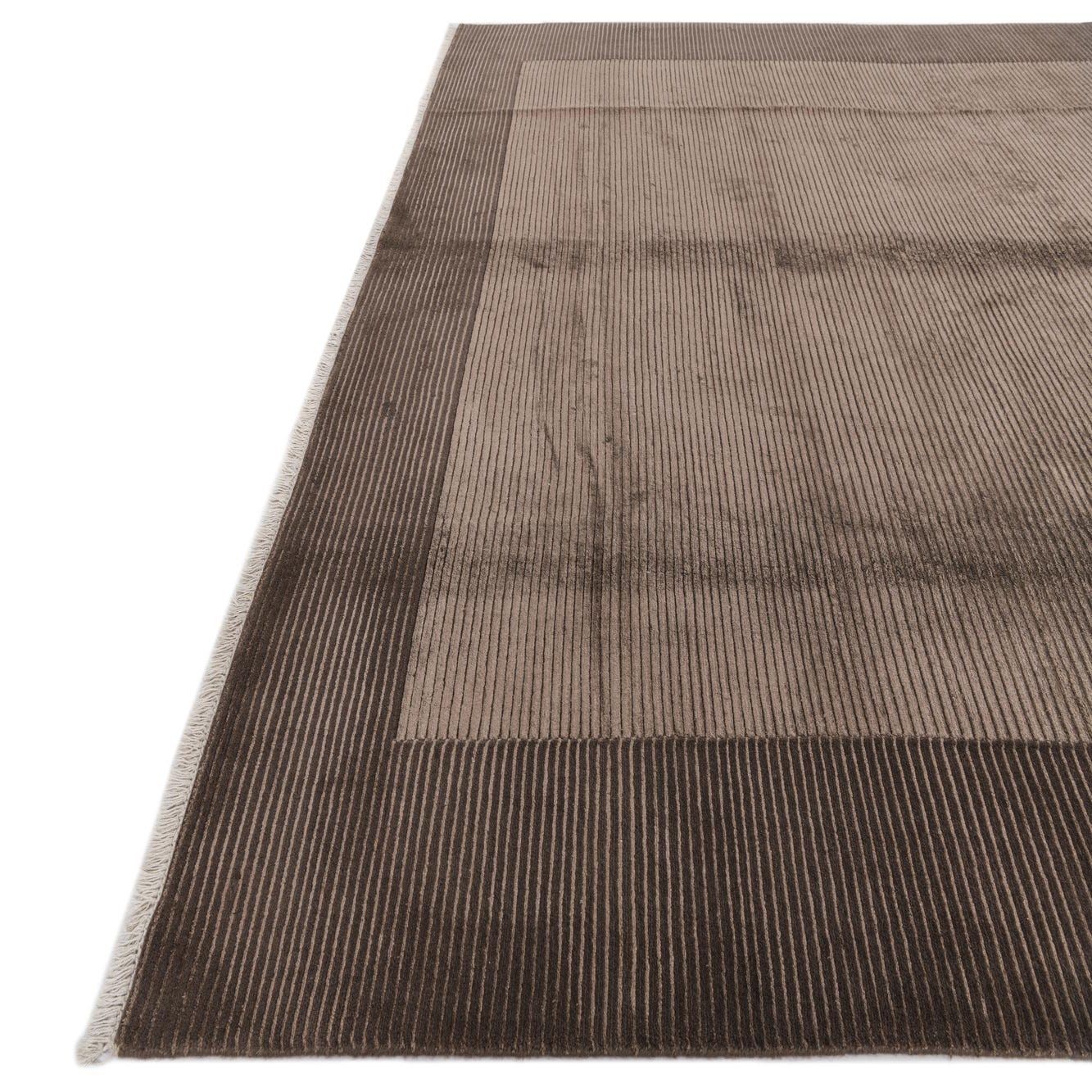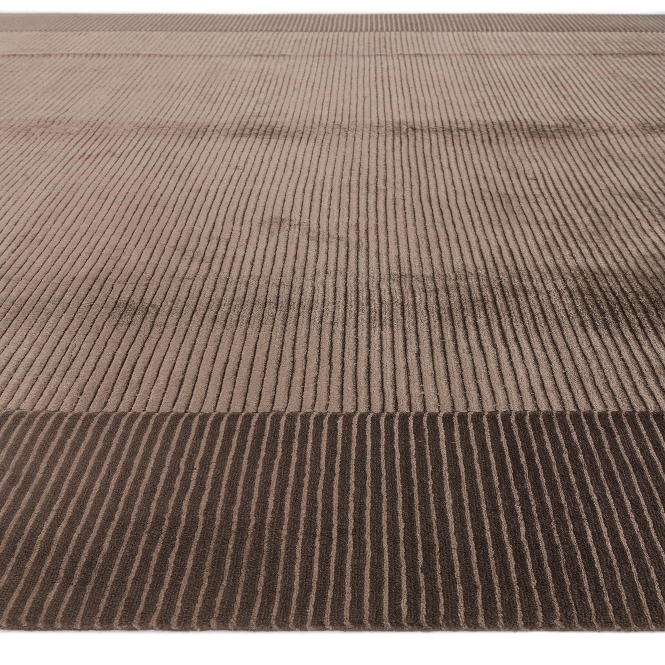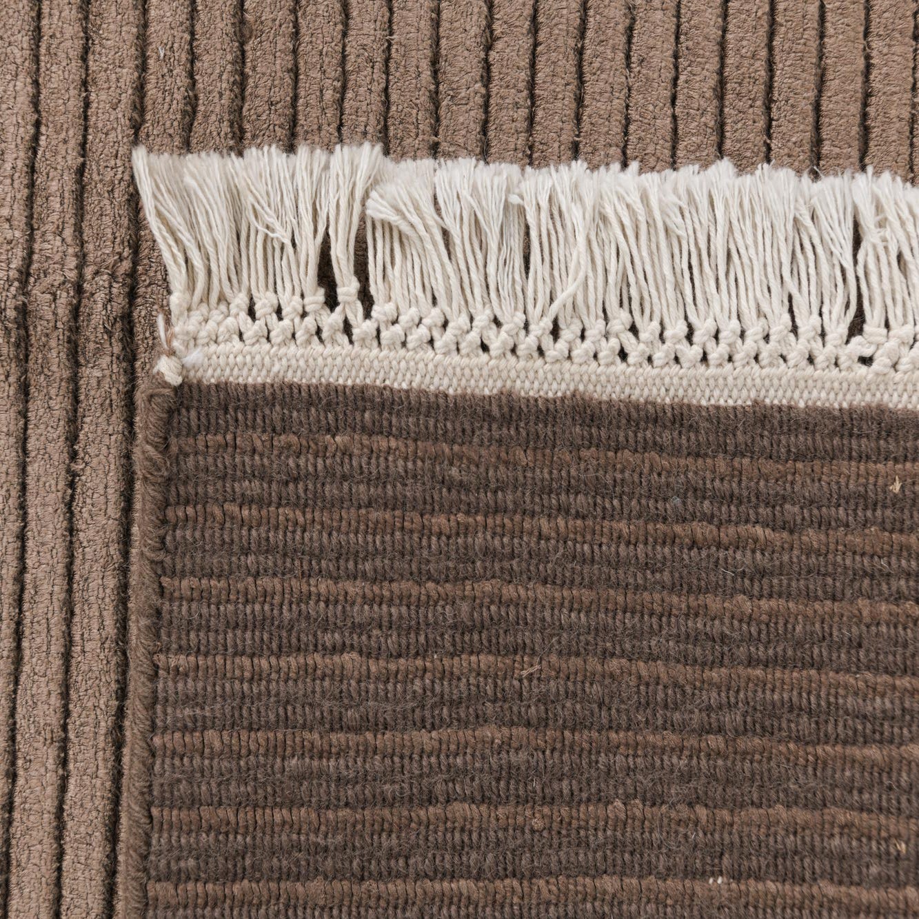 A rectangular 8x12 brown and tan modern wool rug with a subtle striped pattern and dark border.