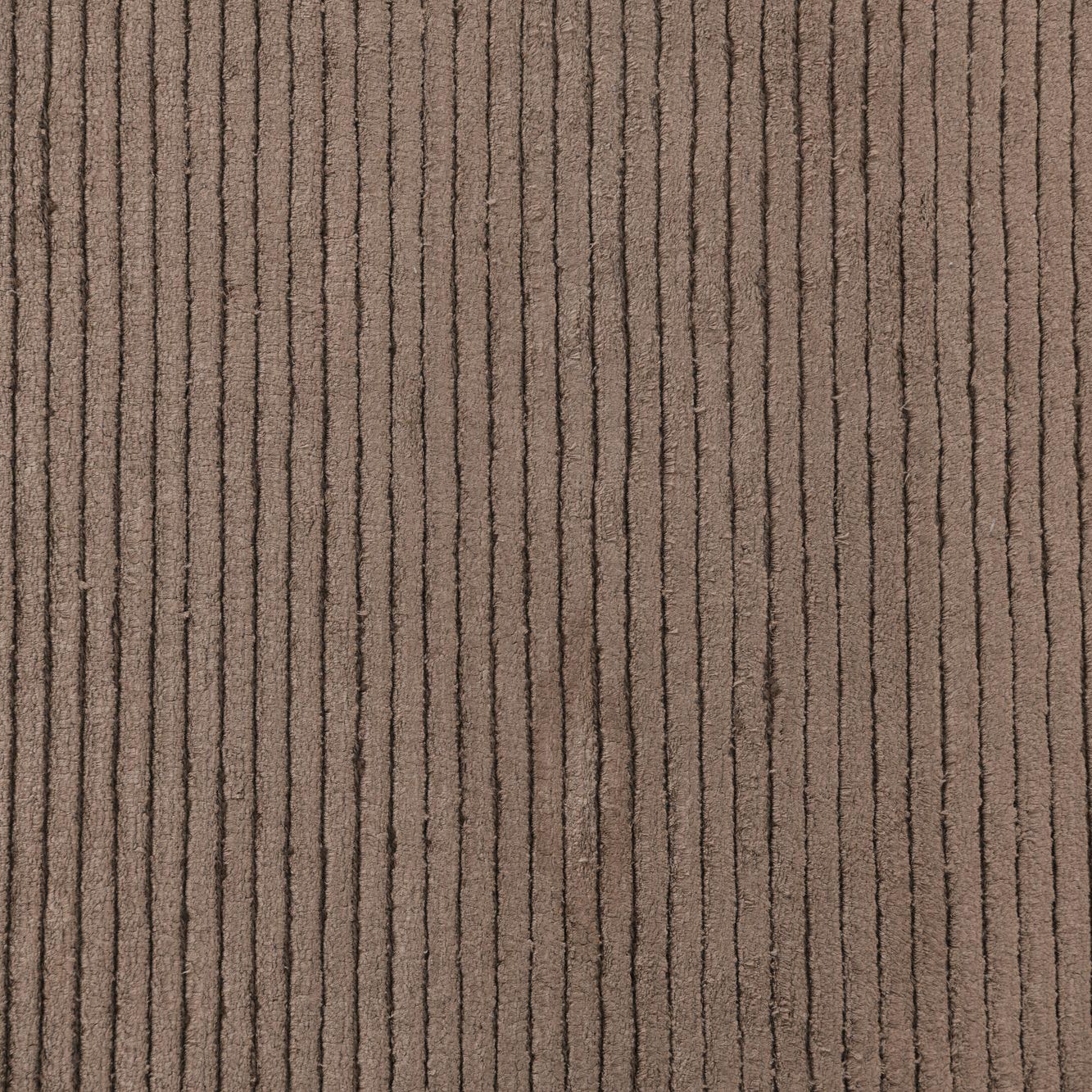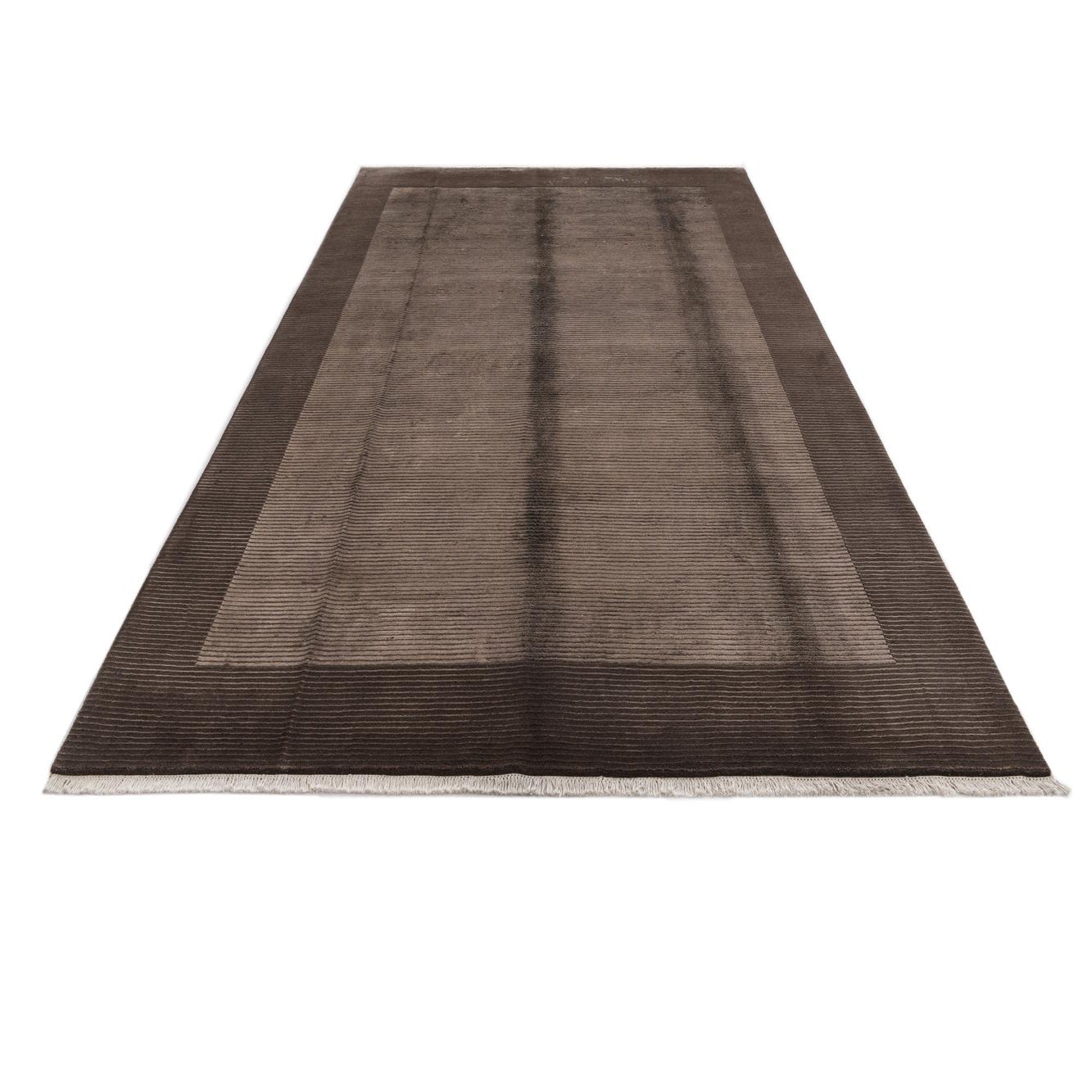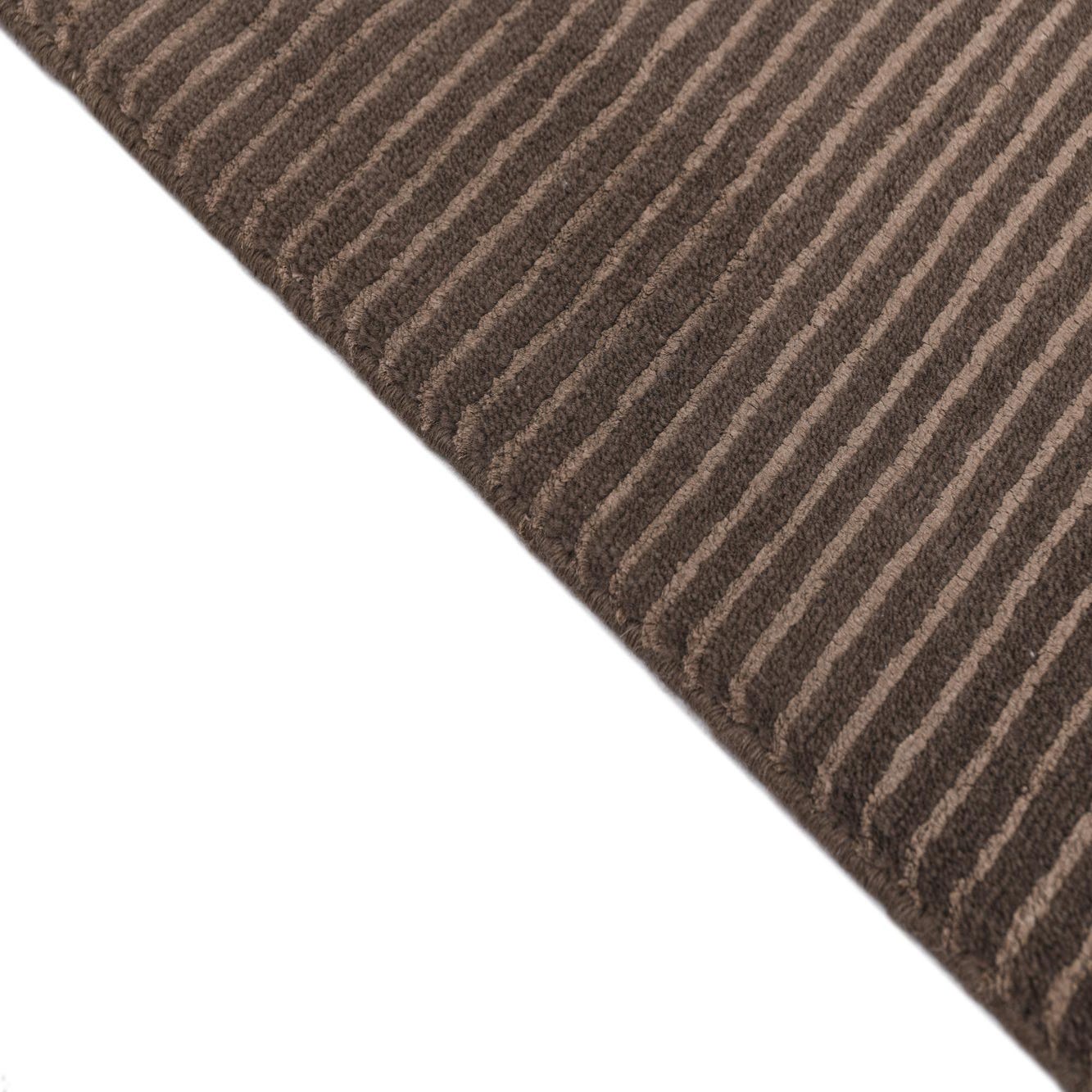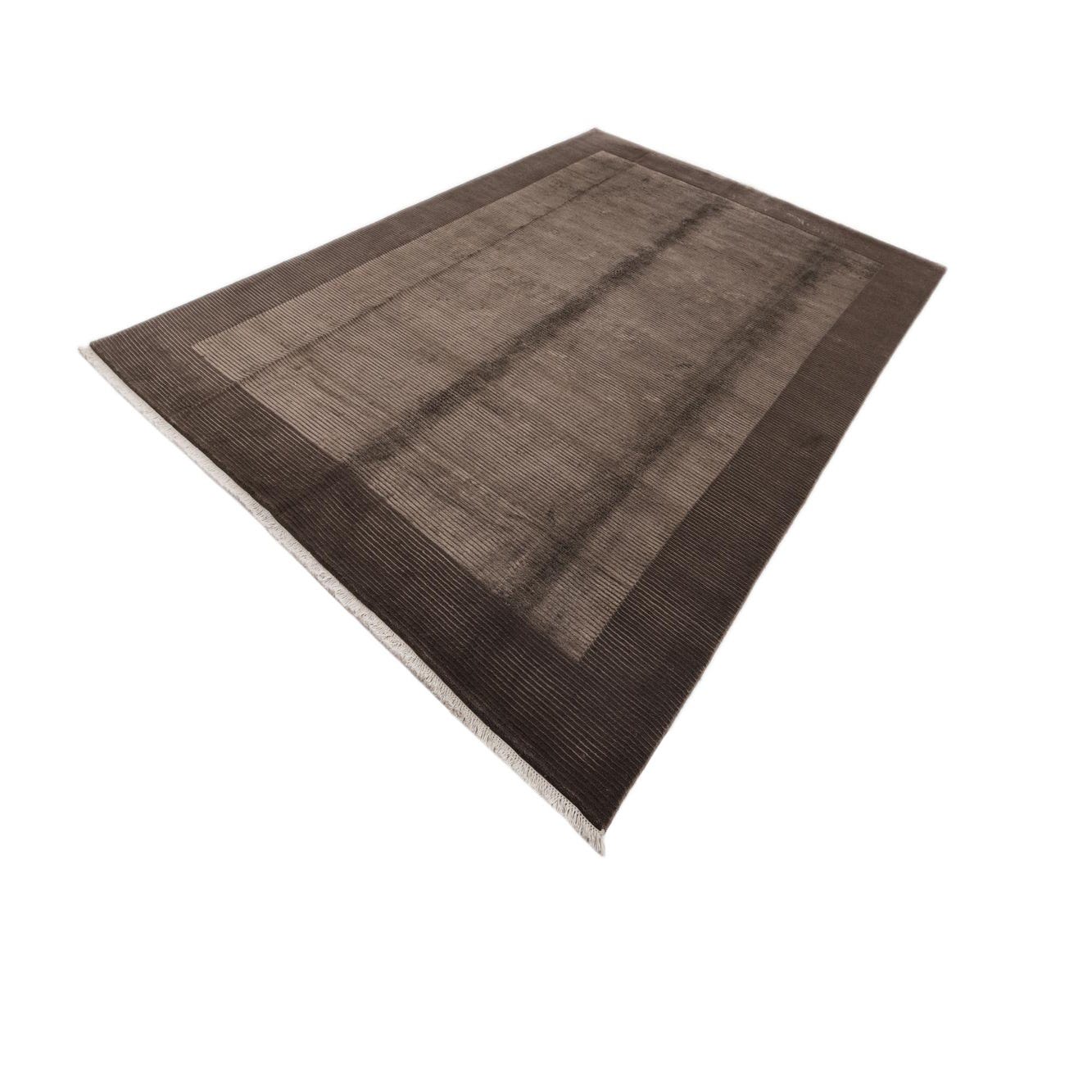 A rectangular 8x12 brown and tan modern wool rug with a subtle striped pattern and dark border.