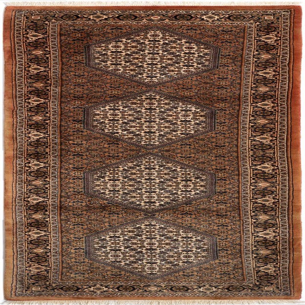 The Bidjar collection offers a 9 Ft Runner hand-knotted rug crafted from 100% wool, presenting a dense texture that is plush to the touch. This runner features a series of large central medallions in a symmetrical layout, surrounded by intricate floral motifs and angular vine scrolls. The primary background color of rich brown is complemented by a harmonious palette that includes shades of beige, black, and hints of terracotta, creating a visual warmth and sophistication.