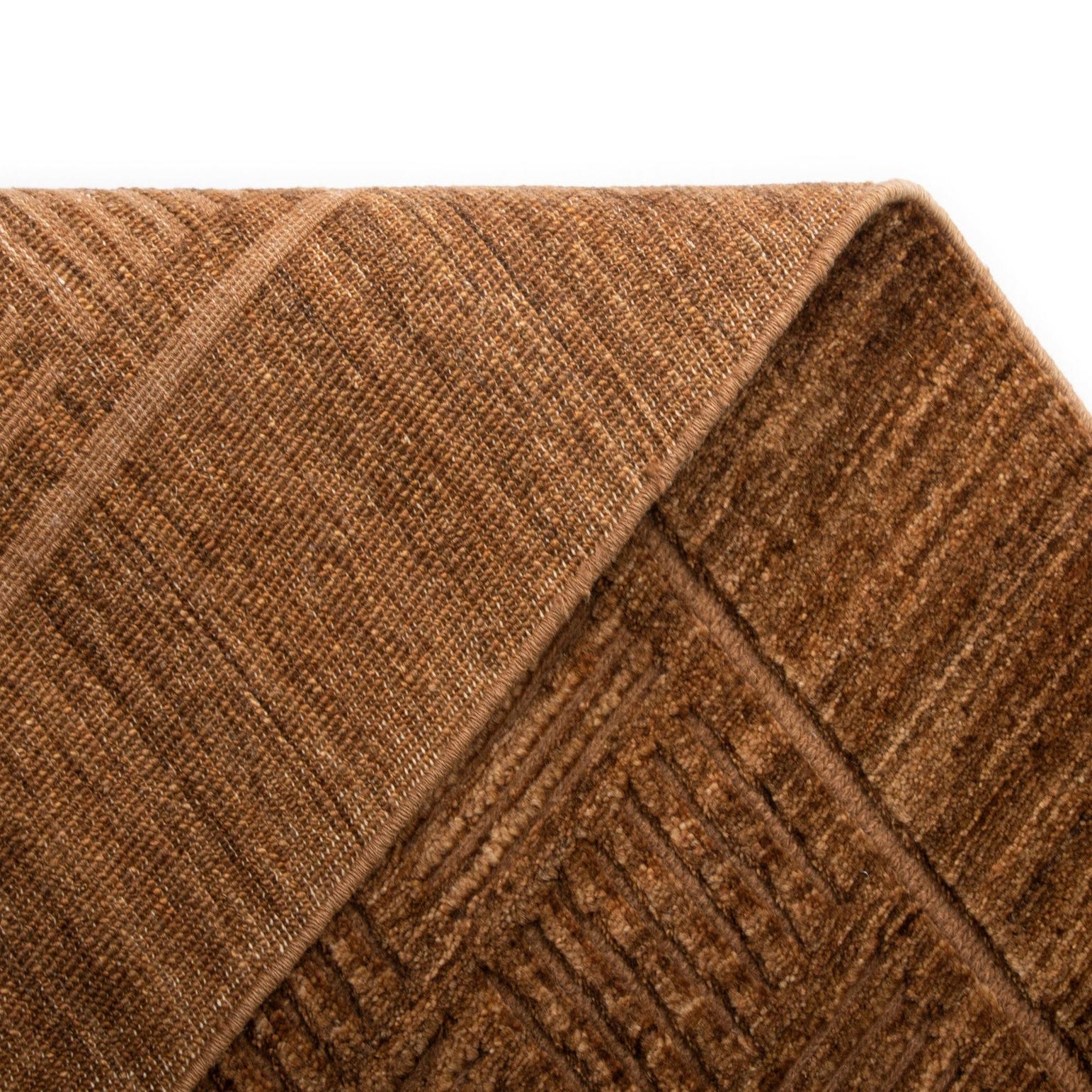 The Juma collection presents a sophisticated 9 ft runner rug, handcrafted from 100% wool, offering both durability and comfort underfoot. Its design showcases a cohesive array of brown tones, creating a rich monochromatic aesthetic. The texture adds depth to its appearance, featuring a pattern of horizontal lines juxtaposed with vertical striations within rectangular motifs, giving a sense of structure and rhythm to the piece.