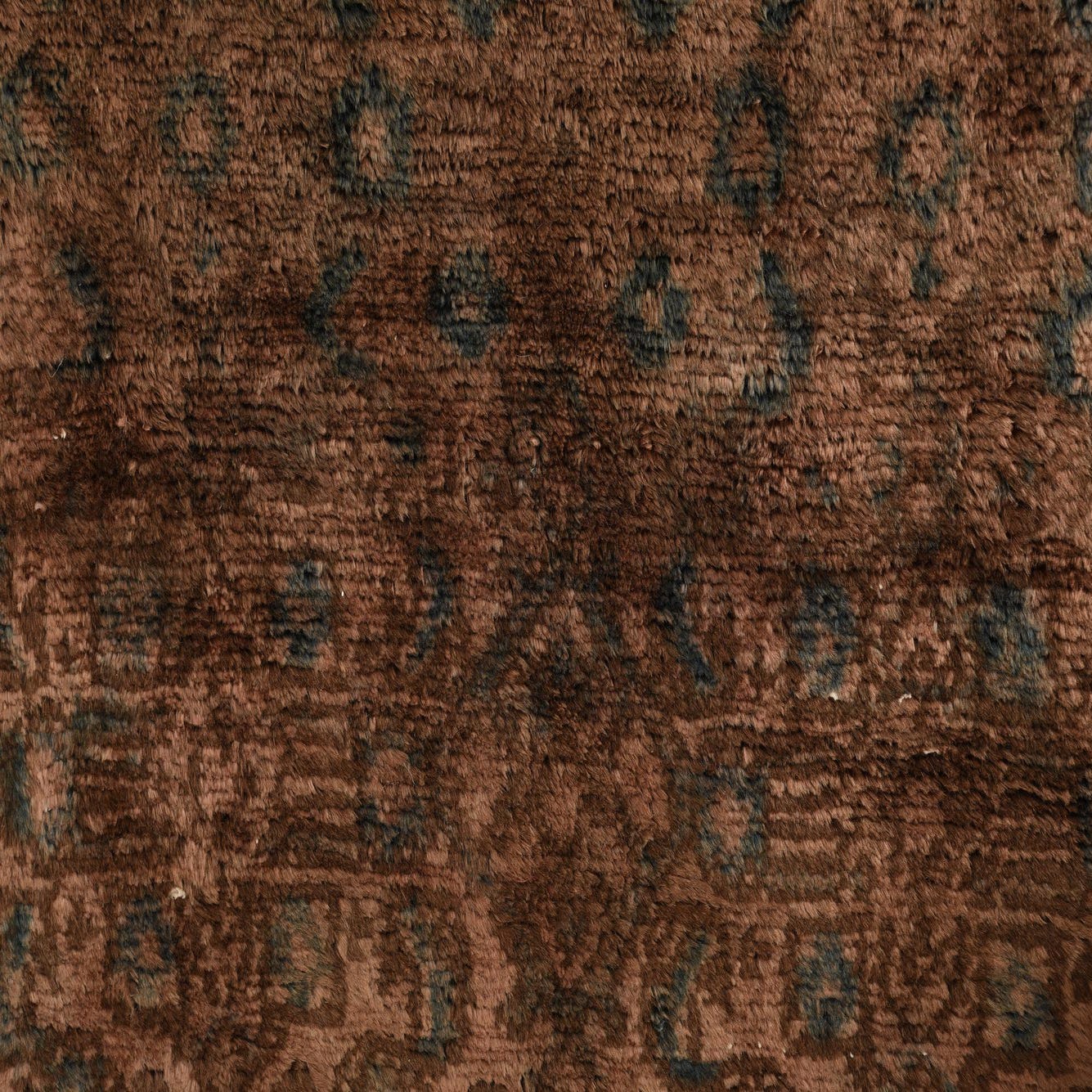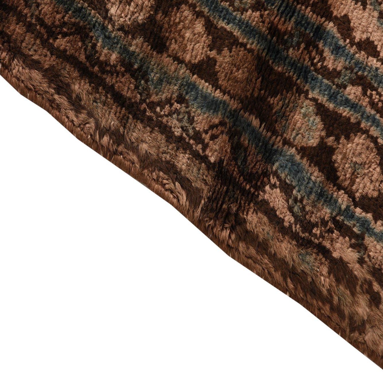 Part of the Ultra Vintage Collection, this hand-knotted 9 Ft runner is crafted from 100% wool, offering a natural texture and enduring quality. The rug exhibits a traditional pattern that creates a sense of heritage and artistry. Its brown background is interspersed with ornate motifs and structural accents in light blue, navy blue, and rust red, imbuing the piece with a sense of depth and history.