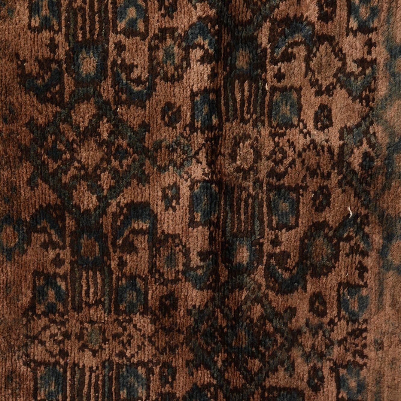 A 9 ft runner rug in browns and tans with a distressed Persian pattern in blue and brown, ideal for a hallway.
