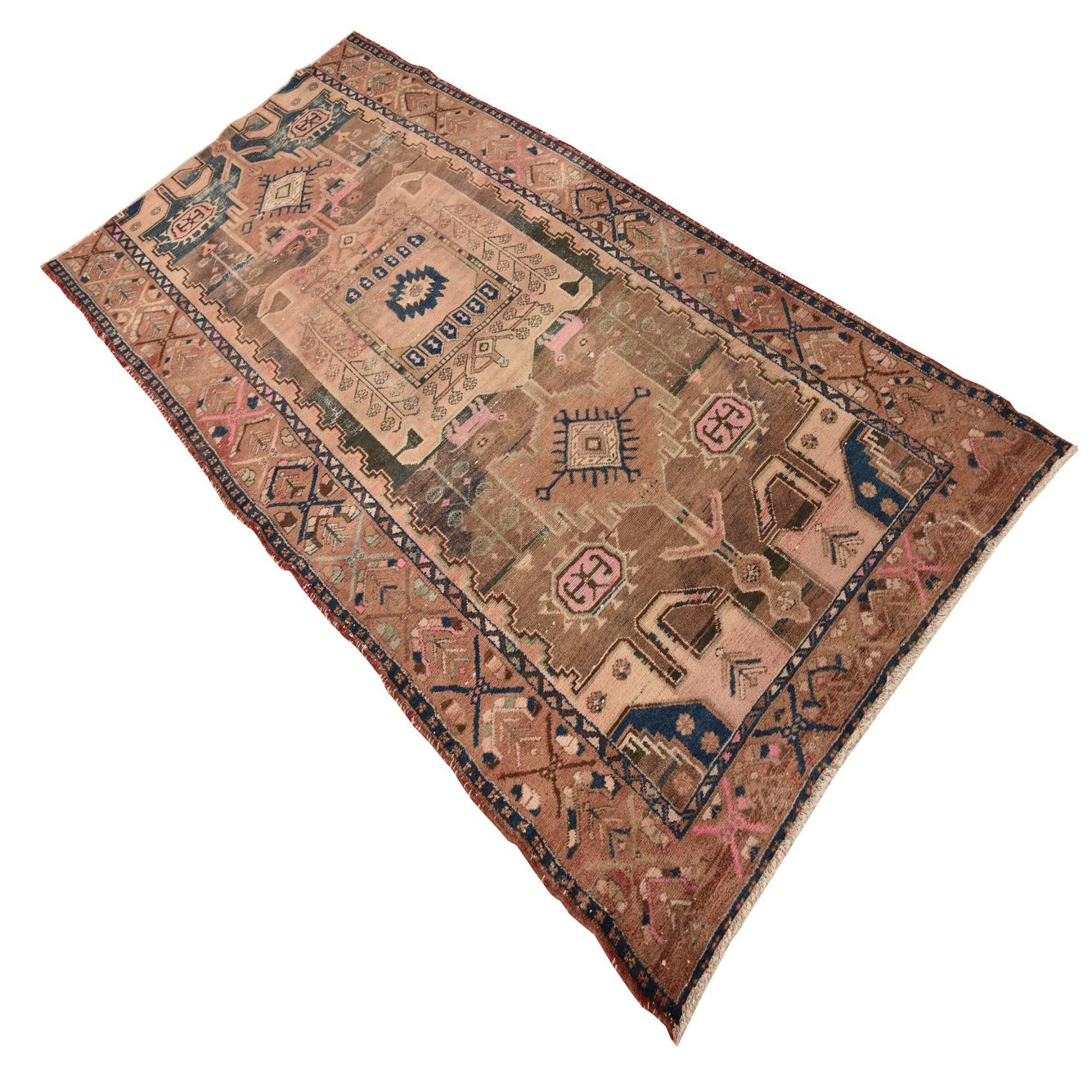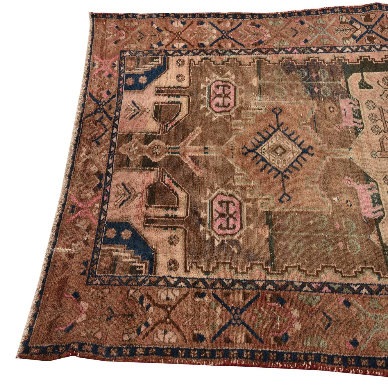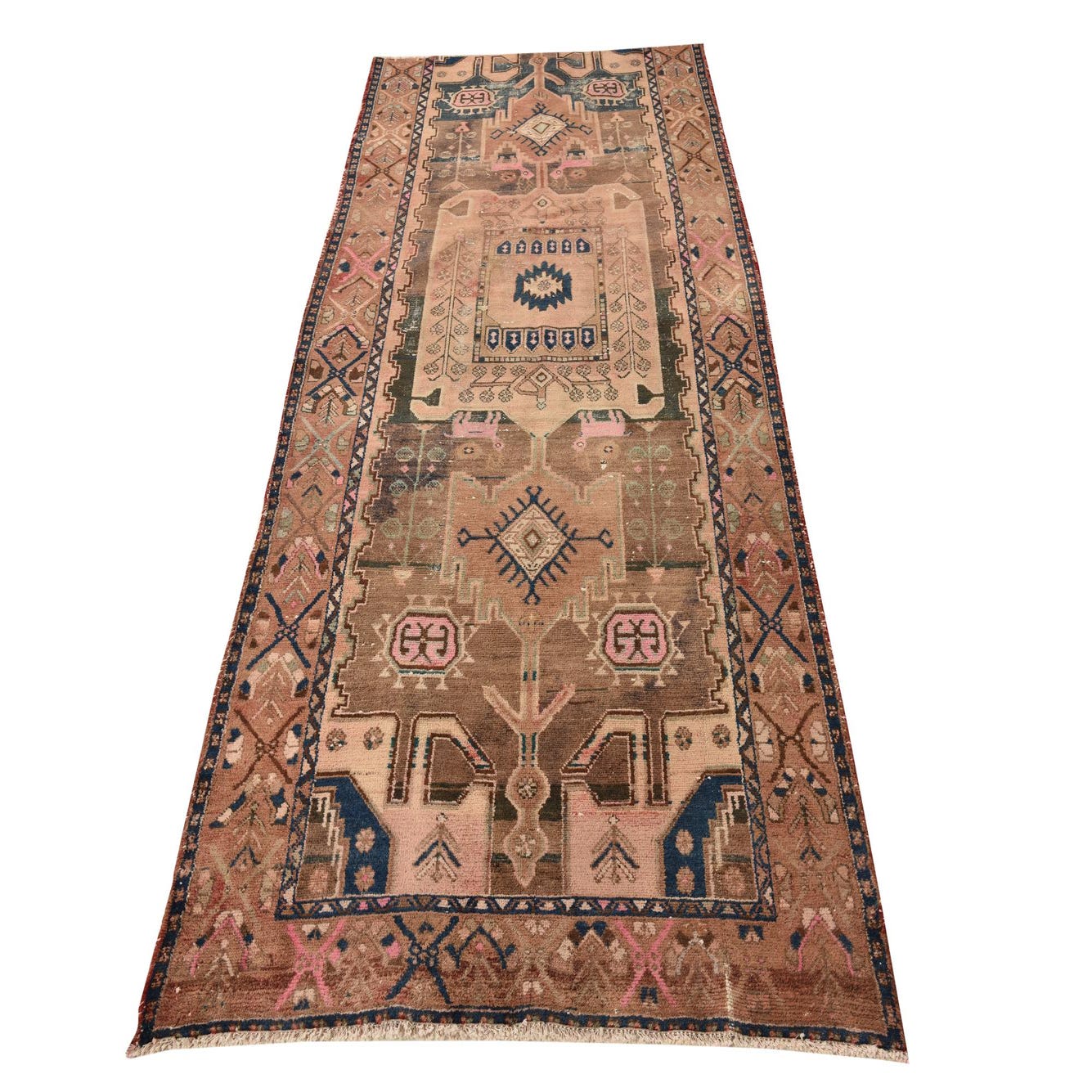 A 9 ft runner rug in traditional Persian style, featuring brown, tan, and blue tones with intricate patterns and pink animal motifs.
