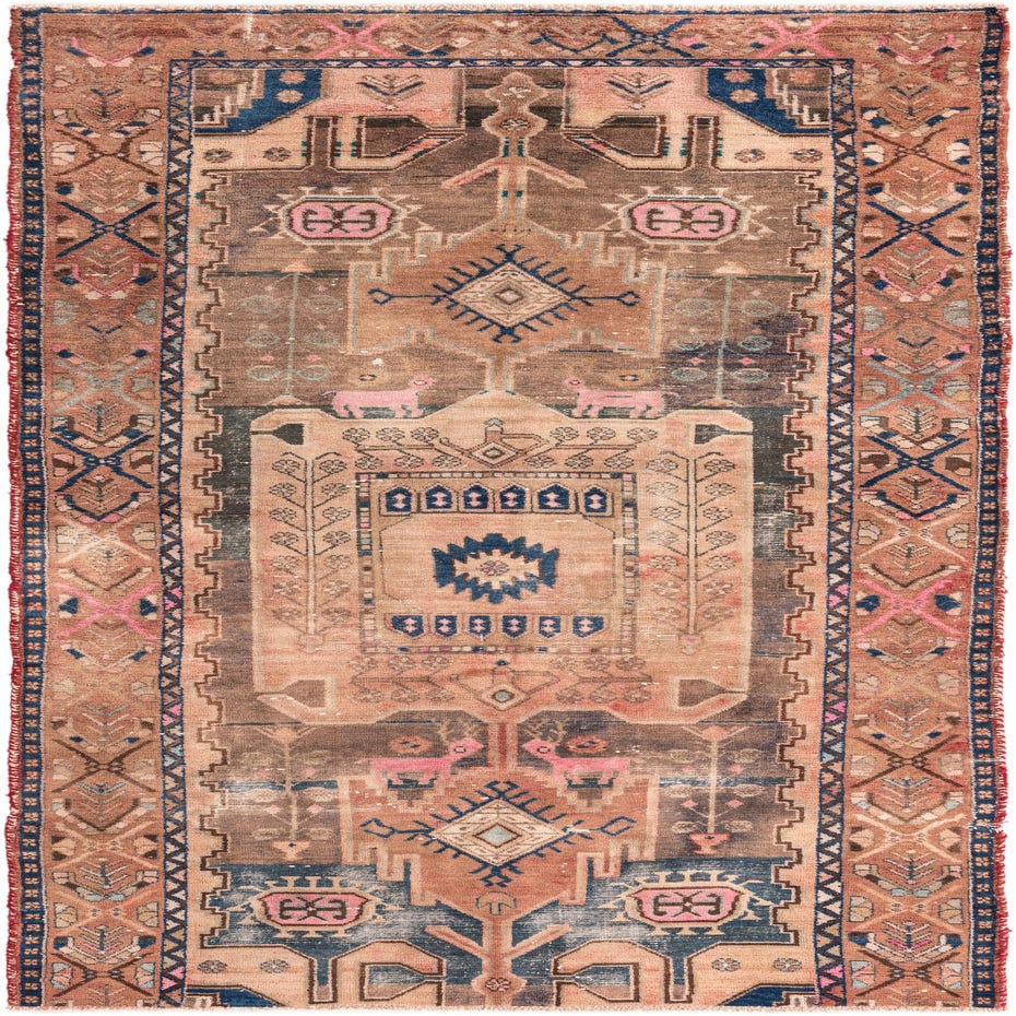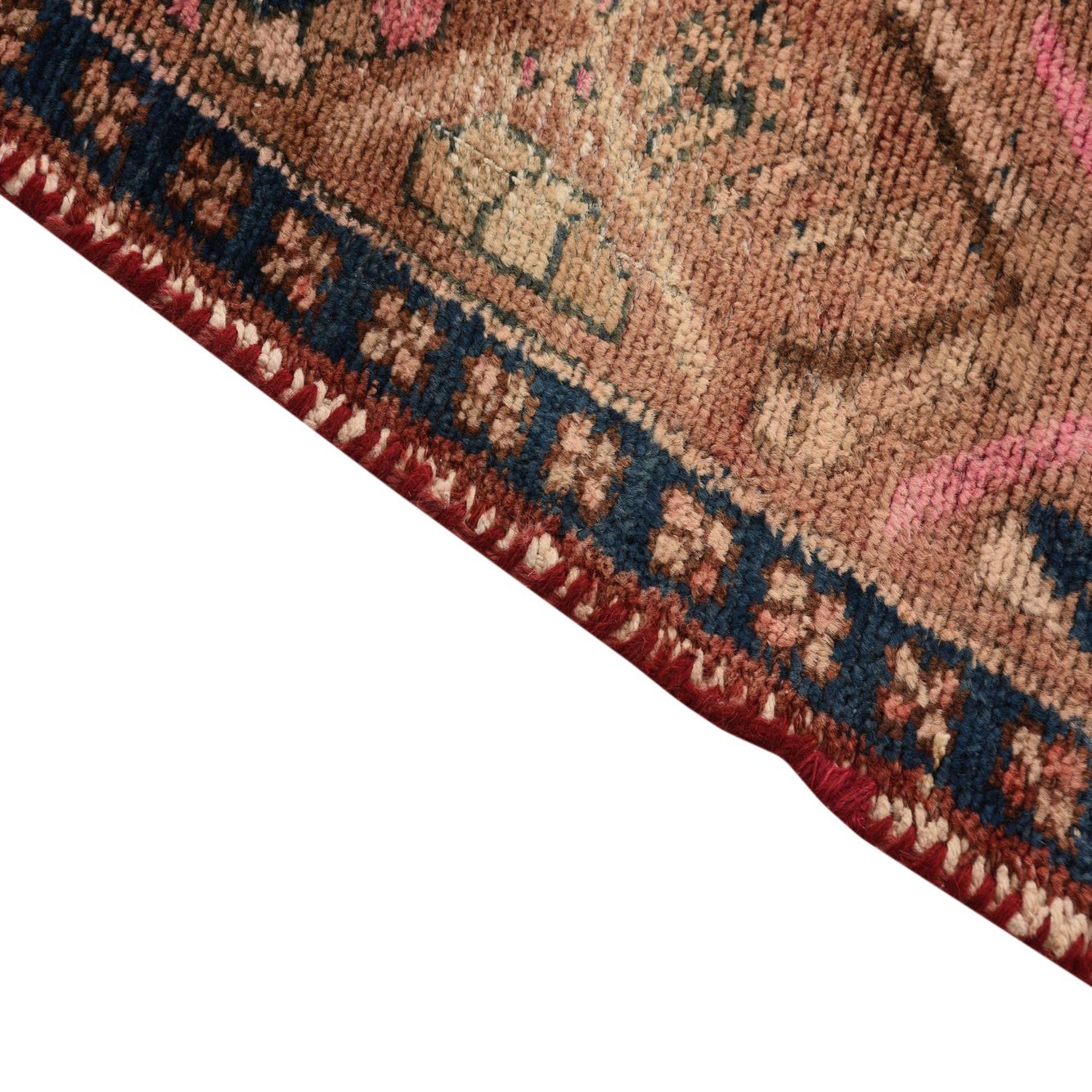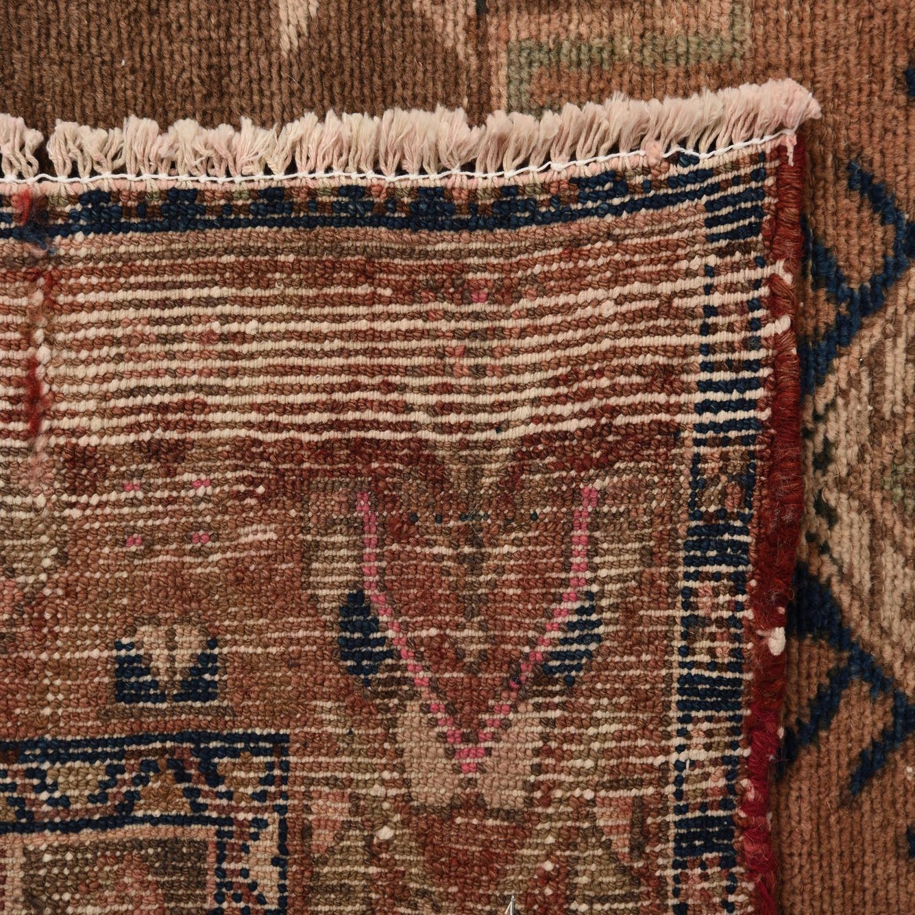 A 9 ft runner rug in traditional Persian style, featuring brown, tan, and blue tones with intricate patterns and pink animal motifs.