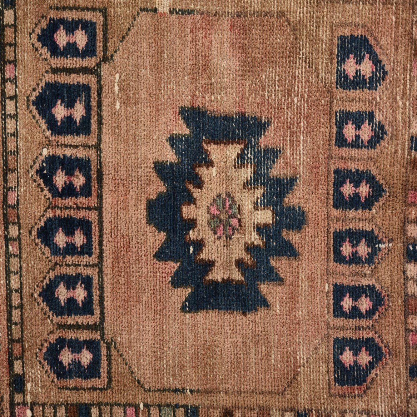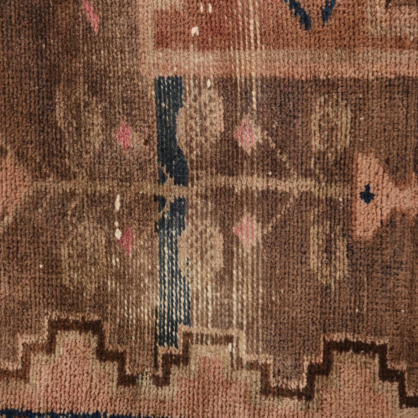 This Ultra Vintage collection runner rug, measuring 9 feet in length, is a testament to enduring craftsmanship, hand-knotted from 100% wool. With a rich palette of brown, beige, navy blue, and rust red, the rug's background is predominantly brown, offering warmth and depth to any space. The pattern is a striking yet traditional display of geometric motifs and stylized floral elements, reminiscent of classic designs. The rug's texture is characteristic of vintage pieces, displaying a low pile that contributes to its authentic time-worn appearance.