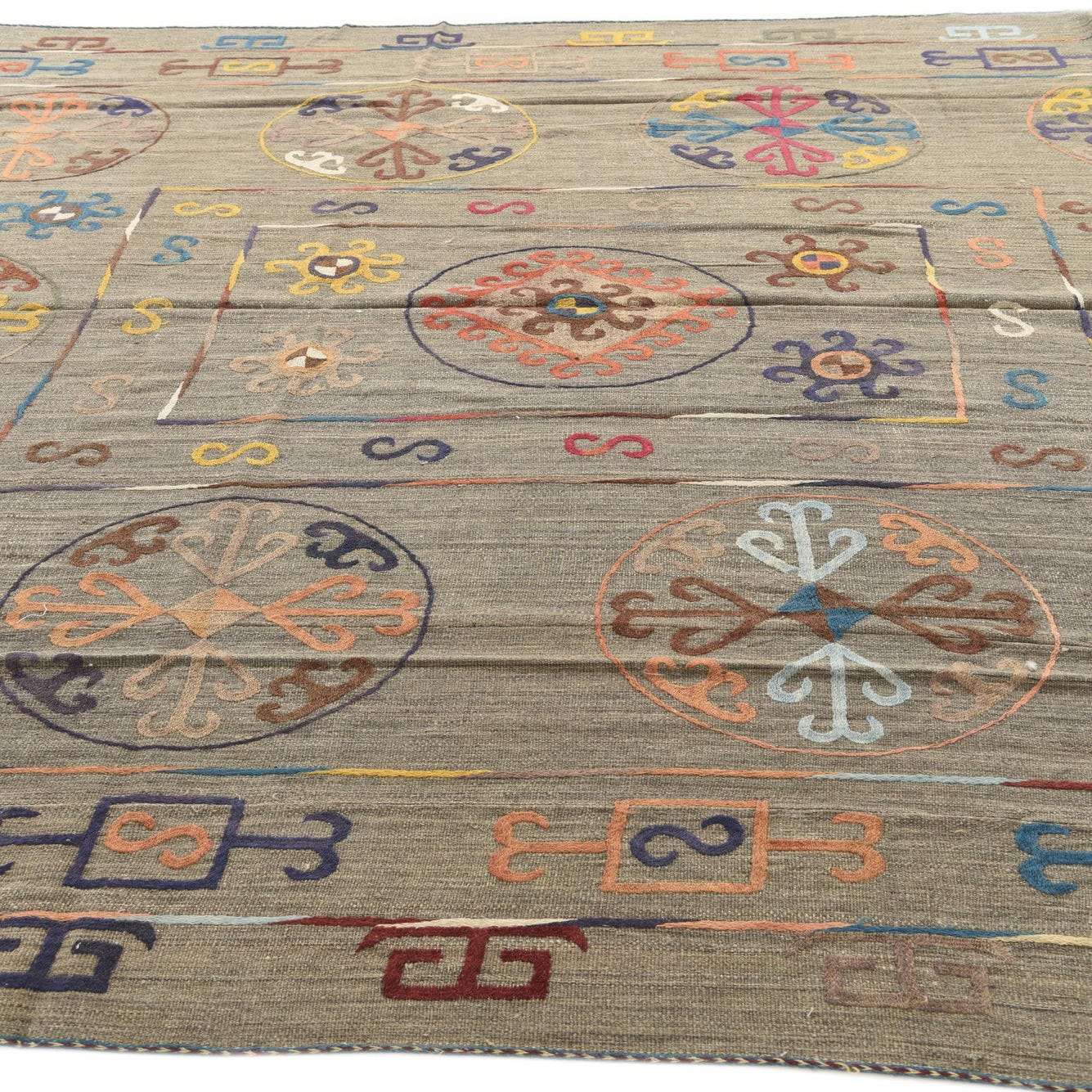 A square 8' 7 x 9' 6 Kilim Suzani rug with a brown base and colorful tribal and abstract motifs.