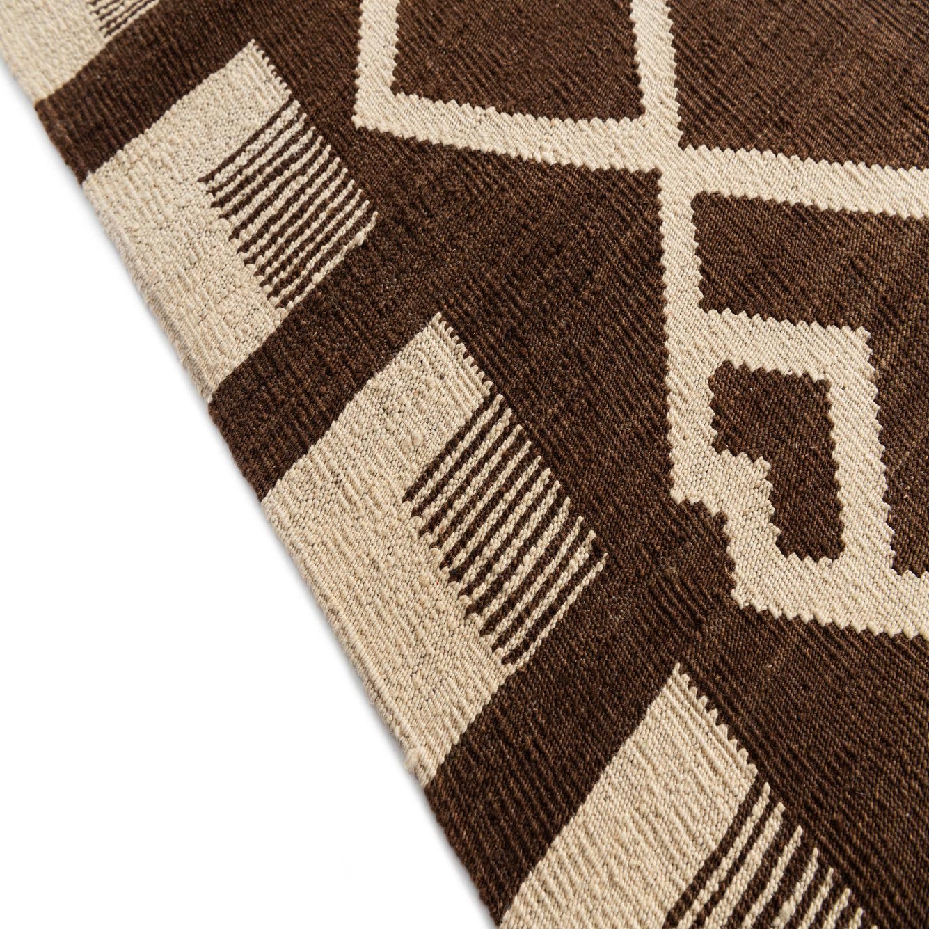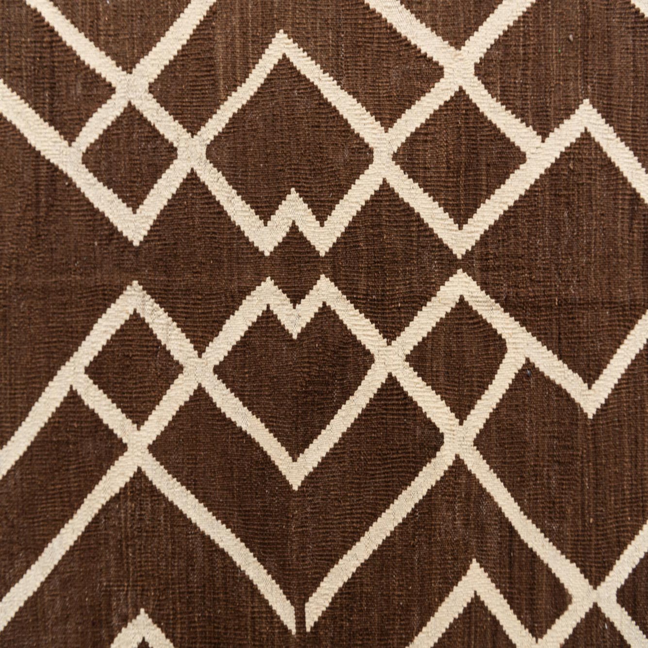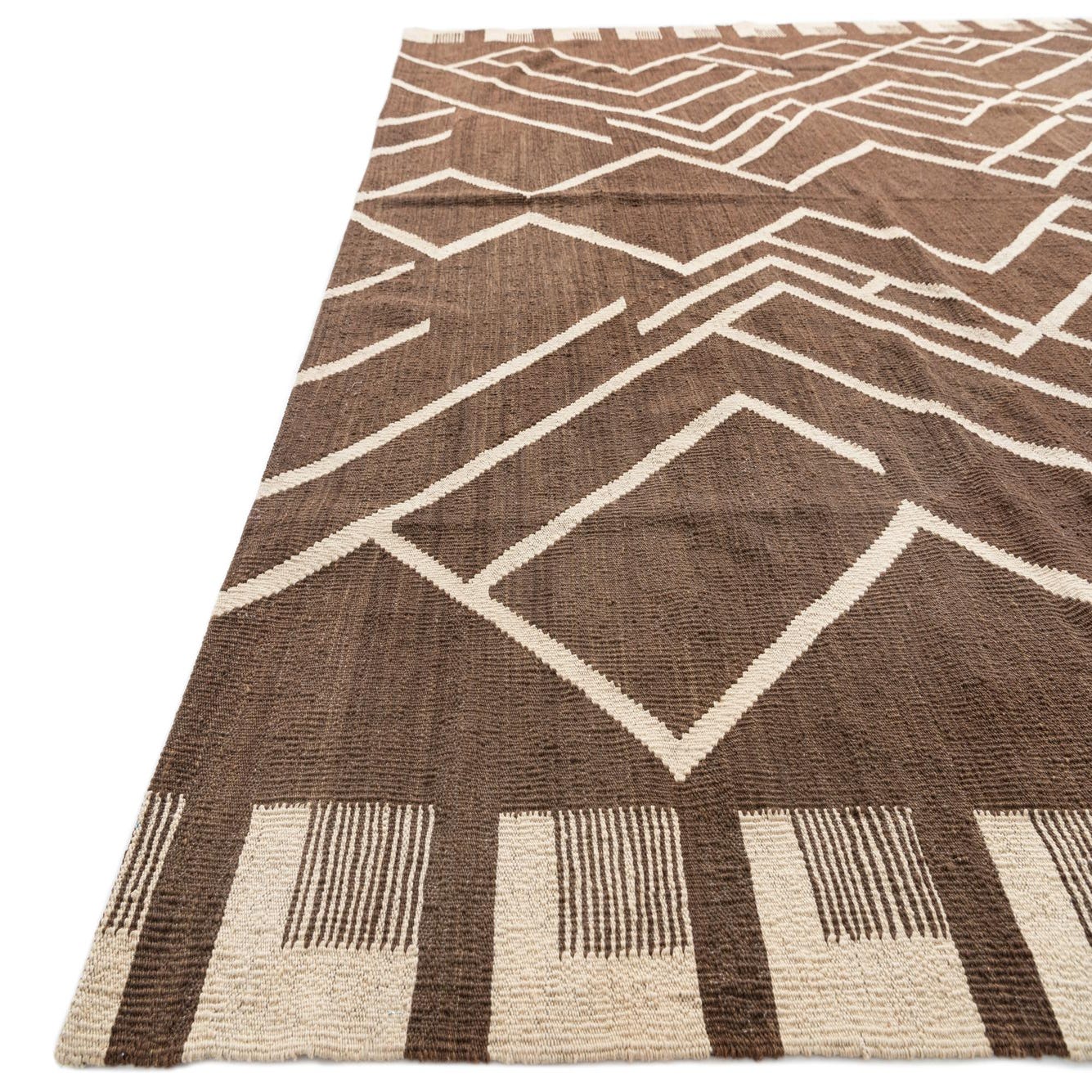 The Kilim Modern collection offers a contemporary hand-woven rug made from 100% wool, showcasing a sophisticated brown and cream color palette. The background is a rich brown, providing a warm and inviting base for the cream geometric lines that create a dynamic and modern pattern. This 9x11 piece features a flatweave texture that adds to its handcrafted appeal, while the crisp lines and blocks add a graphic element to the design.