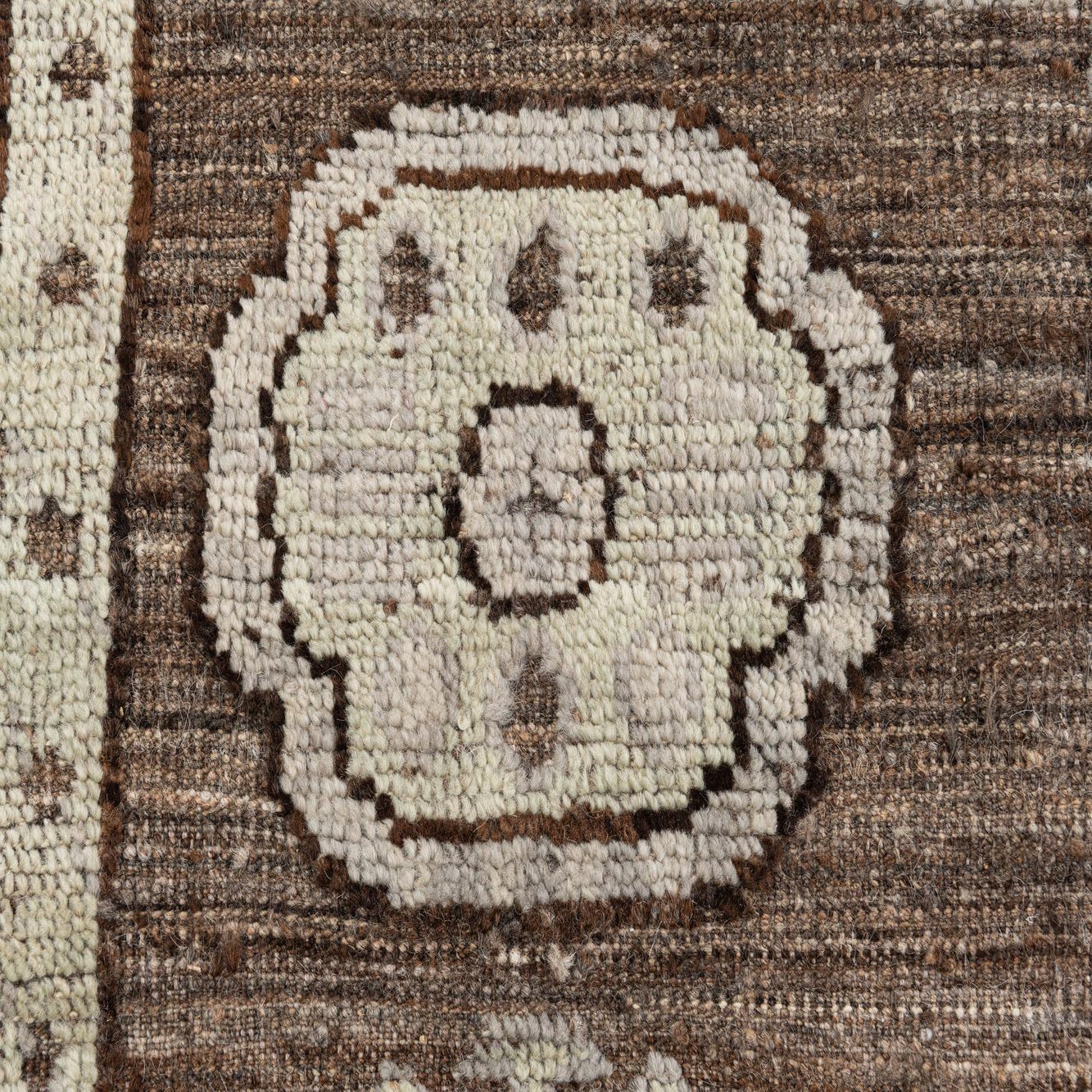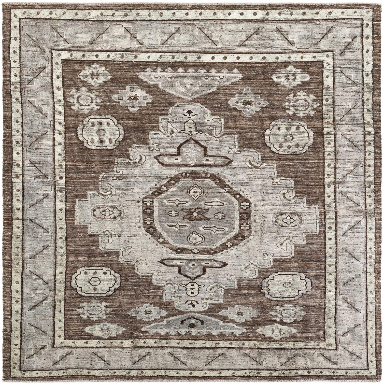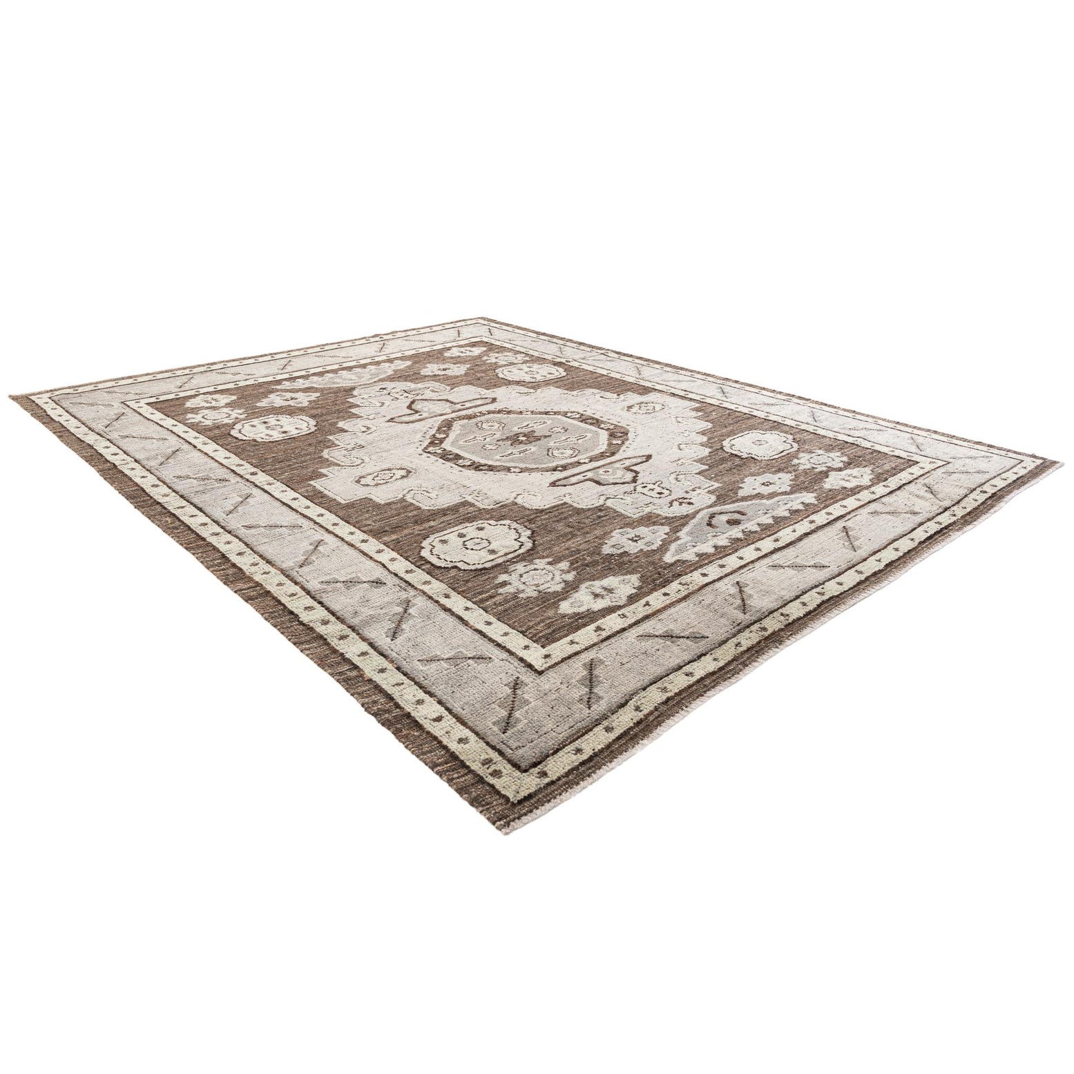 A rectangular 9x11 Oushak rug in browns and tans with a central medallion and geometric patterns, ideal for a living room.