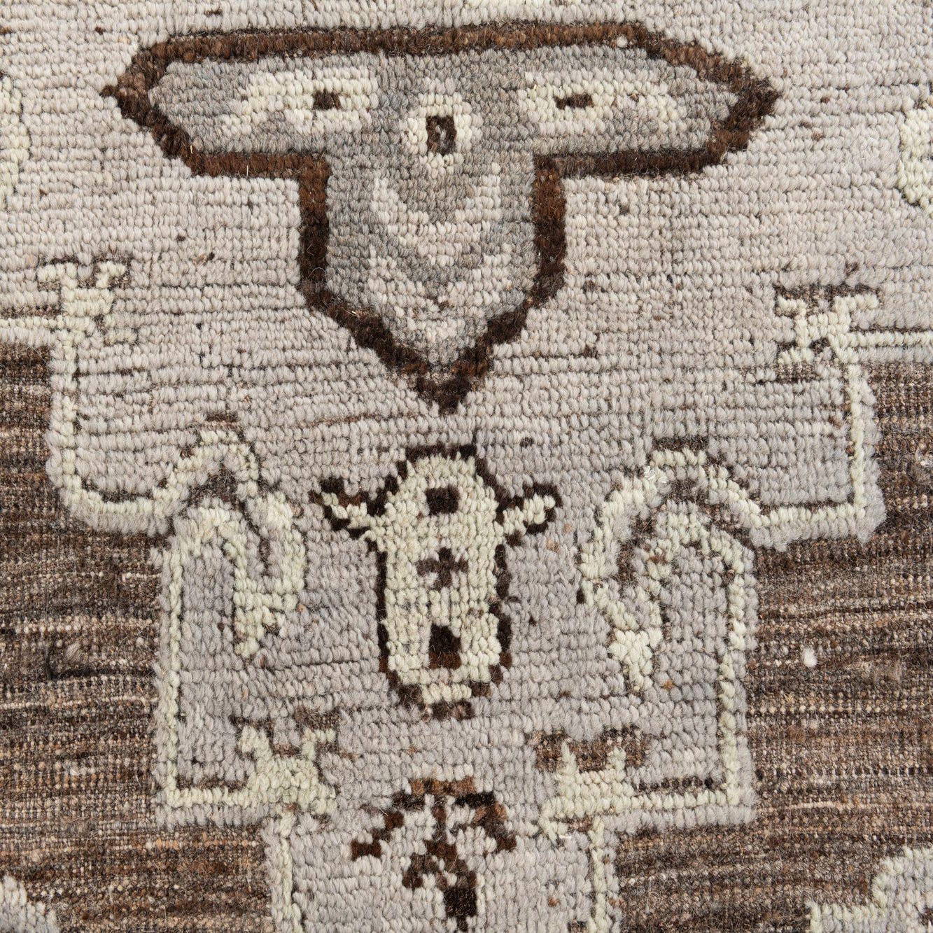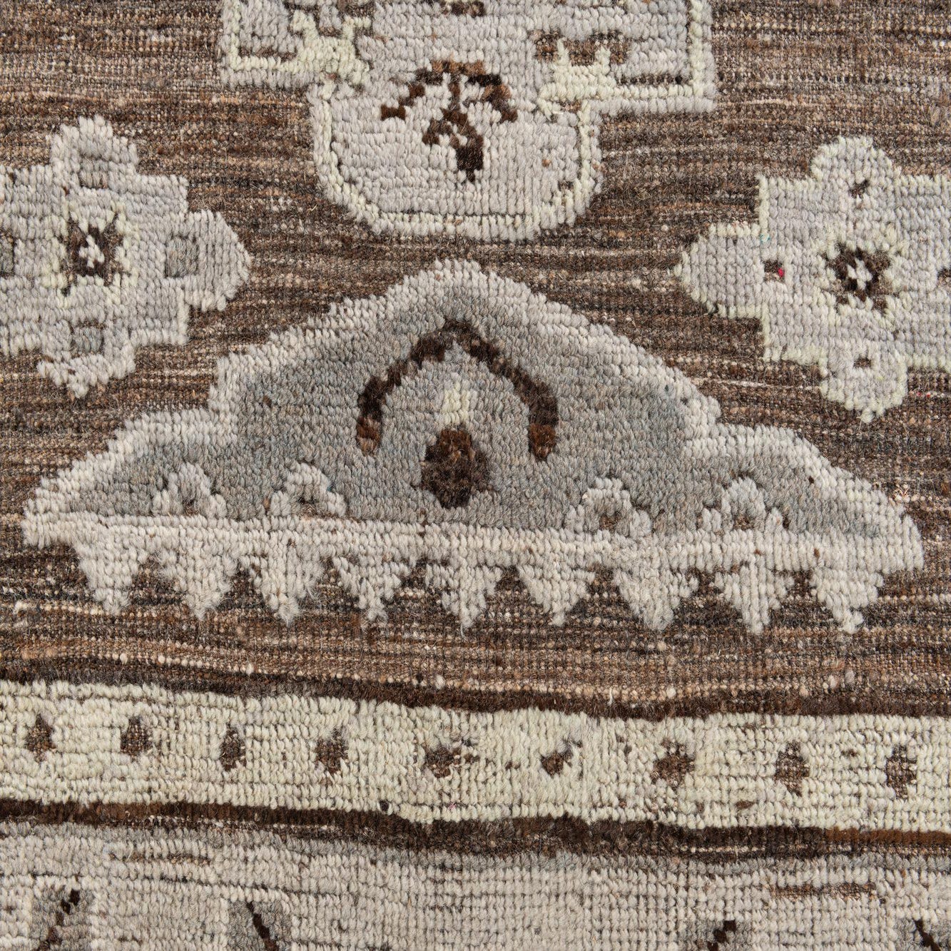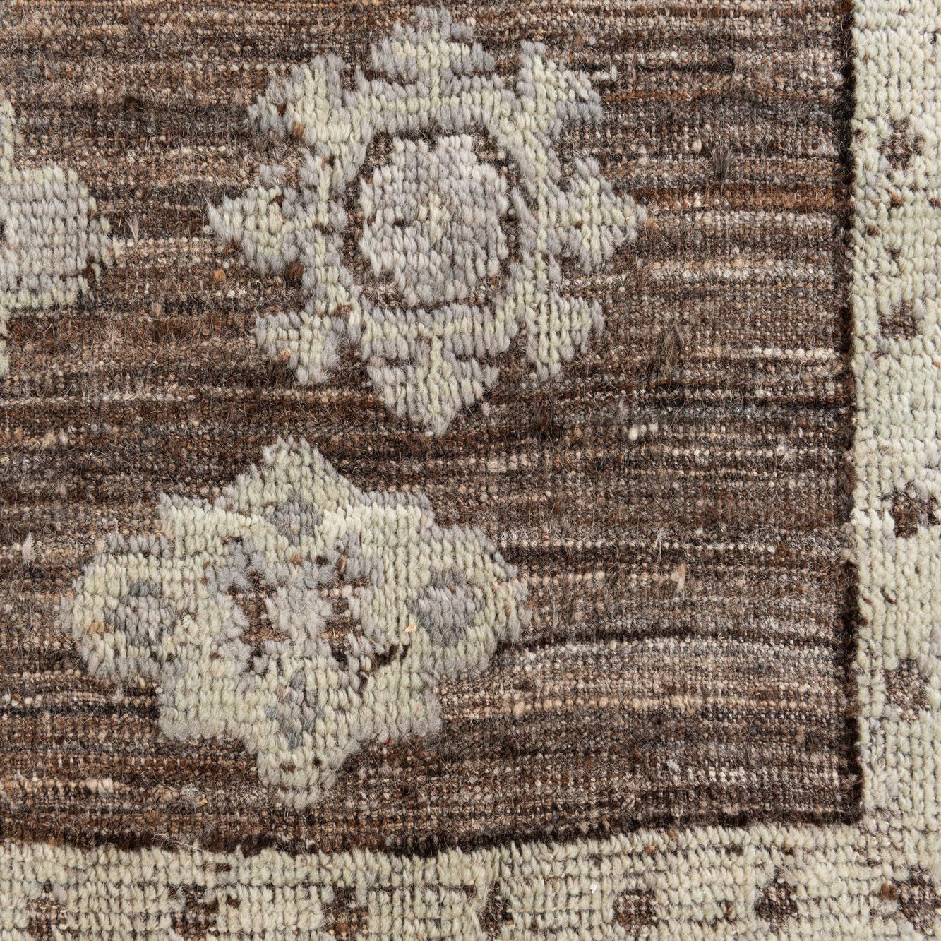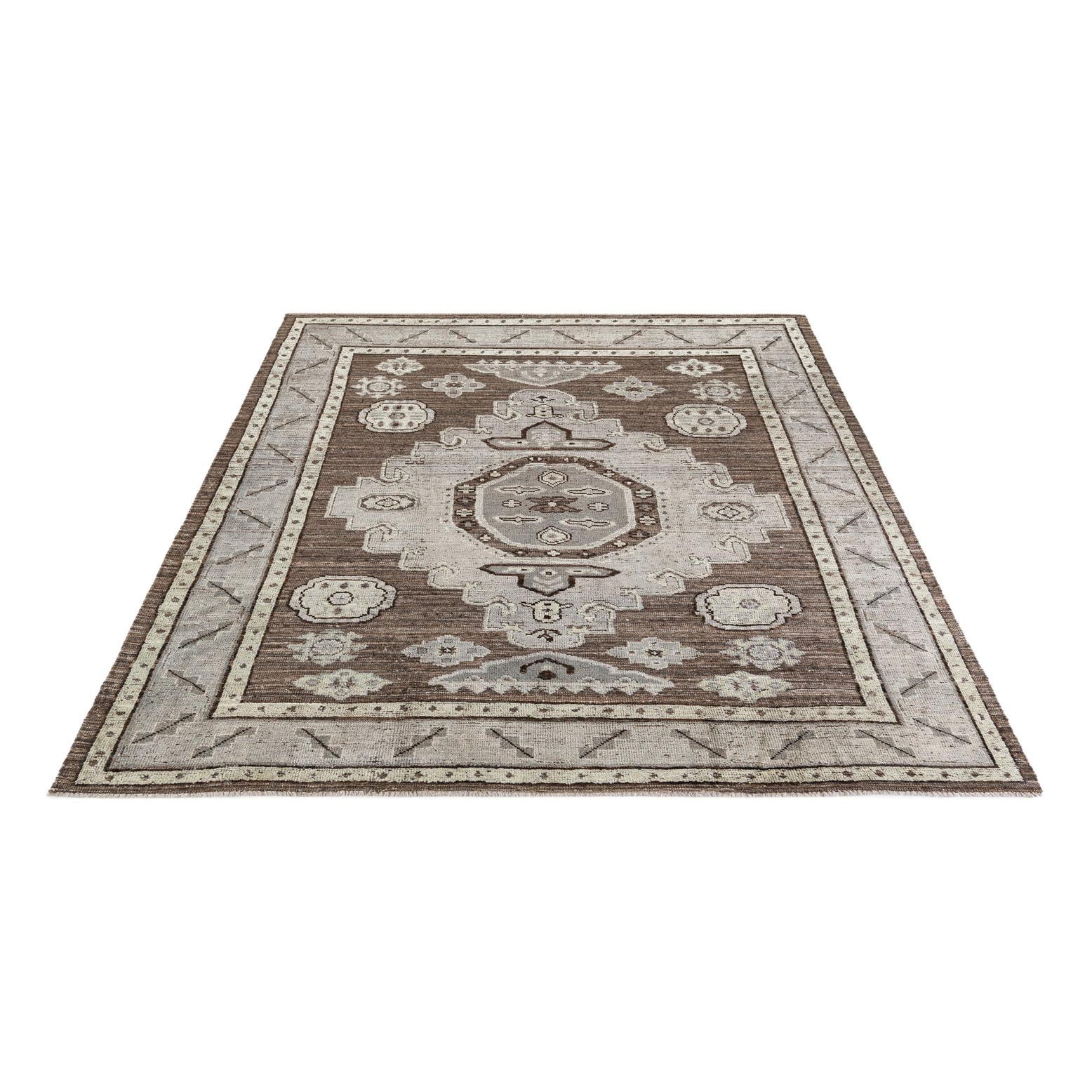 A rectangular 9x11 Oushak rug in browns and tans with a central medallion and geometric patterns, ideal for a living room.