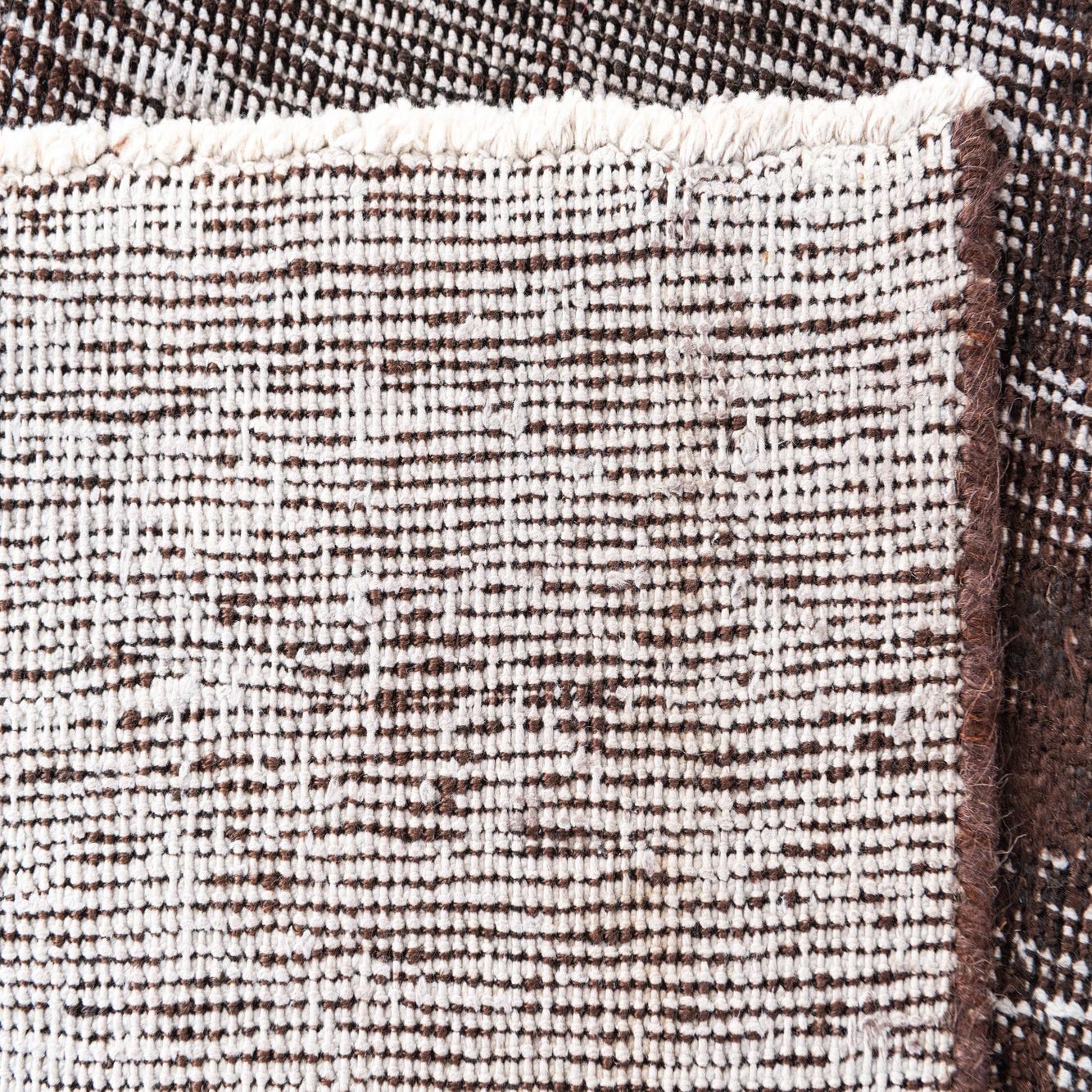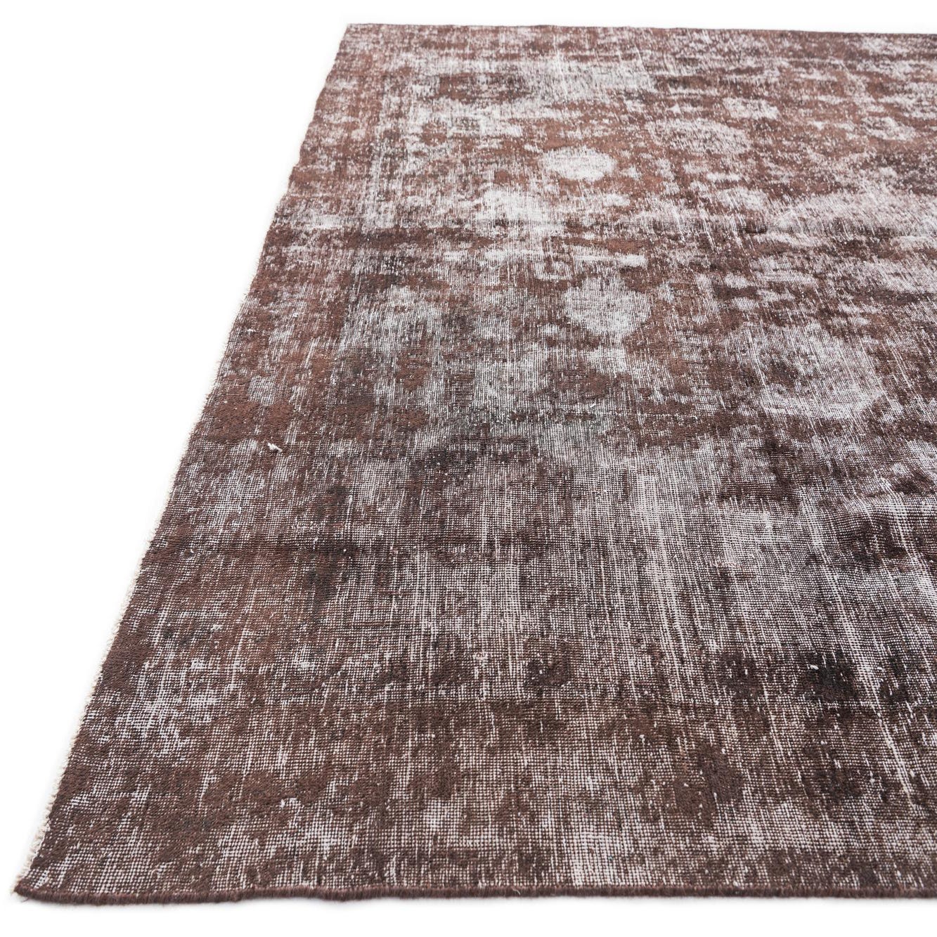 Hand-knotted from 100% wool, this rug presents a worn-vintage aesthetic with a warm brown background softened by ivory highlights. The pattern is an all-over, distressed medallion and field motif where irregular outlines and subtle abrash create a lived-in, layered look. Run your hand across the surface and you’ll feel a dense, low-to-medium pile with the natural resilience and soft texture of wool, while the muted ivory contrasts gently against the brown ground to emphasize the rug’s antique character.