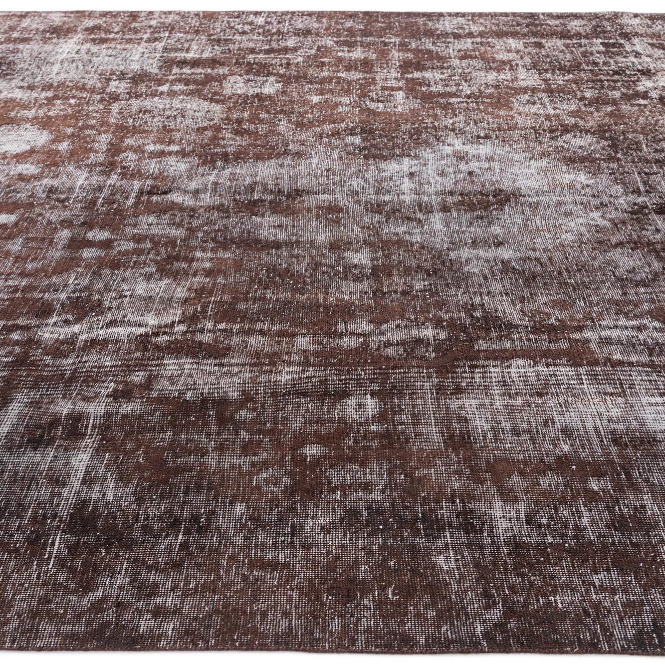 A 9x11 rectangular brown wool rug with a faded Persian-style pattern, featuring abstract tan and white distressed details.