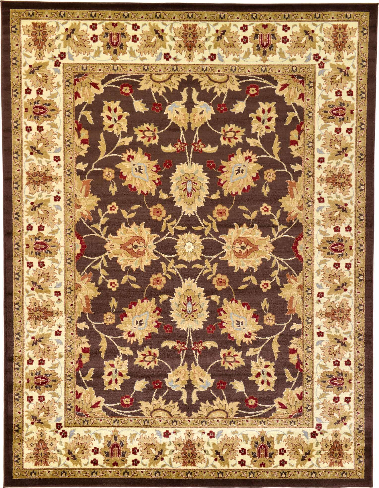 Primary color is Brown. Colors in this rug include: Brown, Cream, Red, Tan, Light Blue, Light Green, Peach.