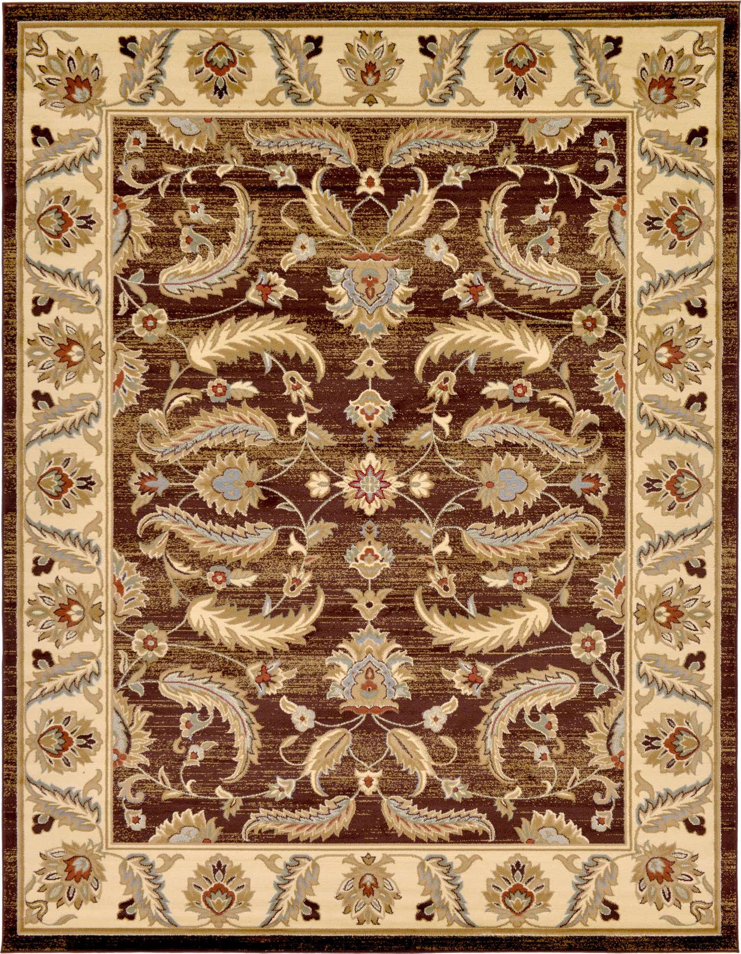 Primary color is Brown. Colors in this rug include: Brown, Candy, Cream, Green, Light Blue, Tan, Rust Red, Red.