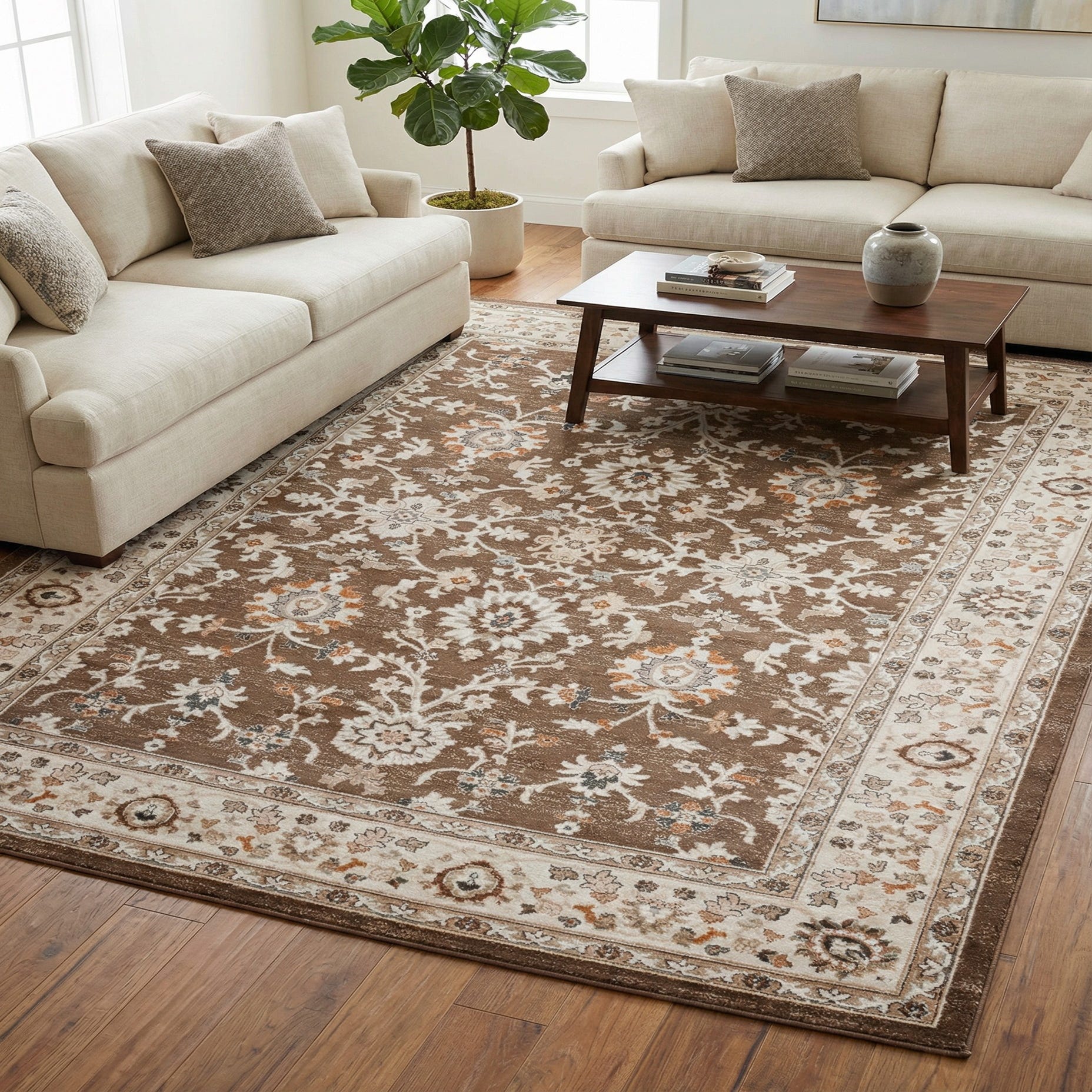 A classic floral-and-vine pattern fills a warm brown field, with ivory medallions and scrolling motifs set against the brown background and picked out in gray, light brown and subtle terracotta accents. A stepped ivory border frames the central design, creating a clear edge that balances the more ornate inner pattern. Running your hand across the surface confirms a smooth, low-profile texture—machine-made of 100% polypropylene—where the tight weave keeps the detailed motifs crisp and the colors evenly distributed.