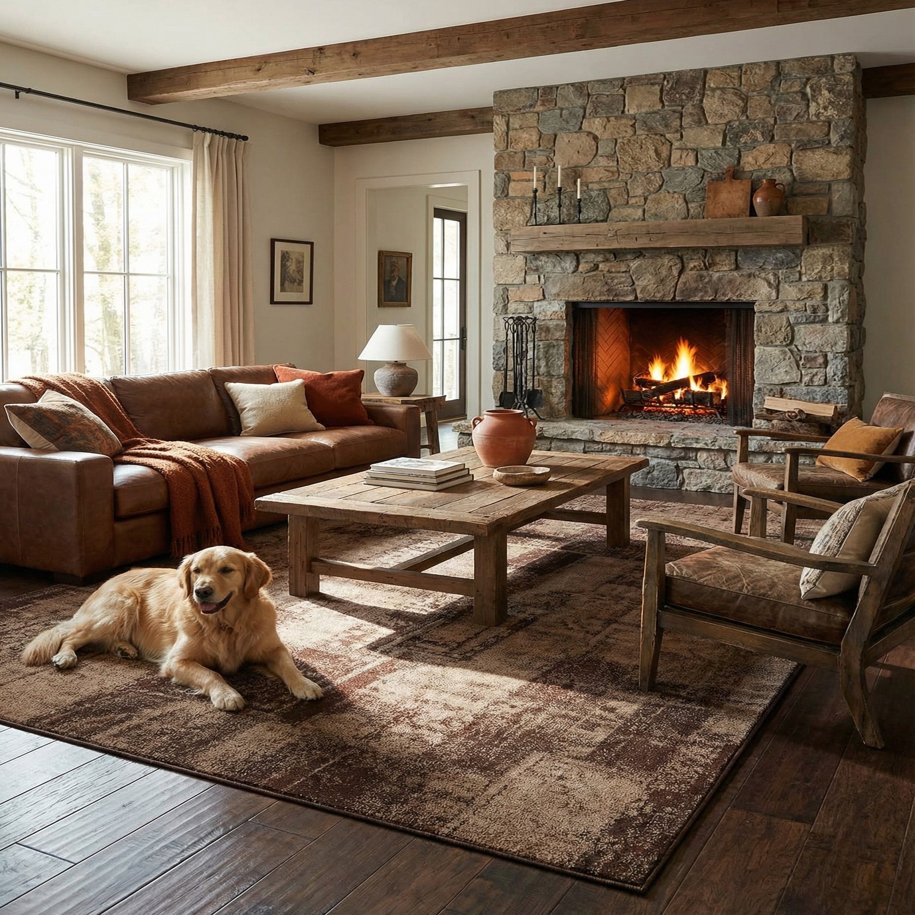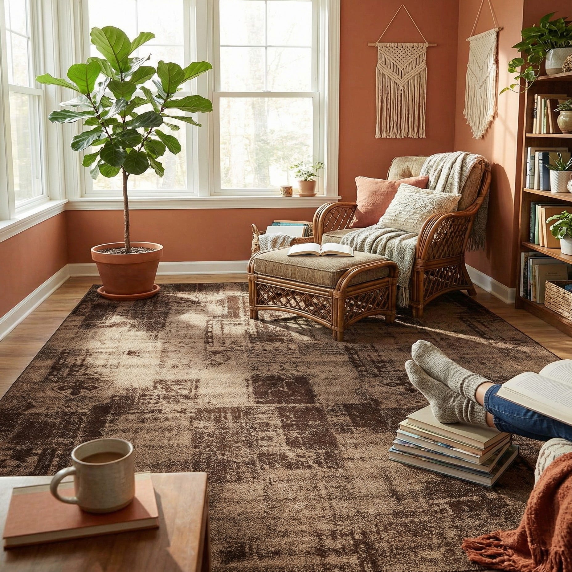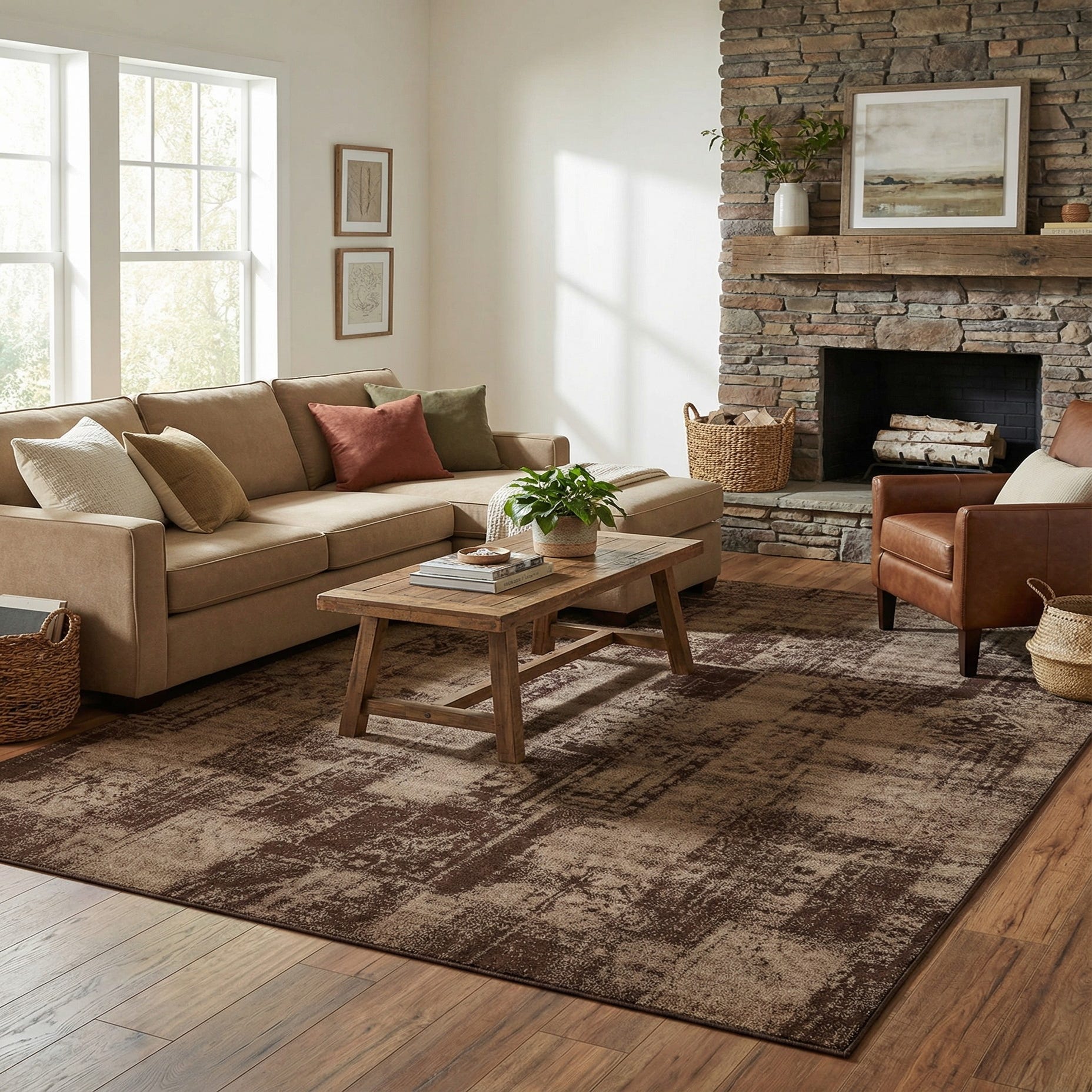 Machine made from 100% polypropylene, the rug has a low pile with a smooth, slightly dense hand underfoot that tucks neatly beneath furniture. Its tonal brown palette works well with leather seating, warm wood finishes, neutral linens, or industrial metal accents — place it beneath a sofa grouping to warm a living room, under a dining table to coordinate with wood tones, or in a study to anchor seating and storage.