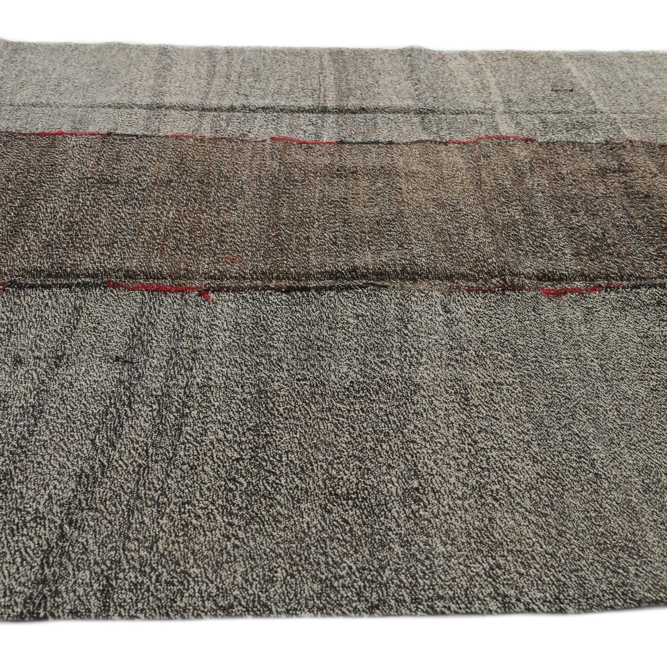 The Kilim Modern Collection offers a 9x12 hand-woven rug crafted from 100% wool, presenting a harmonious blend of durability and tactile comfort. This piece showcases a primarily brown background, complemented by a restrained palette that includes black, ivory, red, and orange accents. The rug features a minimalist pattern that focuses on horizontal bands of varying shades of brown, interconnected by subtle linear streaks of red and occasional hints of the secondary colors. The inclusion of fringe adds a traditional touch to its clean, contemporary design.