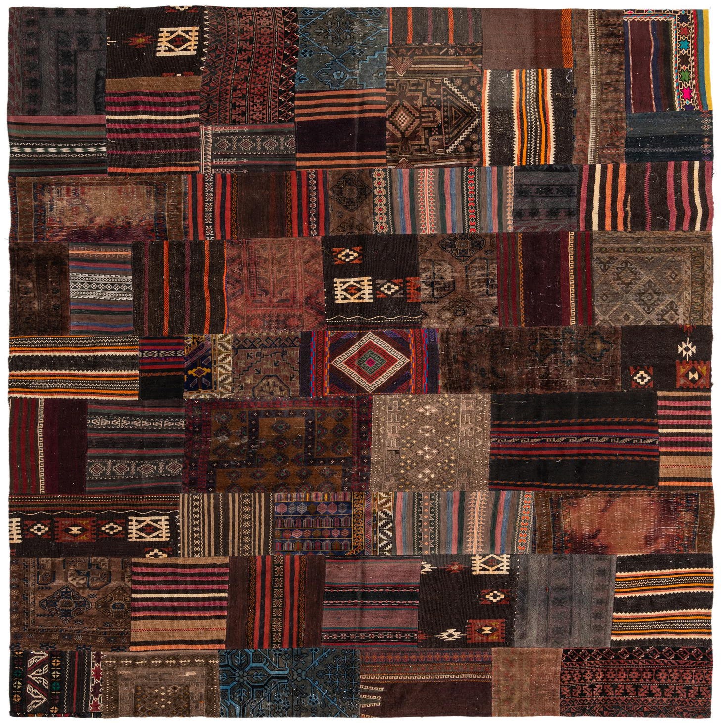 The Kilim Patchwork collection presents a hand-woven 9x12 rug, crafted from 100% wool, offering both durability and tactile appeal. This piece is notable for its visual complexity, featuring a patchwork of varied designs that embody a rich tapestry of cultural history. Each segment within the patchwork showcases a unique pattern, ranging from geometric motifs to traditional tribal symbols, all harmoniously nested within the rug's overall layout.