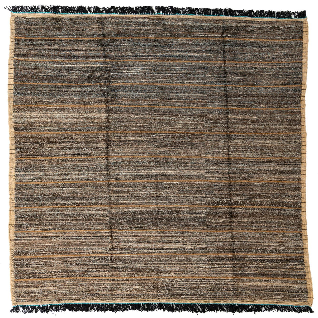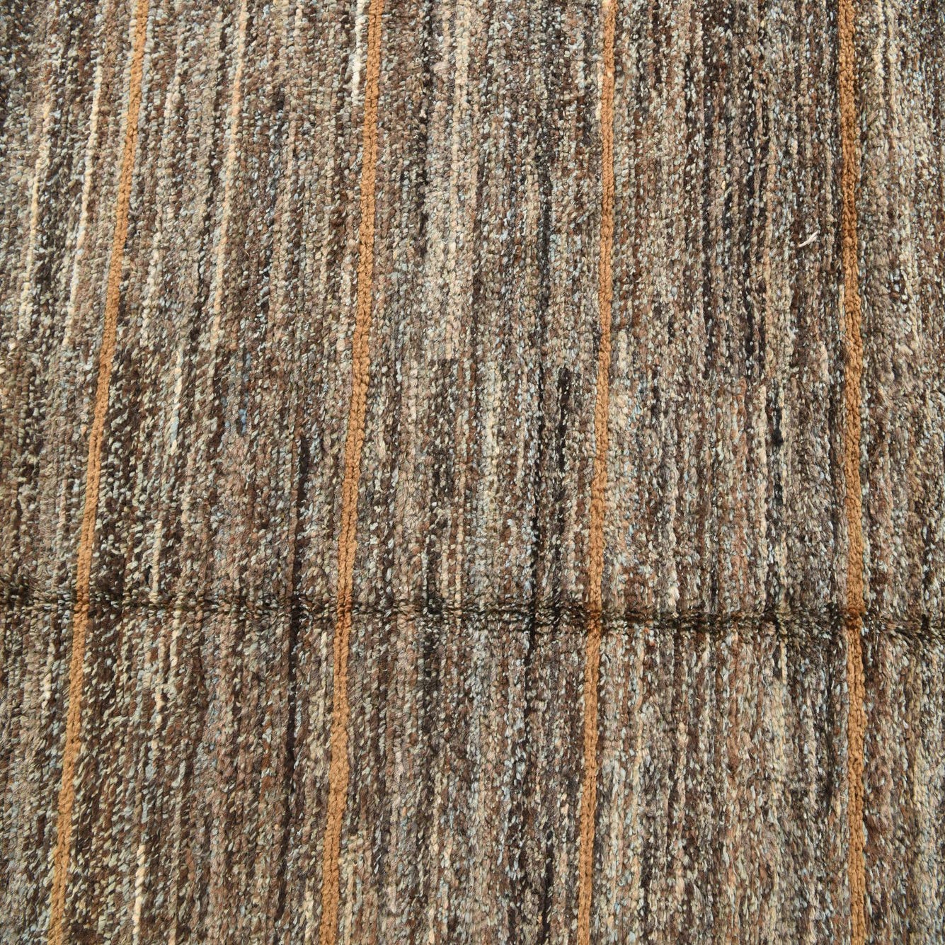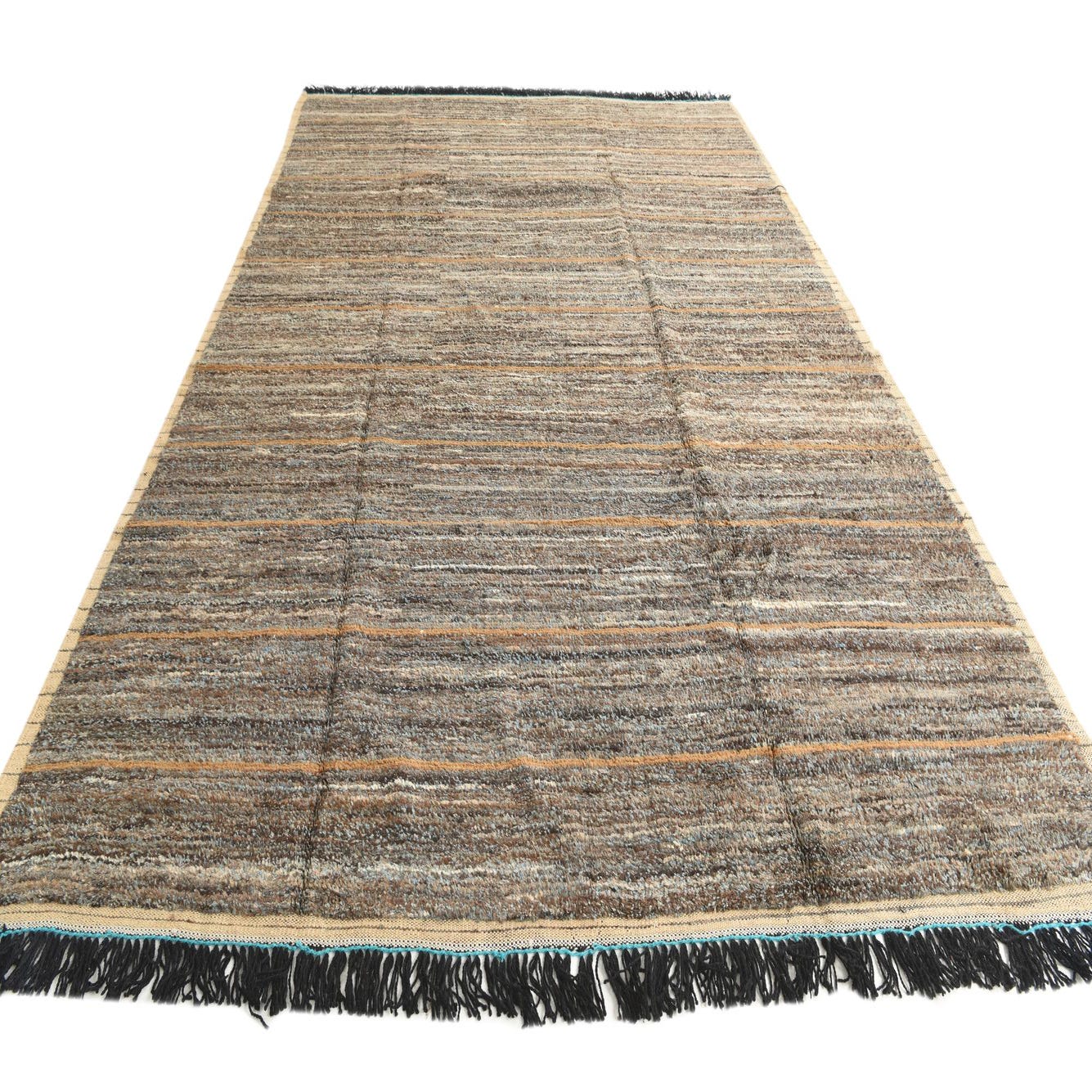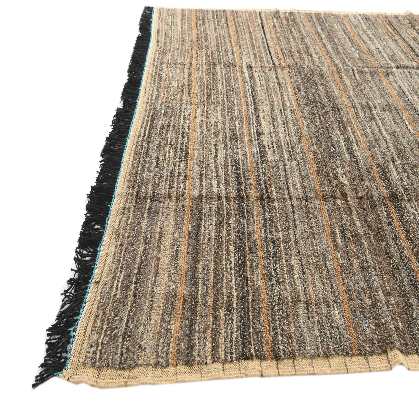 Hand-knotted from 100% wool, this rug presents a warm brown field woven with closely set horizontal striations in beige, light brown, light blue and black, with thin gold bands that catch the eye. The linear, low-contrast pattern has a handcrafted feel—subtle irregularities and a soft, dense pile give the surface a tactile depth that’s pleasant underfoot. A neutral beige selvedge and black fringe, accented with a hint of light blue, complete the piece with a relaxed, finished edge.