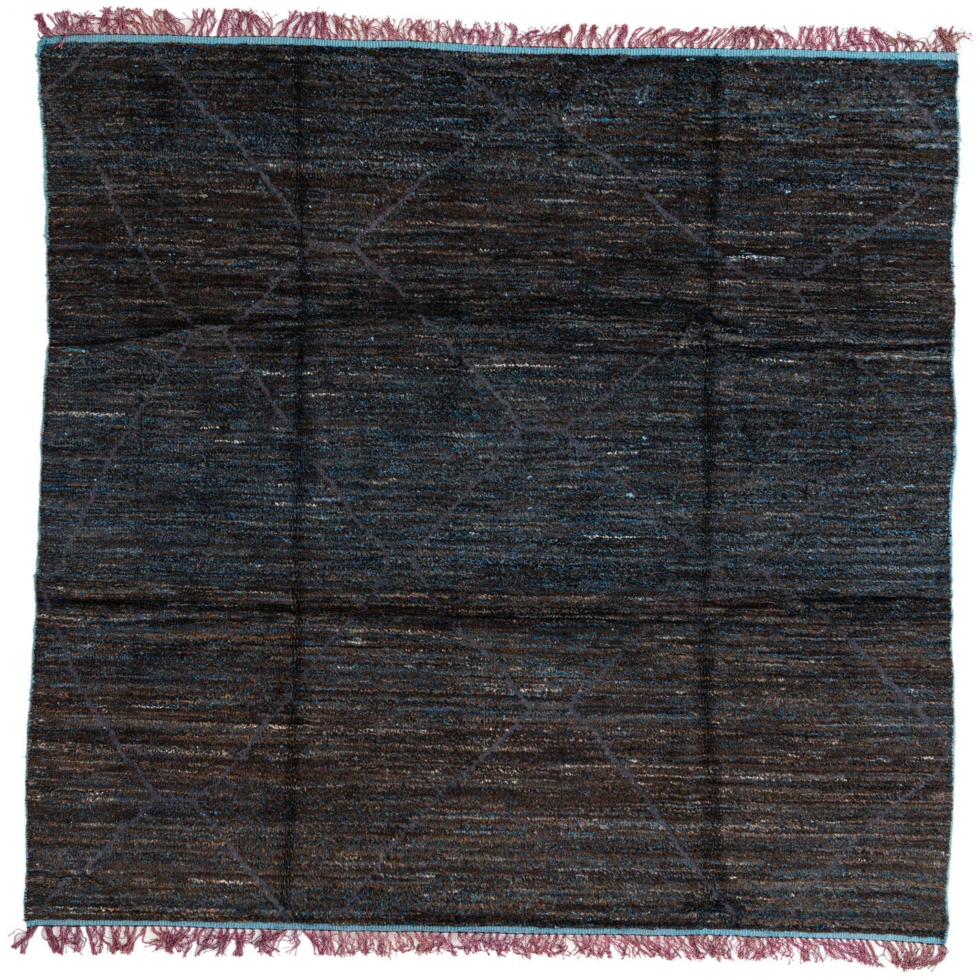 This Moroccan Collection rug is a hand-knotted piece crafted from 100% wool, offering durability alongside its tactile comfort. It spans a generous 9x12 feet, suited for adding warmth and texture to spacious interiors. The rug's background is a deep brown hue, artfully intersected by an understated geometric pattern featuring lines and diamond motifs in a complementary palette of black, blue, pink, and ivory. These elements coalesce to form a balanced, inviting aesthetic.