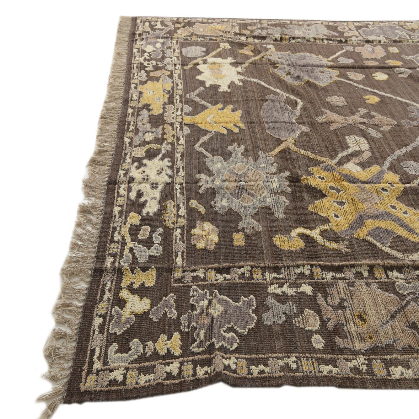 A 9x12 rectangular Oushak rug with a modern abstract pattern in browns, tans, and hints of yellow, featuring a decorative border and fringe.