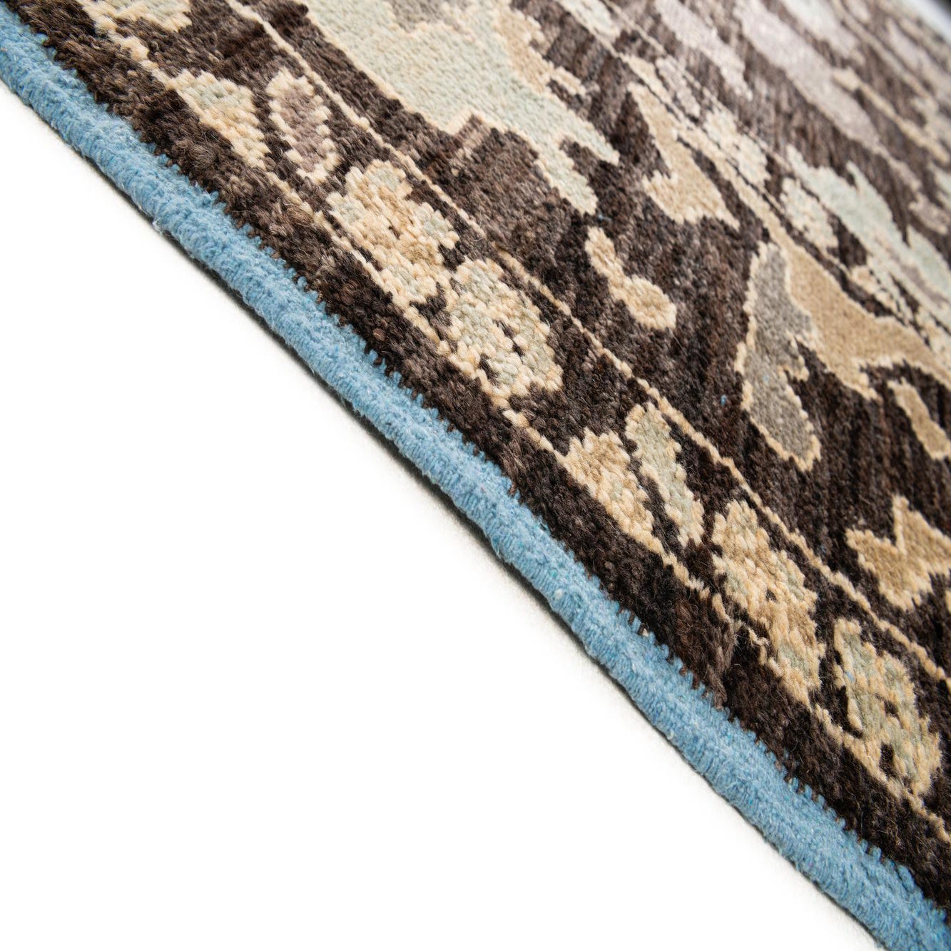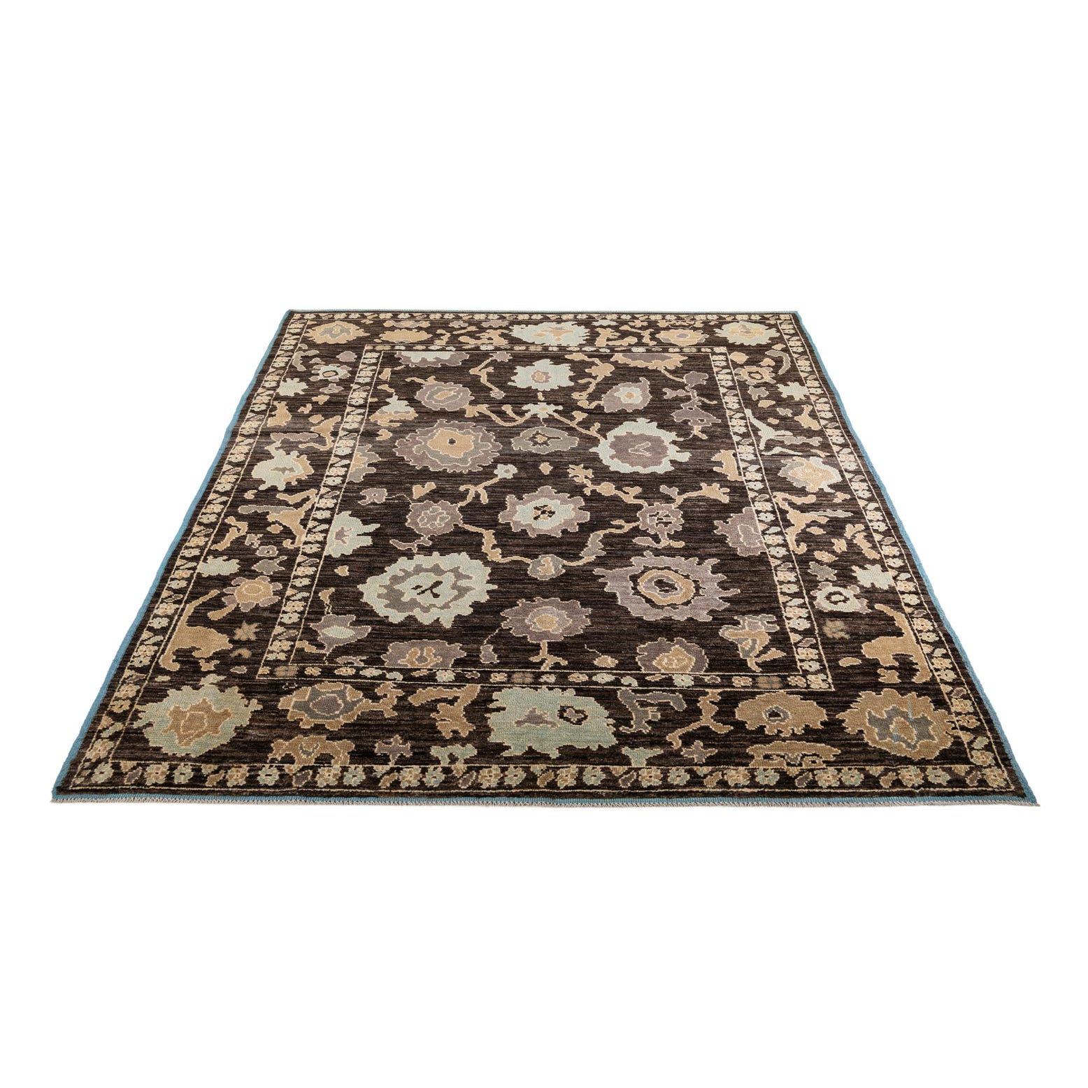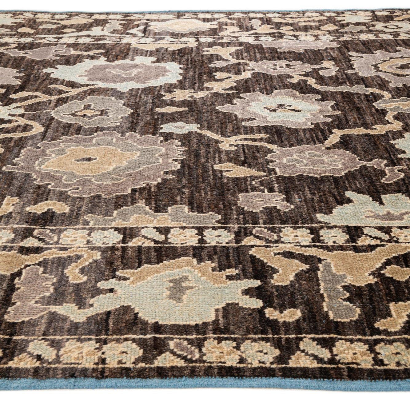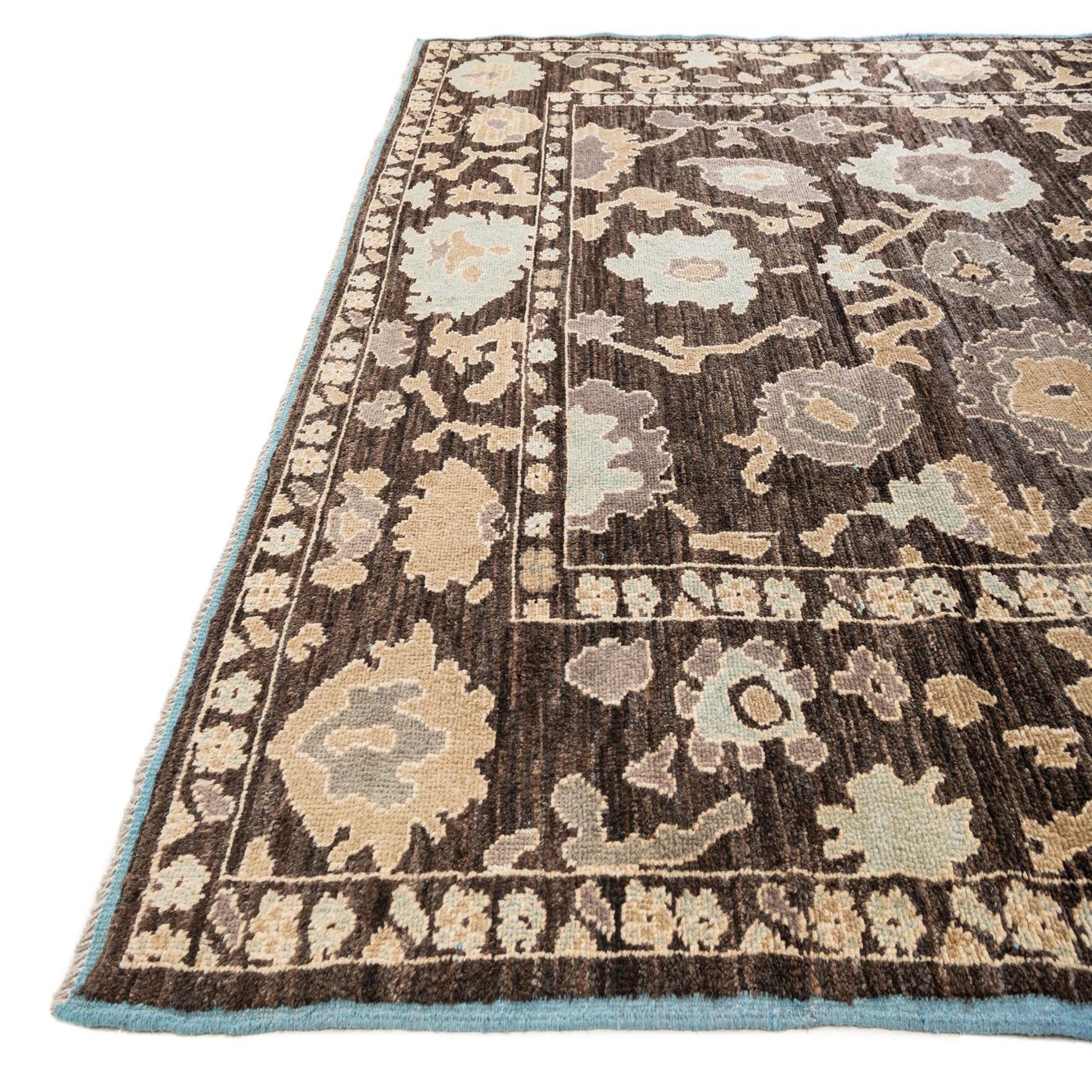 A 9x12 rectangular brown Oushak rug with a modern floral pattern in tan, light blue, and gray, featuring a detailed border.