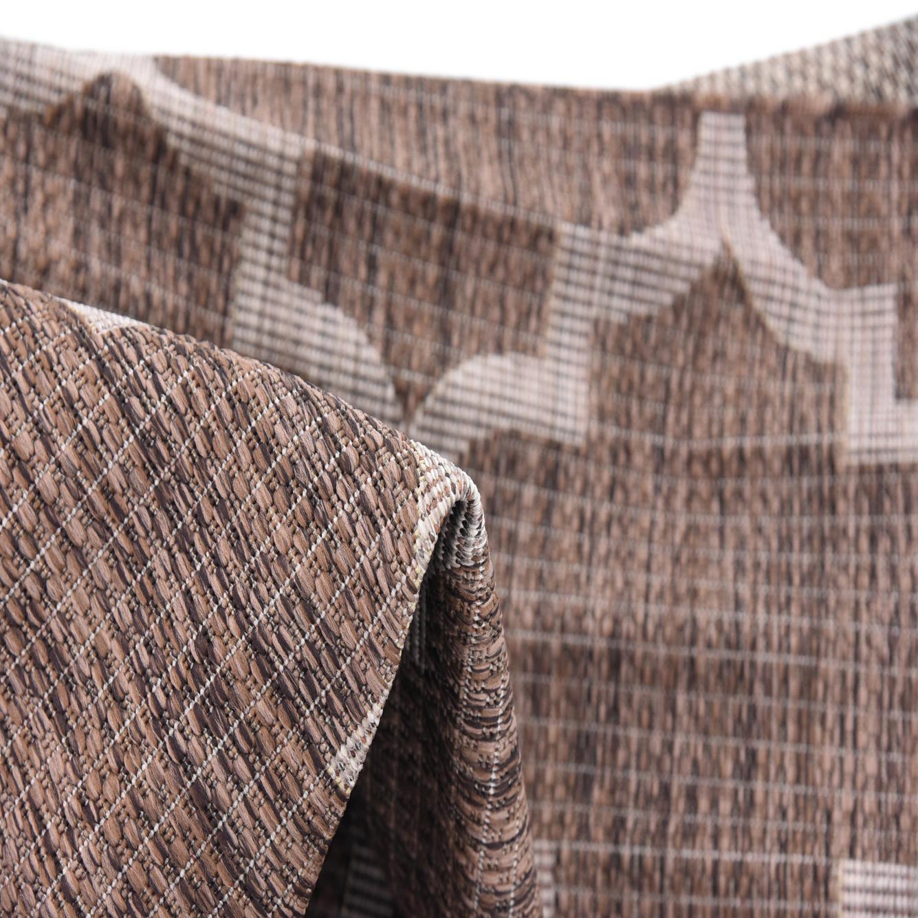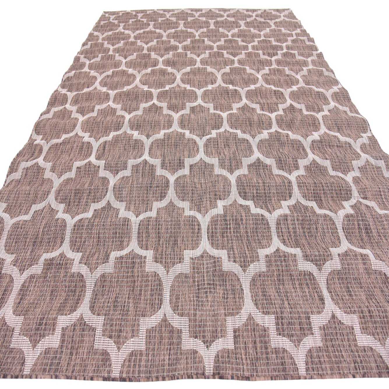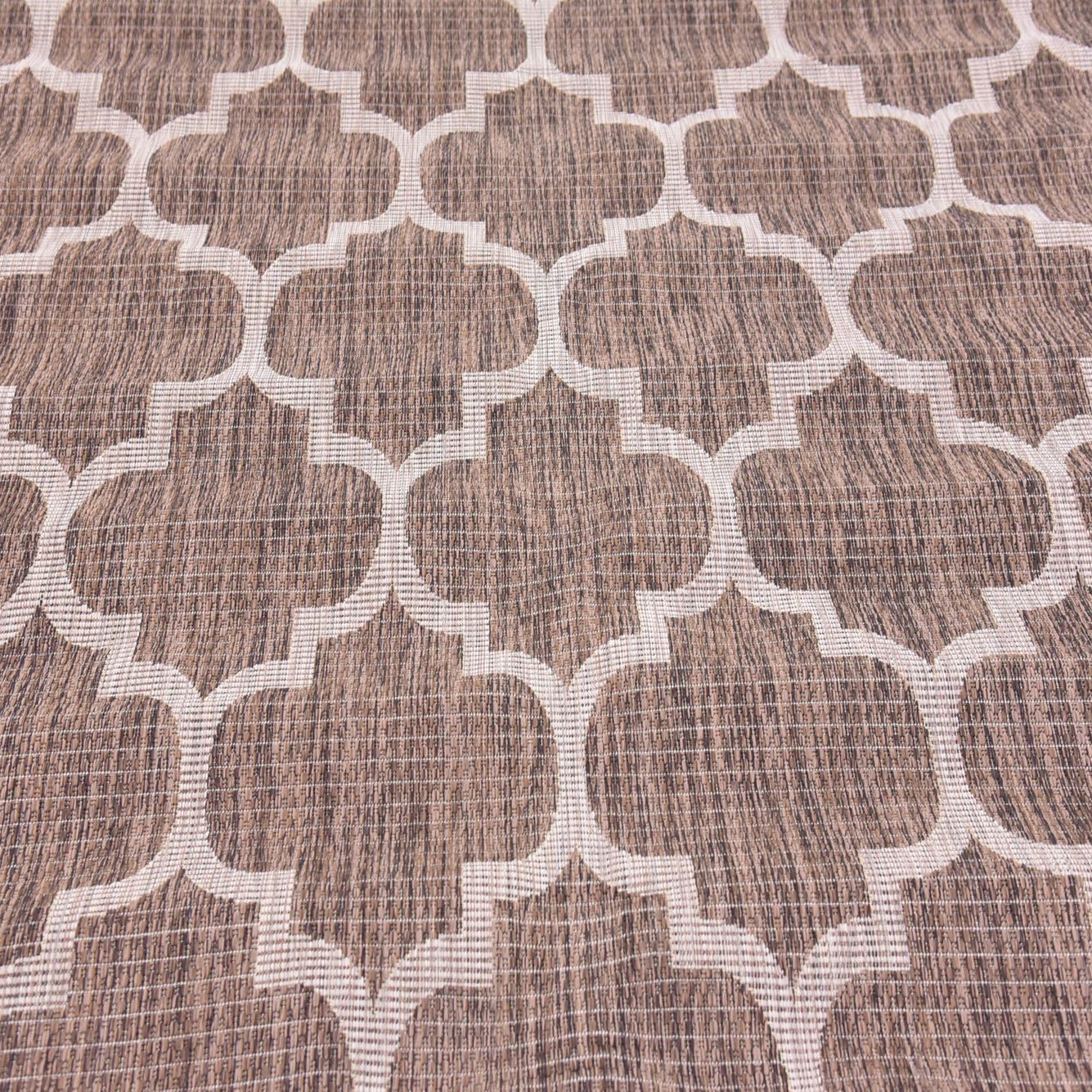 A crisp beige lattice of Moroccan-inspired quatrefoils crosses a rich brown ground, creating a balanced, geometric layout that reads both tailored and approachable. Machine made from 100% polypropylene, the rug has a low-profile woven texture you can feel underfoot — a tightly constructed, slightly coarse weave that lays flat and showcases the pattern with clarity. The brown background has a subtly heathered look that adds visual depth while the beige lines provide clean contrast.