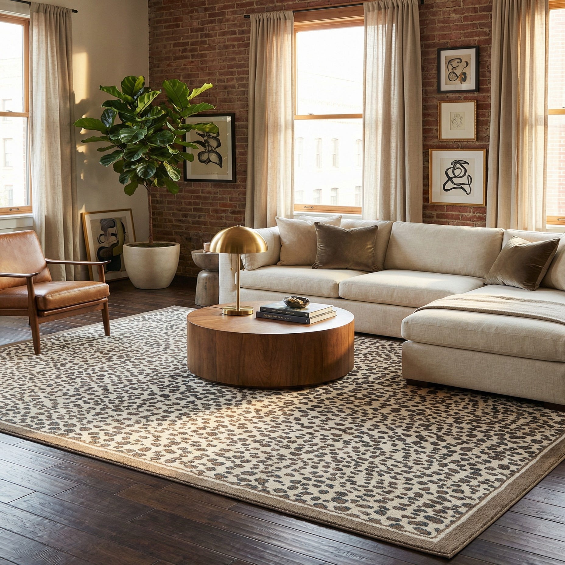 Machine-made from 100% polypropylene, this rug presents a dense, allover spotted pattern in brown, gray, and ivory. A warm brown ground frames the design while irregular ivory spots with gray accents create a lively, animal-inspired motif that balances organic movement with a modern sensibility. The look works well in transitional and contemporary settings where a subtle statement is desired.