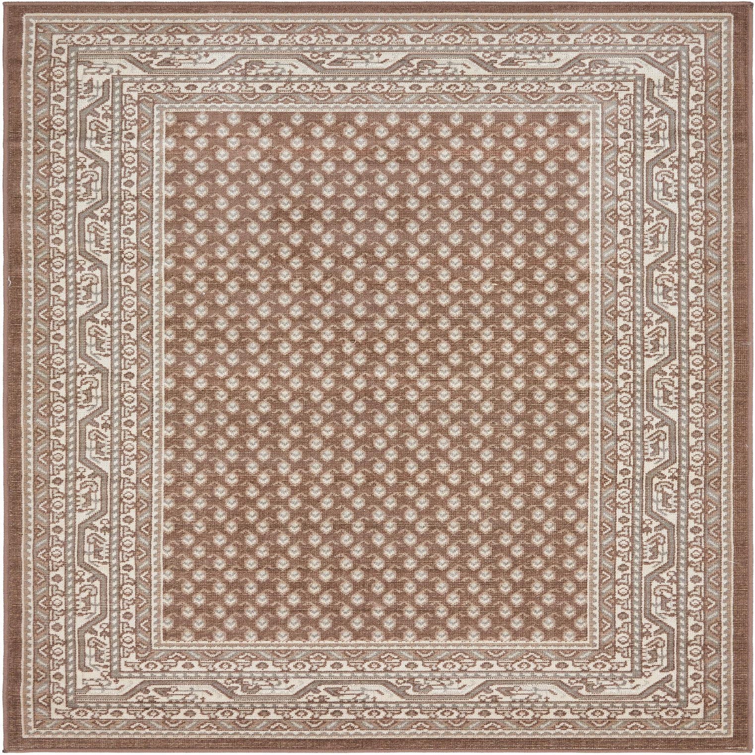 A warm brown field anchors this rug, patterned with a dense repeat of small beige medallion motifs that create a soft, rhythmic texture across the surface. Multiple decorative borders in beige and gray frame the center, combining geometric lines and stylized floral elements for a refined, traditional look with a contemporary clarity. Machine-made from 100% polypropylene, the rug has a low-profile pile and a tightly woven surface that feels smooth underfoot and shows the pattern with crisp definition.