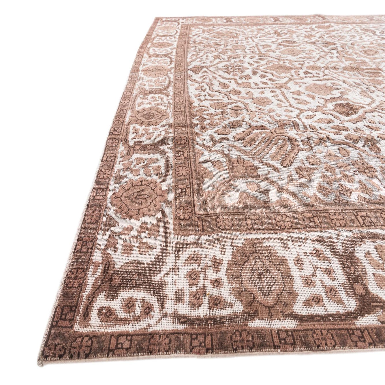 This Ultra Vintage collection rug presents a rich infusion of brown, ivory, and black hues, intertwined on a brown background, offering a palette that complements various color schemes. A cascade of traditional patterns forms an intricate, symmetrical arrangement, central medallion, and a well-defined border, capturing the essence of timeless design. The hand-knotted construction of 100% wool ensures a plush pile and a texture that invites touch, promising both durability and a luxurious underfoot experience.