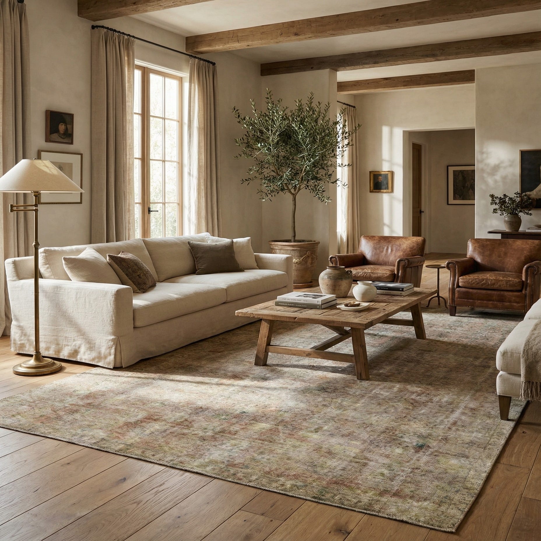 A 9x12 rectangular Ultra Vintage Persian rug in shades of brown and tan, featuring a faded medallion pattern.