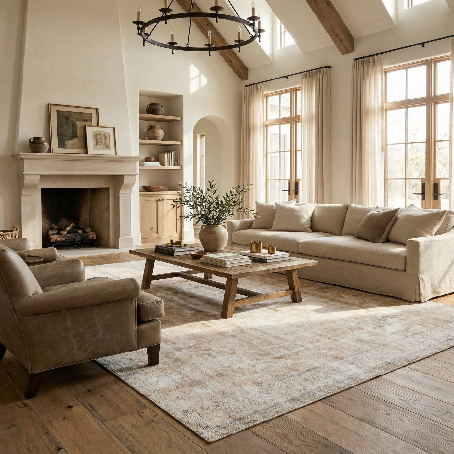 The rug's classic design and neutral hues make it a versatile piece for an array of interior styles. It would serve as a refined foundation in a living room, under a dining table, or within a spacious bedroom. This rug complements interiors that lean towards traditional, transitional, or even modern farmhouse aesthetics. The understated elegance of the piece allows it to integrate smoothly with both antique furnishings and contemporary pieces, bridging the gap between old and new with ease.