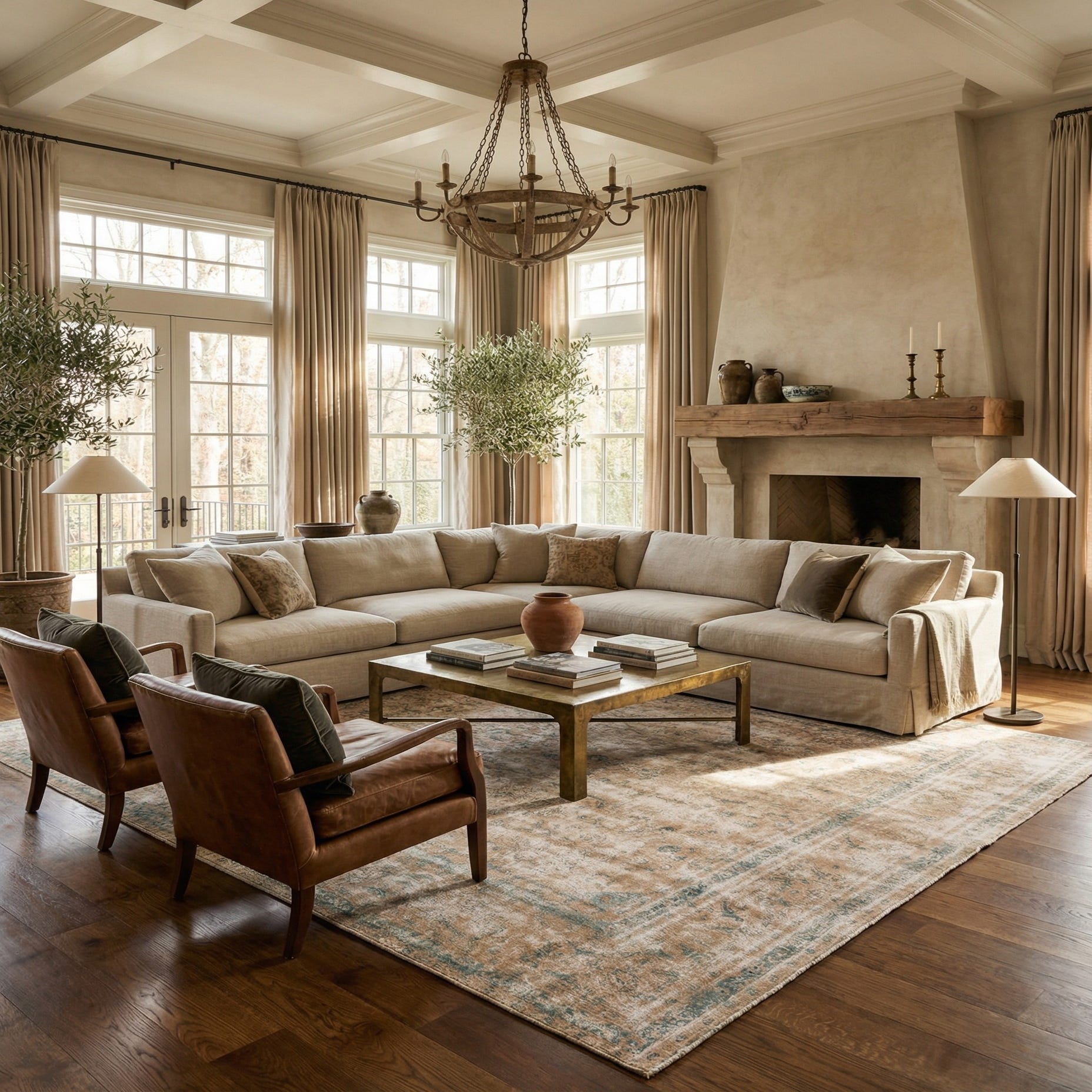 Primary color is Brown. Colors in this rug include: Brown, Beige, Ivory, Navy Blue.
