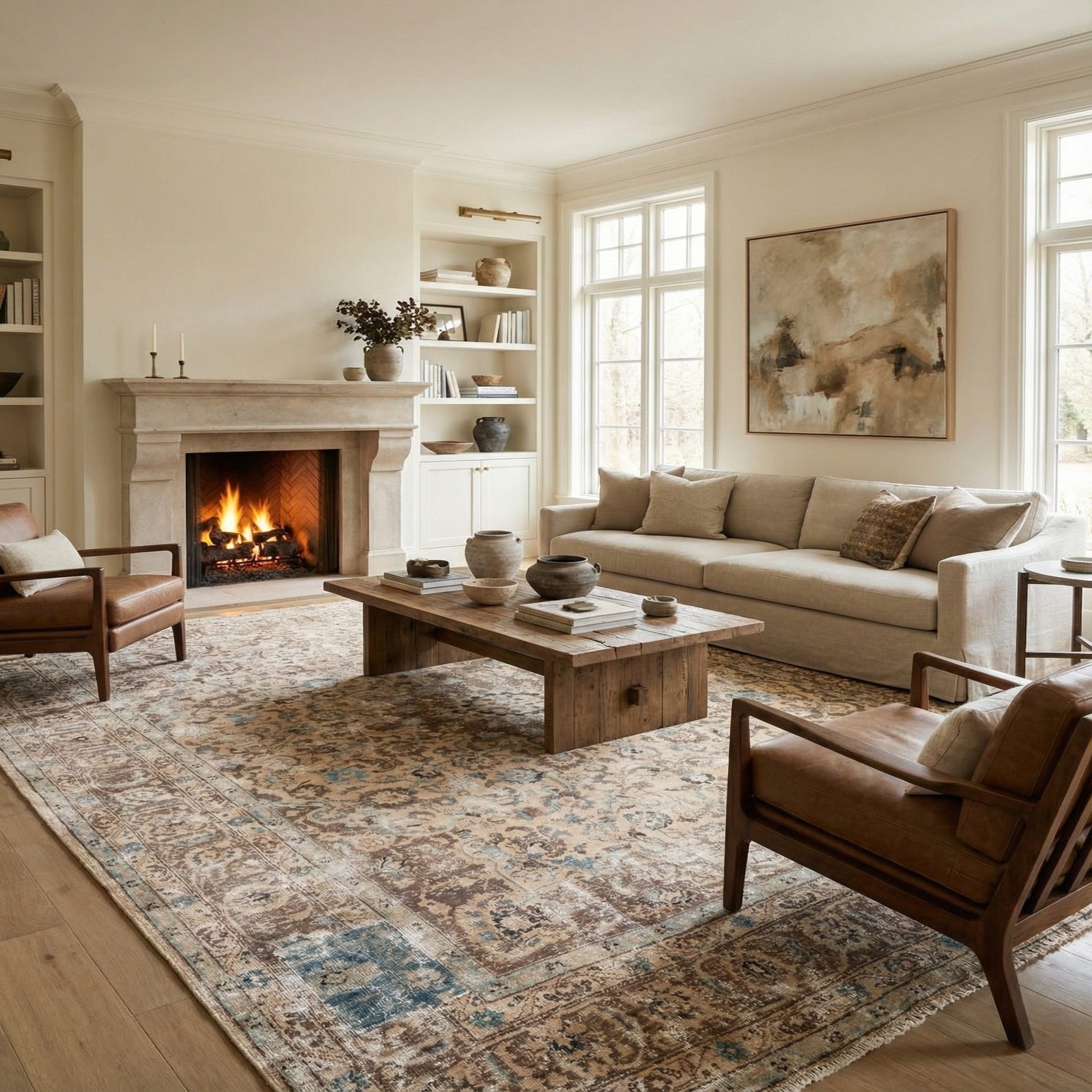 A 9x12 rectangular brown and tan Persian-style wool rug with a distressed medallion pattern.