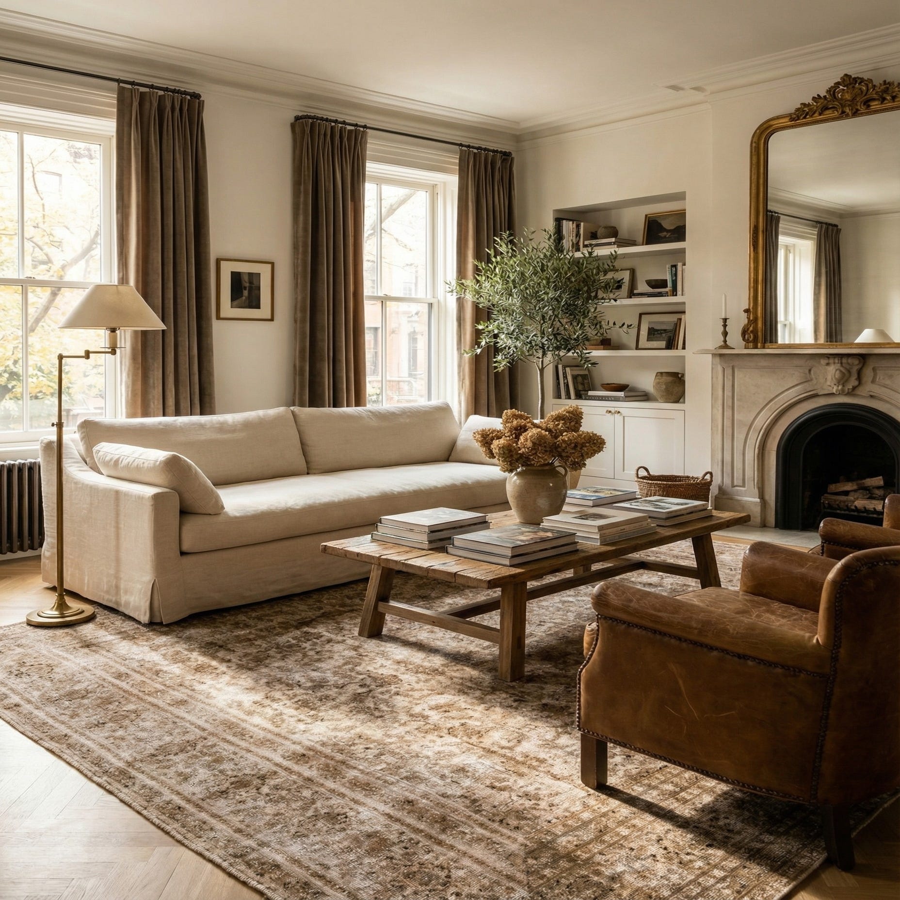This rug, given its neutral palette and timeless design, is versatile in application. It would complement a traditional setting with rich woods and antique furnishings, offer a grounding element in a more eclectic space, or serve as an understated backdrop in a contemporary minimalist environment. The pattern is intricate enough to add interest but subtle enough not to overpower a room, making it suitable for both casual and formal interiors.