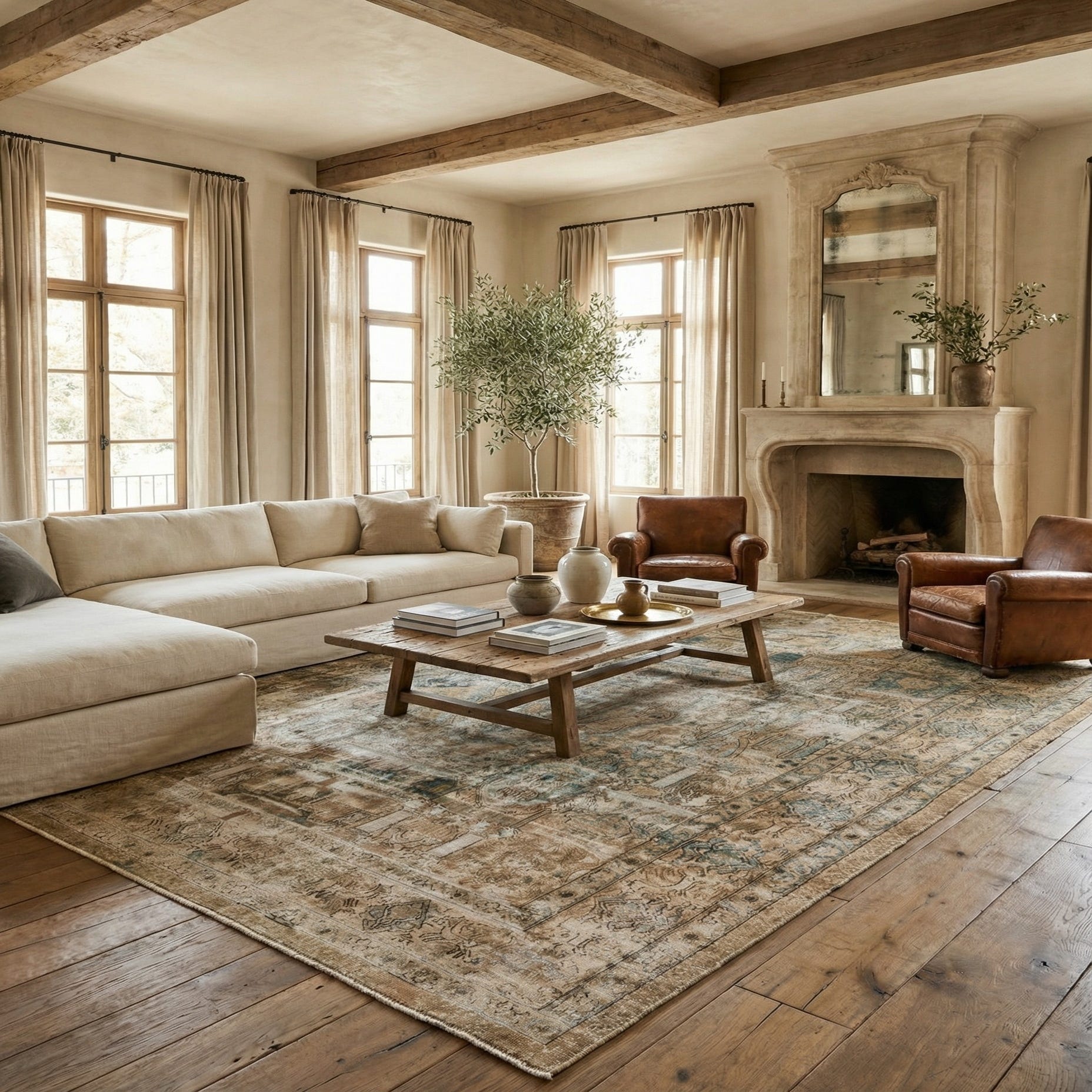 A 9x12 rectangular Ultra Vintage Persian rug in browns and tans with a distressed medallion pattern, suitable for a living room.