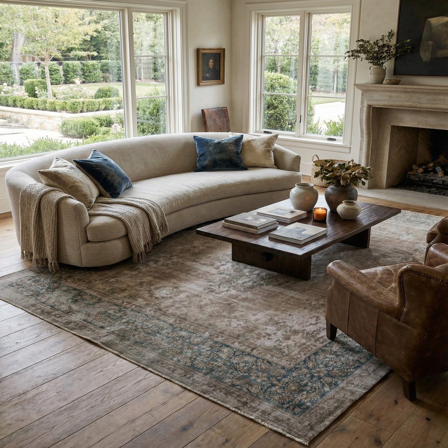 A 9x12 rectangular Ultra Vintage rug featuring a faded brown and tan Persian medallion pattern with a teal border, suitable for a living room.