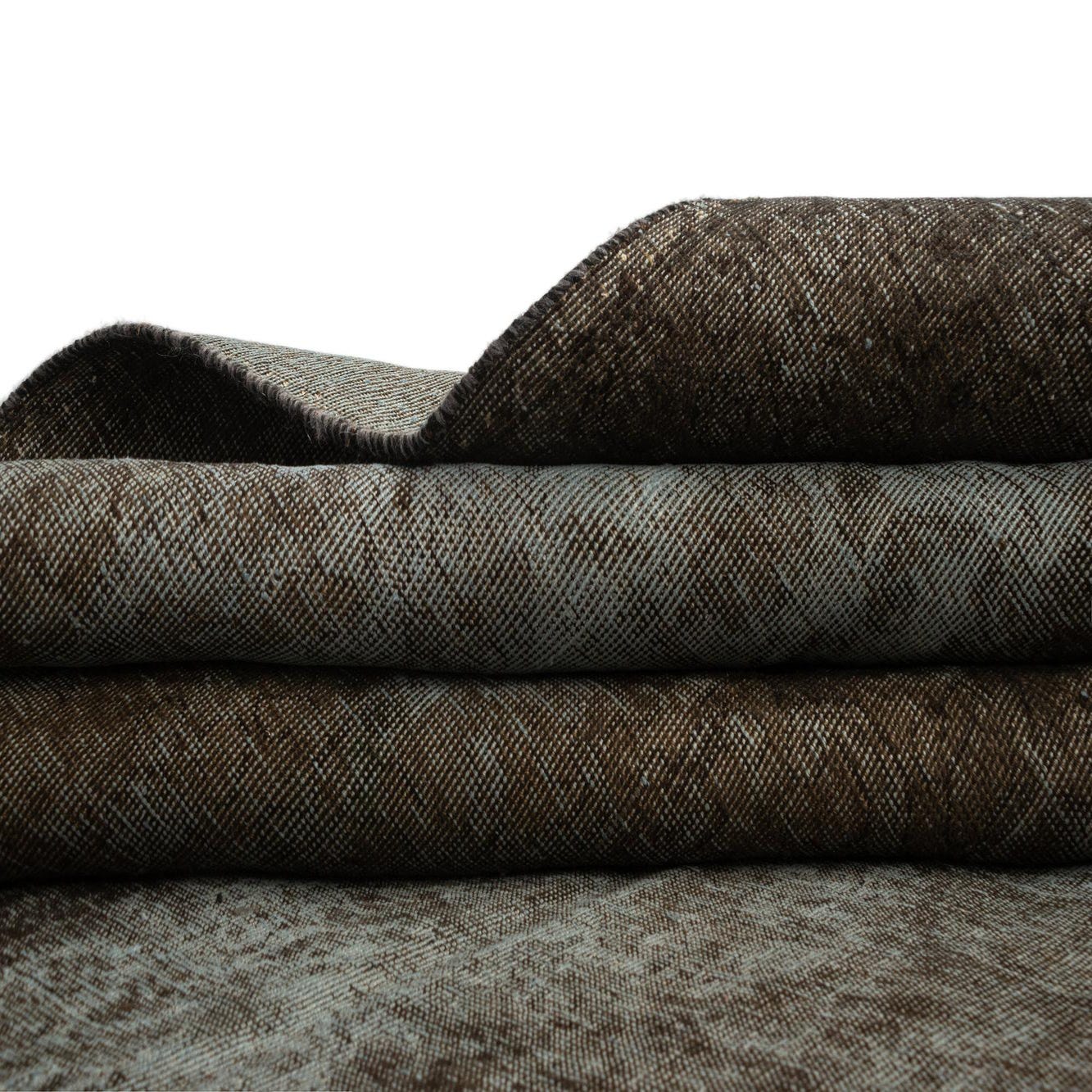 A 9x12 rectangular brown and tan Persian wool rug with a distressed vintage pattern, suitable for a living room.