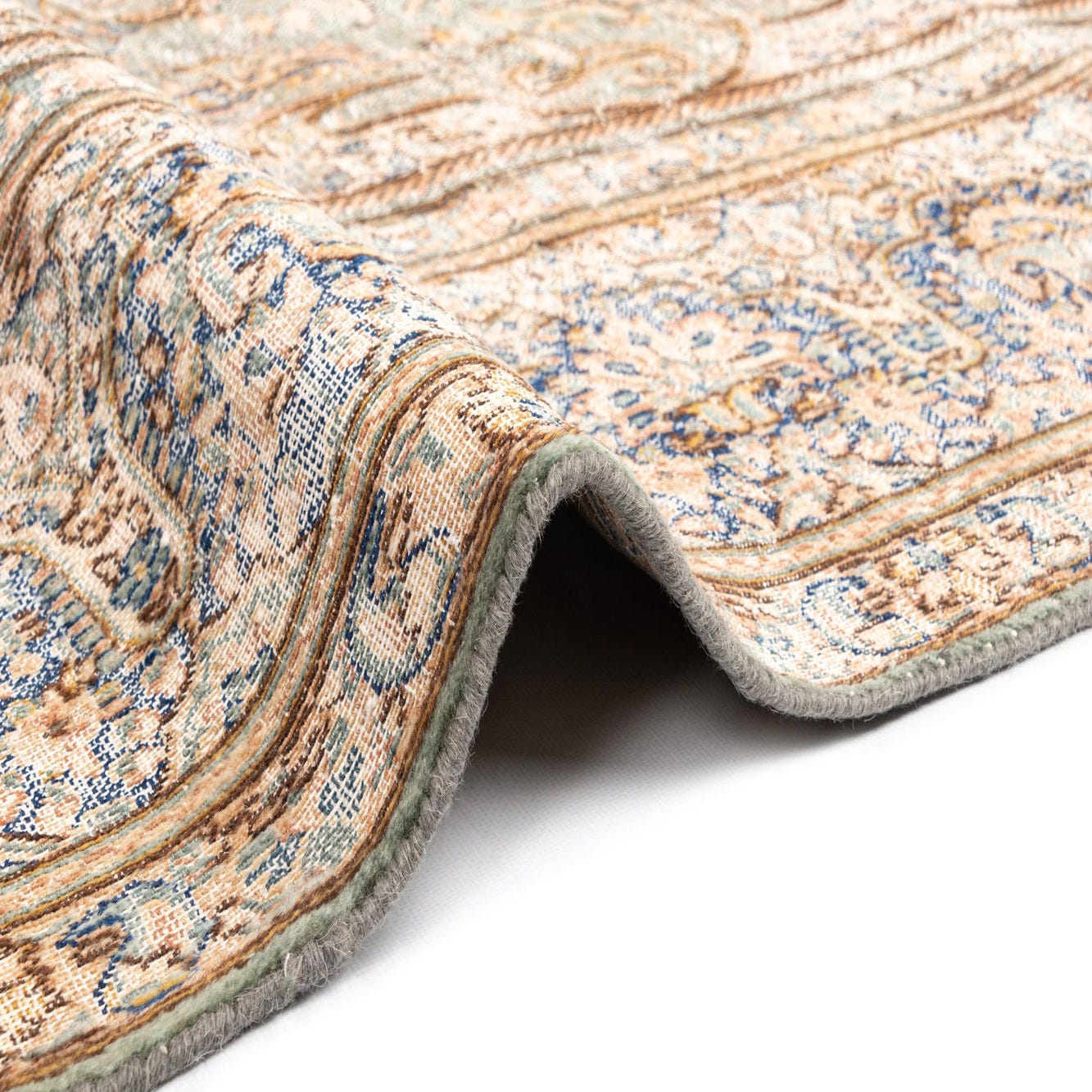 Primary color is Brown. Colors in this rug include: Brown, Brown, Beige, Blue, Green, Grey.